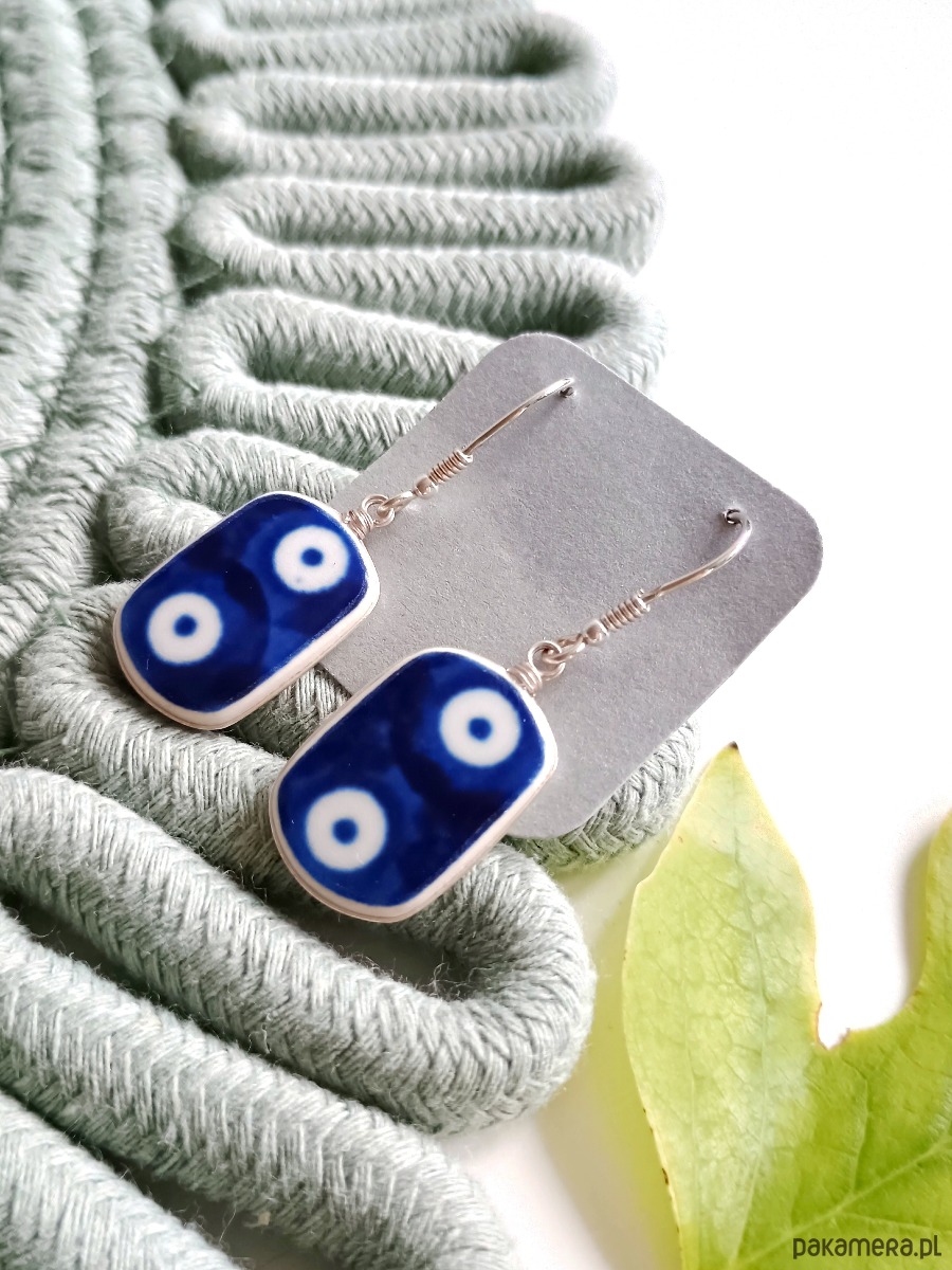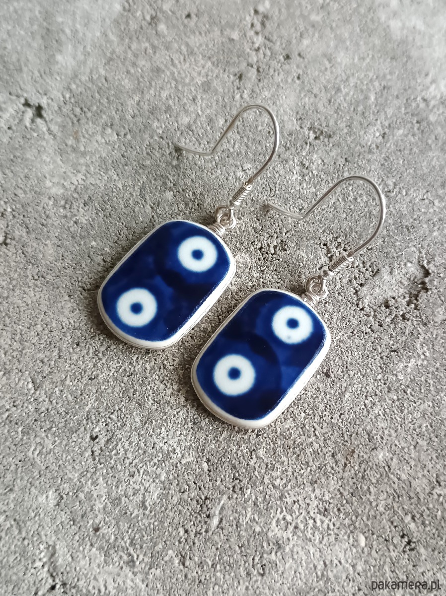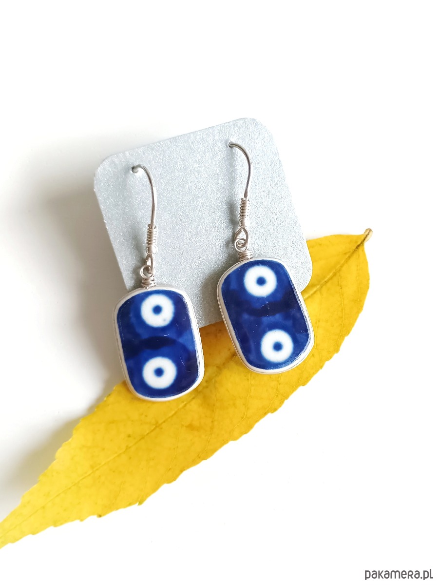 Ceramika w Bolesławcu i jego okolicach produkowana była już w XIV wieku. Do dziś najważniejszy surowiec, czyli glina wydobywany jest na miejscu, a tradycja wyrobu naczyń ceramicznych, rozwijana i kultywowana przez wieki - trwa. Bolesławiec jako marka, tworzona przez kilkadziesiąt różnych manufaktur, znana jest na całym świecie, a charakterystycznego wzoru w kobaltowe kropki nie sposób pomylić z żadnym innym. Co najbardziej wyróżnia Bolesławiec, to że szkliwo nakładane jest ręcznie, za pomocą stempelków z gąbki. Oto wiszące kolczyki, które wykonałam z fragmentów stłuczonego talerza, wykonanego właśnie w Bolesławcu (dekoracja nr 42). Kawałki stłuczki oszlifowałam w owalne kształty, oprawiłam w drucik i połączyłam ze srebrnymi biglami. Ceramikę zeszlifowałam również z grubości - jest cieńsza niż pierwotnie, dzięki czemu kolczyki nie są masywne. Brzegi i tył pokryłam lakierem, co sprawia, że nie brudzą się i nie chłoną wilgoci. Oprawa, sztyfty oraz bigle (zapięcia) wykonane są ze srebra próby 925 - wyrób jest antyalergiczny. Wymiary elementów ceramicznych: 14 x 21 mm. Waga jednego kolczyka: 2,1 g. Unikat - każdy z moich wyrobów występuje w jednym egzemplarzu. Upcykling - nie reprodukuję wykorzystywanych wzorów, niczego nie domalowuję - wykorzystuję wyłącznie oryginalne naczynia i motywy, które się na nich znajdują. Tym samym, stłuczce z odzysku nadaję nowe życie.