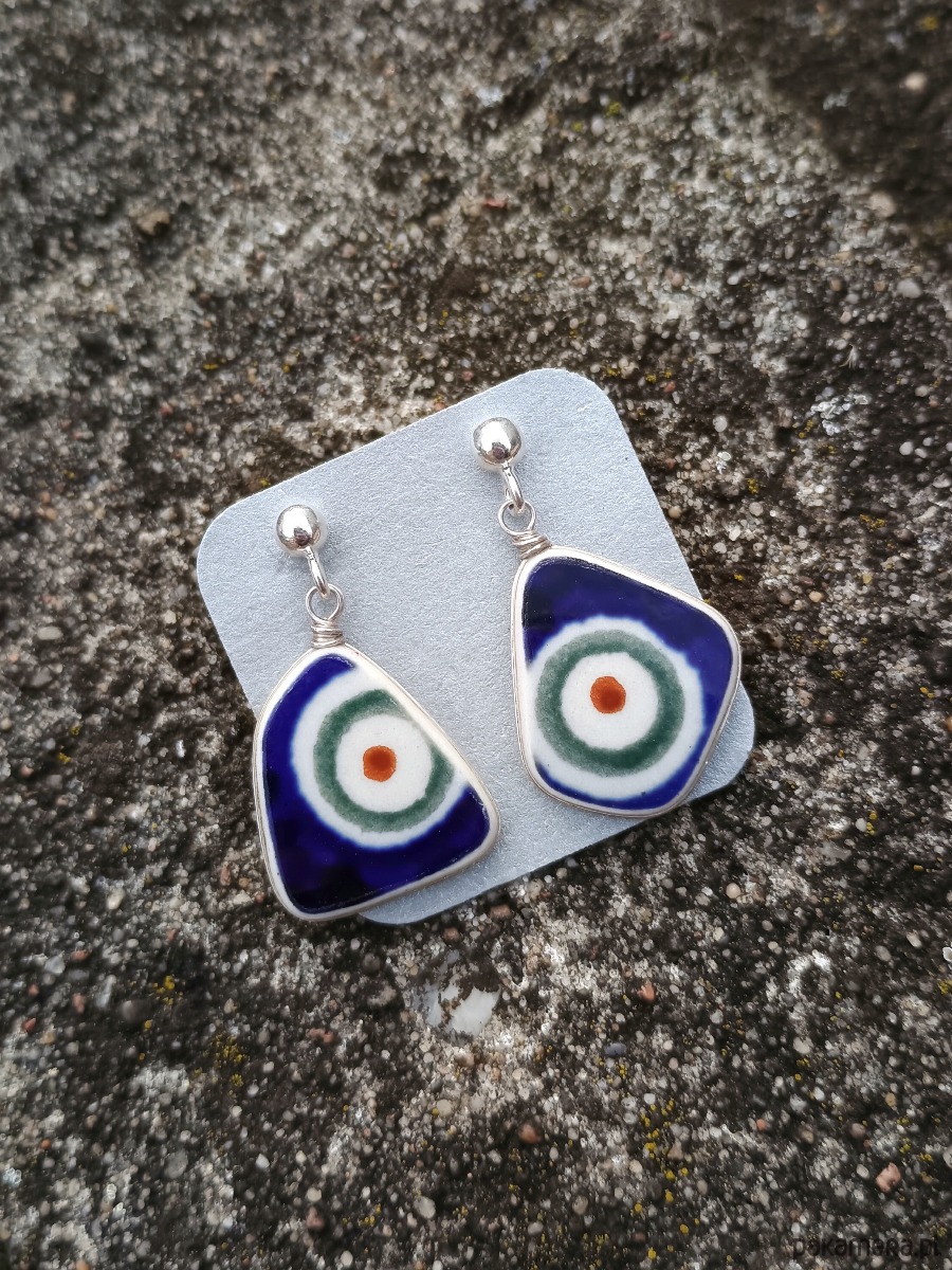 Ceramika w Bolesławcu i jego okolicach produkowana była już w XIV wieku. Do dziś najważniejszy surowiec, czyli glina wydobywany jest na miejscu, a tradycja wyrobu naczyń ceramicznych, rozwijana i kultywowana przez wieki - trwa. Bolesławiec jako marka, tworzona przez kilkadziesiąt różnych manufaktur, znana jest na całym świecie, a charakterystycznego wzoru w kobaltowe kropki nie sposób pomylić z żadnym innym. Co najbardziej wyróżnia Bolesławiec, to że szkliwo nakładane jest ręcznie, za pomocą stempelków z gąbki. Oto wiszące kolczyki, które wykonałam z fragmentów stłuczonej miseczki, wykonanej właśnie w Bolesławcu (dekoracja nr 8, pawie oko). Kawałki stłuczki oszlifowałam w nieregularne kształty, oprawiłam w drucik i połączyłam ze srebrnymi sztyftami. Ceramikę zeszlifowałam również z grubości - jest cieńsza niż pierwotnie, dzięki czemu kolczyki nie są masywne. Brzegi i tył pokryłam lakierem, co sprawia, że nie brudzą się i nie chłoną wilgoci. Oprawa, sztyfty oraz baranki (zapięcia) wykonane są ze srebra próby 925 - wyrób jest antyalergiczny. Wymiary elementów ceramicznych: 16 x 20 mm. Waga jednego kolczyka: 1,8 g. Unikat - każdy z moich wyrobów występuje w jednym egzemplarzu. Upcykling - nie reprodukuję wykorzystywanych wzorów, niczego nie domalowuję - wykorzystuję wyłącznie oryginalne naczynia i motywy, które się na nich znajdują. Tym samym, stłuczce z odzysku nadaję nowe życie.