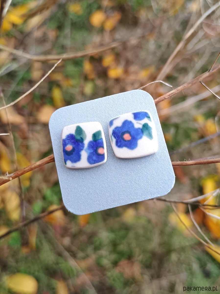 Ceramika w Bolesławcu i jego okolicach produkowana była już w XIV wieku. Do dziś najważniejszy surowiec, czyli glina wydobywany jest na miejscu, a tradycja wyrobu naczyń ceramicznych, rozwijana i kultywowana przez wieki - trwa. Bolesławiec jako marka, tworzona przez kilkadziesiąt różnych manufaktur, znana jest na całym świecie, a charakterystycznego wzoru w kobaltowe kropki nie sposób pomylić z żadnym innym. Co najbardziej wyróżnia Bolesławiec, to że szkliwo nakładane jest ręcznie, za pomocą stempelków  z gąbki. Oto duże kolczyki, które wykonałam z fragmentów stłuczonego talerza, wykonanego właśnie w Bolesławcu. Kawałki stłuczki oszlifowałam w kwadratowe kształty i połączyłam ze srebrnymi sztyftami. Ceramikę zeszlifowałam również z grubości - jest cieńsza niż pierwotnie, dzięki czemu kolczyki nie są masywne. Brzegi pokryłam lakierem, co sprawia, że nie brudzą się i nie chłoną wilgoci. Sztyfty oraz baranki (zapięcia) wykonane są ze srebra próby 925 - wyrób jest antyalergiczny. Wymiary elementów ceramicznych: 14 x 14 mm. Unikat - każdy z moich wyrobów występuje w jednym egzemplarzu. Upcykling - nie reprodukuję wykorzystywanych wzorów, niczego nie domalowuję - wykorzystuję wyłącznie oryginalne naczynia i motywy, które się na nich znajdują. Tym samym, stłuczce z odzysku nadaję nowe życie.
