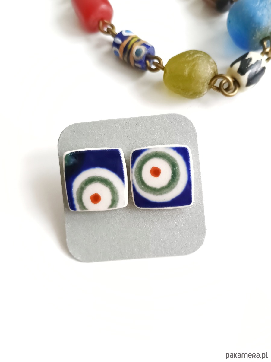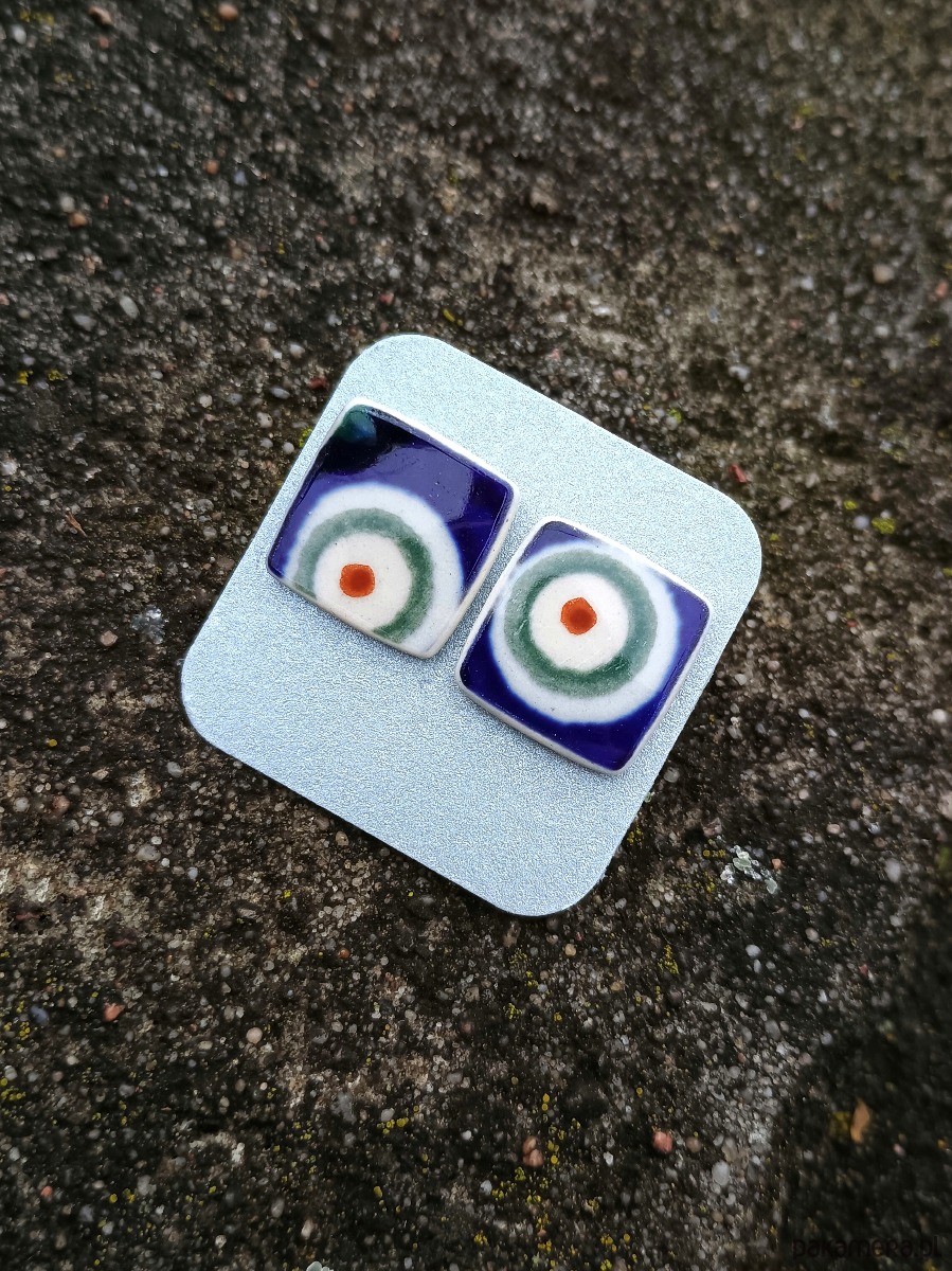 Ceramika w Bolesławcu i jego okolicach produkowana była już w XIV wieku. Do dziś najważniejszy surowiec, czyli glina wydobywany jest na miejscu, a tradycja wyrobu naczyń ceramicznych, rozwijana i kultywowana przez wieki - trwa. Bolesławiec jako marka, tworzona przez kilkadziesiąt różnych manufaktur, znana jest na całym świecie, a charakterystycznego wzoru w kobaltowe kropki nie sposób pomylić z żadnym innym. Co najbardziej wyróżnia Bolesławiec, to że szkliwo nakładane jest ręcznie, za pomocą stempelków z gąbki. Oto duże kolczyki, które wykonałam z fragmentów stłuczonego talerza, wykonanego właśnie w Bolesławcu (dekoracja nr 8 - "Pawie oko"). Kawałki stłuczki oszlifowałam w kwadratowe kształty i połączyłam ze srebrnymi sztyftami. Ceramikę zeszlifowałam również z grubości - jest cieńsza niż pierwotnie, dzięki czemu kolczyki nie są masywne. Brzegi pokryłam lakierem, co sprawia, że nie brudzą się i nie chłoną wilgoci. Sztyfty oraz baranki (zapięcia) wykonane są ze srebra próby 925 - wyrób jest antyalergiczny. Wymiary elementów ceramicznych: 15 x 15 mm. Unikat - każdy z moich wyrobów występuje w jednym egzemplarzu. Upcykling - nie reprodukuję wykorzystywanych wzorów, niczego nie domalowuję - wykorzystuję wyłącznie oryginalne naczynia i motywy, które się na nich znajdują. Tym samym, stłuczce z odzysku nadaję nowe życie.