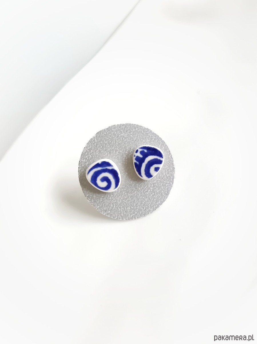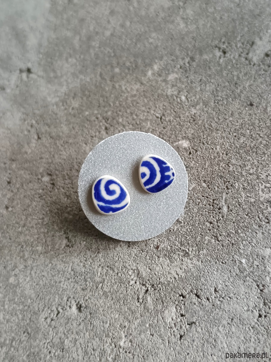 Ceramika w Bolesławcu i jego okolicach produkowana była już w XIV wieku. Do dziś najważniejszy surowiec, czyli glina wydobywany jest na miejscu, a tradycja wyrobu naczyń ceramicznych, rozwijana i kultywowana przez wieki - trwa. Bolesławiec jako marka, tworzona przez kilkadziesiąt różnych manufaktur, znana jest na całym świecie, a charakterystycznego wzoru w kobaltowe kropki nie sposób pomylić z żadnym innym. Co najbardziej wyróżnia Bolesławiec, to że szkliwo nakładane jest ręcznie, za pomocą stempelków z gąbki. Oto malutkie kolczyki, które wykonałam z fragmentów stłuczonego kubka, wykonanego właśnie w Bolesławcu. Kawałki stłuczki oszlifowałam w opływowe kształty i połączyłam ze srebrnymi sztyftami. Ceramikę zeszlifowałam również z grubości - jest cieńsza niż pierwotnie, dzięki czemu kolczyki nie są masywne. Brzegi i tył pokryłam lakierem, co sprawia, że nie brudzą się i nie chłoną wilgoci. Sztyfty oraz baranki (zapięcia) wykonane są ze srebra próby 925 - wyrób jest antyalergiczny. Wymiary elementów ceramicznych: 7 x 8 mm. Unikat - każdy z moich wyrobów występuje w jednym egzemplarzu. Upcykling - nie reprodukuję wykorzystywanych wzorów, niczego nie domalowuję - wykorzystuję wyłącznie oryginalne naczynia i motywy, które się na nich znajdują. Tym samym, stłuczce z odzysku nadaję nowe życie.