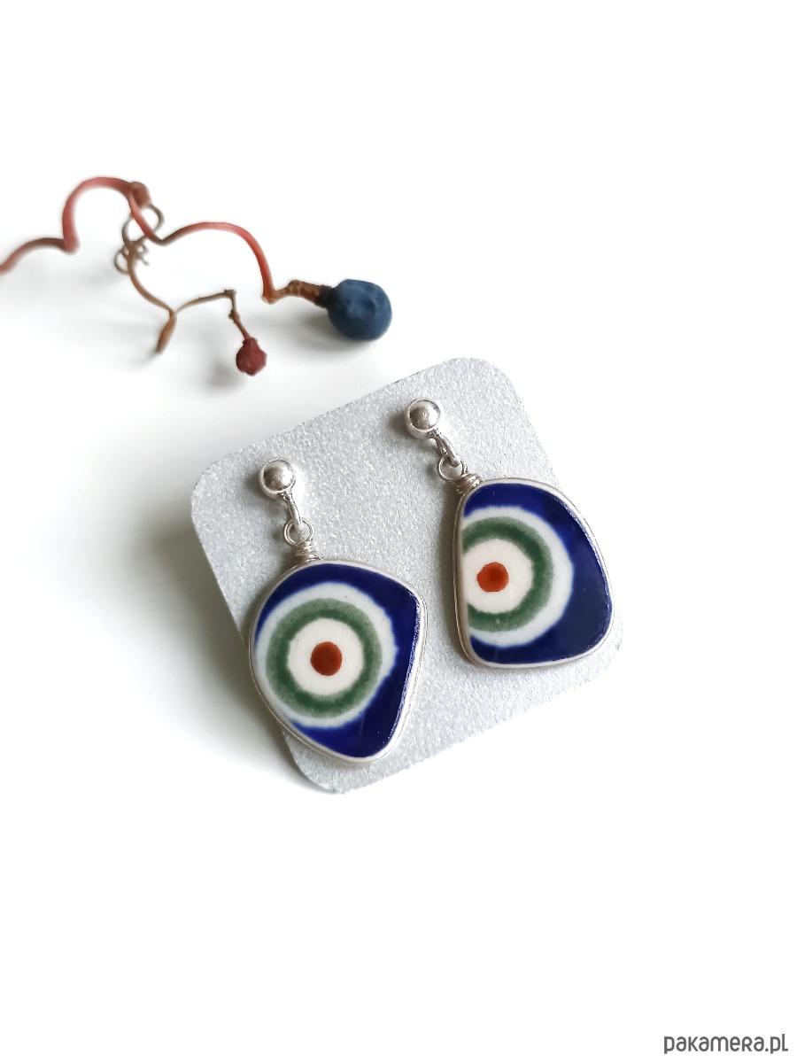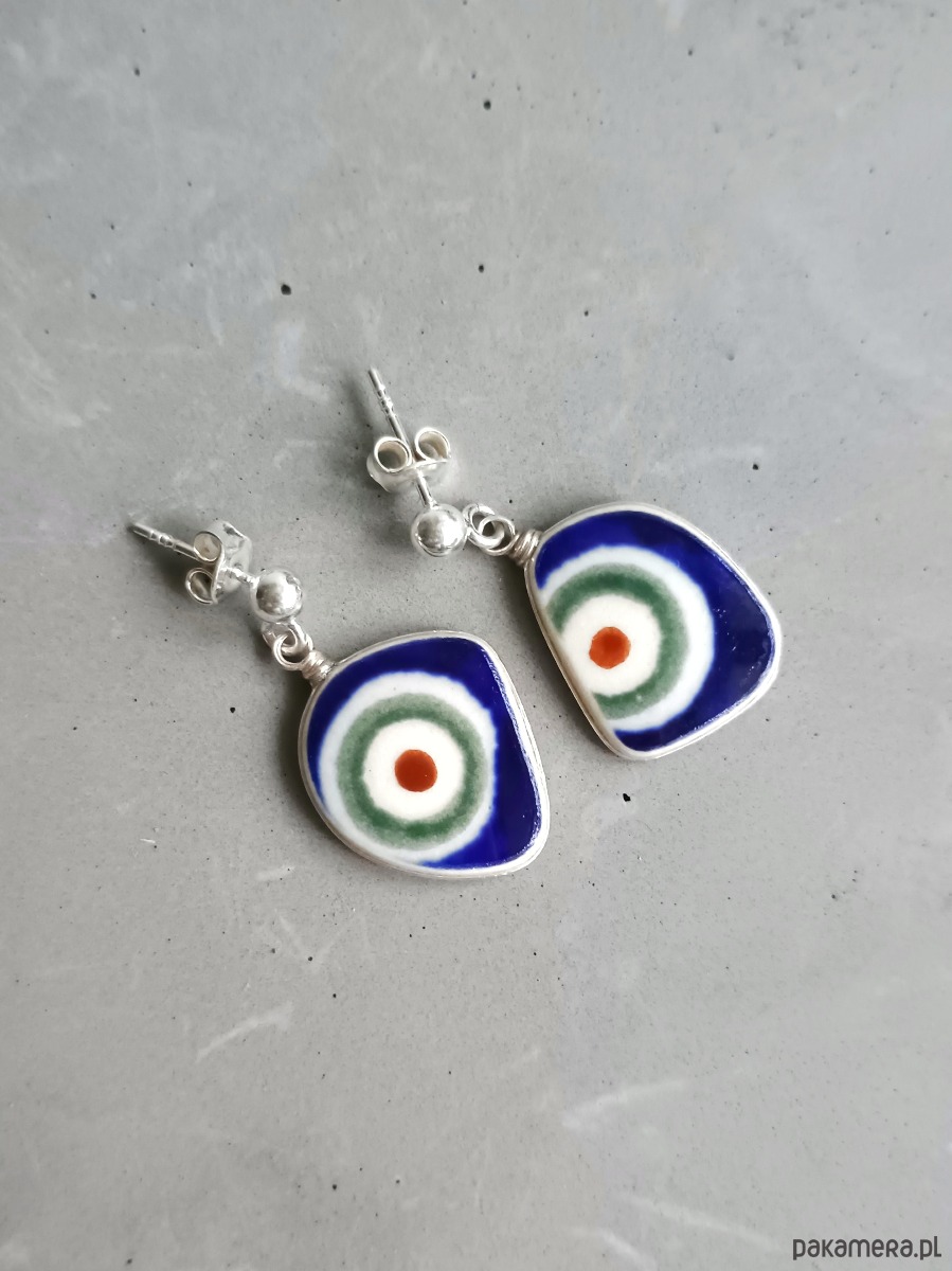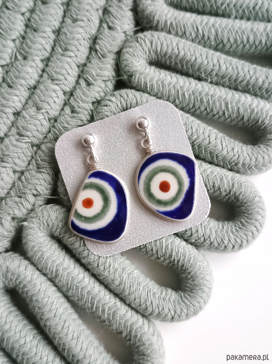 Ceramika w Bolesławcu i jego okolicach produkowana była już w XIV wieku. Do dziś najważniejszy surowiec, czyli glina wydobywany jest na miejscu, a tradycja wyrobu naczyń ceramicznych, rozwijana i kultywowana przez wieki - trwa. Bolesławiec jako marka, tworzona przez kilkadziesiąt różnych manufaktur, znana jest na całym świecie, a charakterystycznego wzoru w kobaltowe kropki nie sposób pomylić z żadnym innym. Co najbardziej wyróżnia Bolesławiec, to że szkliwo nakładane jest ręcznie, za pomocą stempelków z gąbki. Oto wiszące kolczyki, które wykonałam z fragmentów stłuczonej miseczki, wykonanej właśnie w Bolesławcu (dekoracja nr 8, pawie oko). Kawałki stłuczki oszlifowałam w nieregularne kształty, oprawiłam w drucik i połączyłam ze srebrnymi sztyftami. Ceramikę zeszlifowałam również z grubości - jest cieńsza niż pierwotnie, dzięki czemu kolczyki nie są masywne. Brzegi i tył pokryłam lakierem, co sprawia, że nie brudzą się i nie chłoną wilgoci. Oprawa, sztyfty oraz baranki (zapięcia) wykonane są ze srebra próby 925 - wyrób jest antyalergiczny. Wymiary elementów ceramicznych: 15 x 17 mm. Waga jednego kolczyka: 1,8 g. Unikat - każdy z moich wyrobów występuje w jednym egzemplarzu. Upcykling - nie reprodukuję wykorzystywanych wzorów, niczego nie domalowuję - wykorzystuję wyłącznie oryginalne naczynia i motywy, które się na nich znajdują. Tym samym, stłuczce z odzysku nadaję nowe życie.