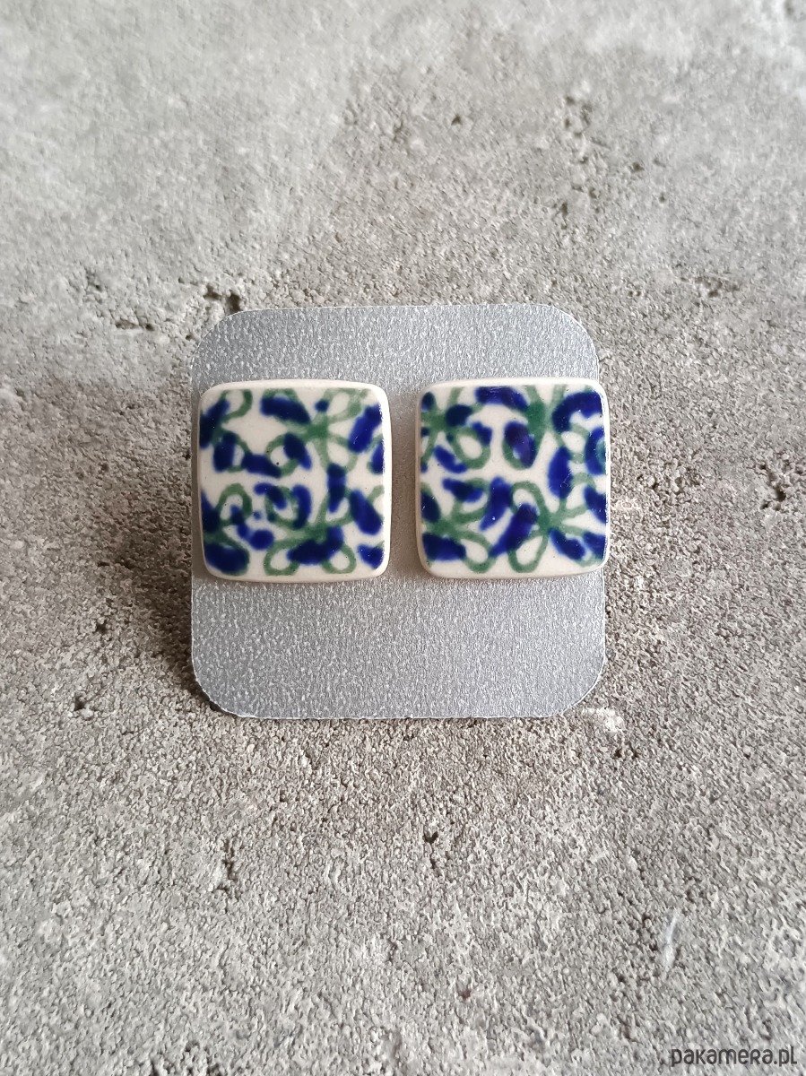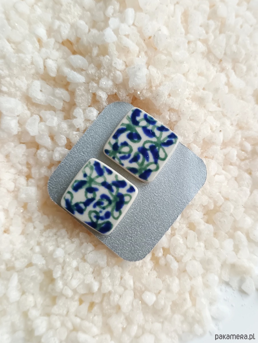 Ceramika w Bolesławcu i jego okolicach produkowana była już w XIV wieku. Do dziś najważniejszy surowiec, czyli glina wydobywany jest na miejscu, a tradycja wyrobu naczyń ceramicznych, rozwijana i kultywowana przez wieki - trwa. Bolesławiec jako marka, tworzona przez kilkadziesiąt różnych manufaktur, znana jest na całym świecie, a charakterystycznego wzoru w kobaltowe kropki nie sposób pomylić z żadnym innym. Co najbardziej wyróżnia Bolesławiec, to że szkliwo nakładane jest ręcznie, za pomocą stempelków z gąbki. Oto duże kolczyki, które wykonałam z fragmentów stłuczonego talerza, wykonanego właśnie w Bolesławcu. Kawałki stłuczki oszlifowałam w kwadratowe kształty i połączyłam ze srebrnymi sztyftami. Ceramikę zeszlifowałam również z grubości - jest cieńsza niż pierwotnie, dzięki czemu kolczyki nie są masywne. Brzegi pokryłam lakierem, co sprawia, że nie brudzą się i nie chłoną wilgoci. Sztyfty oraz baranki (zapięcia) wykonane są ze srebra próby 925 - wyrób jest antyalergiczny. Wymiary elementów ceramicznych: 16 x 16 mm. Unikat - każdy z moich wyrobów występuje w jednym egzemplarzu. Upcykling - nie reprodukuję wykorzystywanych wzorów, niczego nie domalowuję - wykorzystuję wyłącznie oryginalne naczynia i motywy, które się na nich znajdują. Tym samym, stłuczce z odzysku nadaję nowe życie.