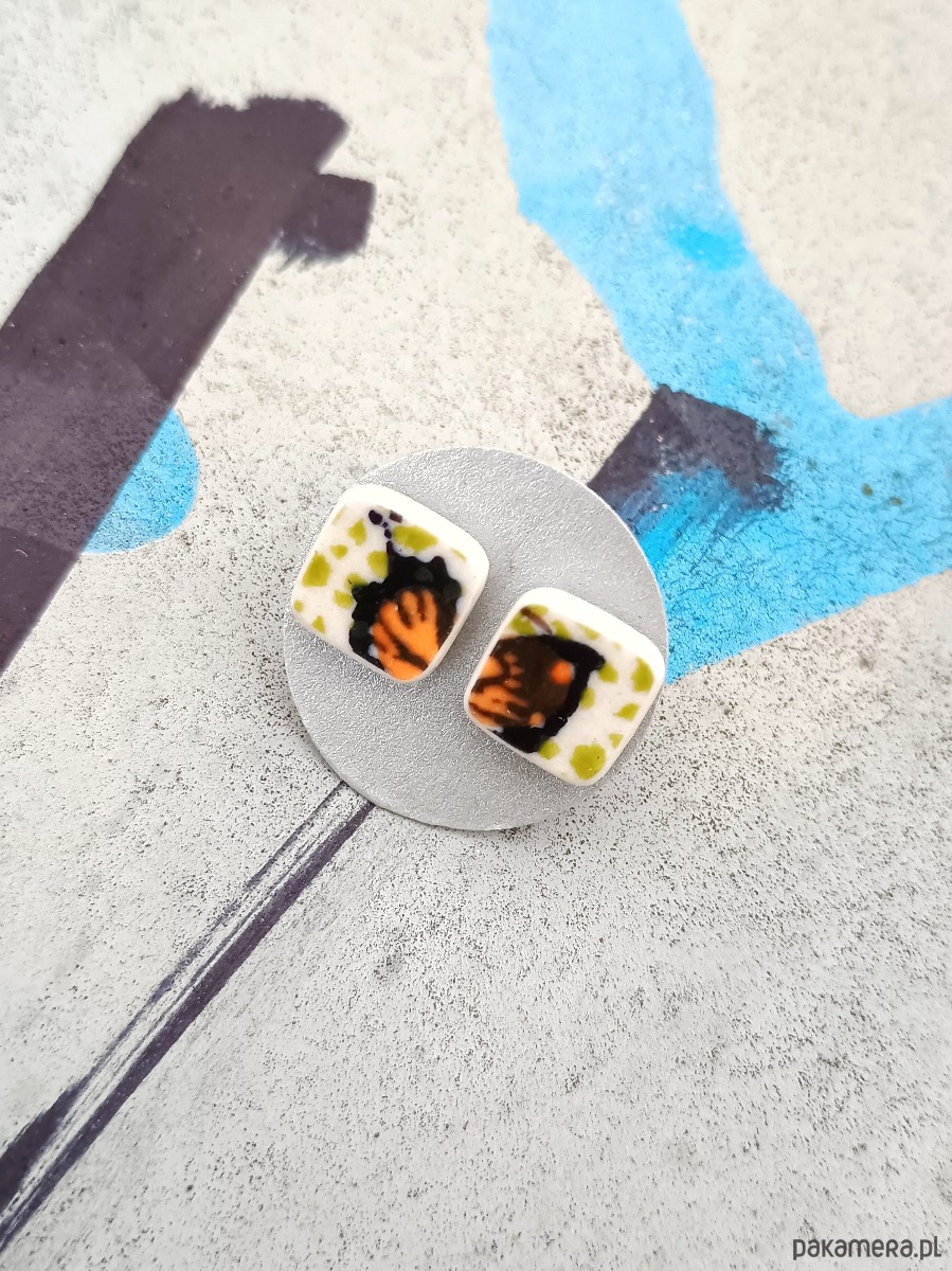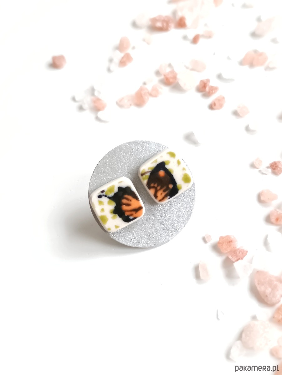Ceramika w Bolesławcu i jego okolicach produkowana była już w XIV wieku. Do dziś najważniejszy surowiec, czyli glina wydobywany jest na miejscu, a tradycja wyrobu naczyń ceramicznych, rozwijana i kultywowana przez wieki - trwa. Bolesławiec jako marka, tworzona przez kilkadziesiąt różnych manufaktur, znana jest na całym świecie, a charakterystycznego wzoru w kobaltowe kropki nie sposób pomylić z żadnym innym. Co najbardziej wyróżnia Bolesławiec, to że szkliwo nakładane jest ręcznie, za pomocą stempelków z gąbki. Oto małe kolczyki, które wykonałam z fragmentów stłuczonego talerza, wykonanego właśnie w Bolesławcu. Kawałki stłuczki oszlifowałam w kwadratowe kształty i połączyłam ze srebrnymi sztyftami. Ceramikę zeszlifowałam również z grubości - jest cieńsza niż pierwotnie, dzięki czemu kolczyki nie są masywne. Brzegi pokryłam lakierem, co sprawia, że nie brudzą się i nie chłoną wilgoci. Sztyfty oraz baranki (zapięcia) wykonane są ze srebra próby 925 - wyrób jest antyalergiczny. Wymiary elementów ceramicznych: 9 x 9 mm. Unikat - każdy z moich wyrobów występuje w jednym egzemplarzu. Upcykling - nie reprodukuję wykorzystywanych wzorów, niczego nie domalowuję - wykorzystuję wyłącznie oryginalne naczynia i motywy, które się na nich znajdują. Tym samym, stłuczce z odzysku nadaję nowe życie.