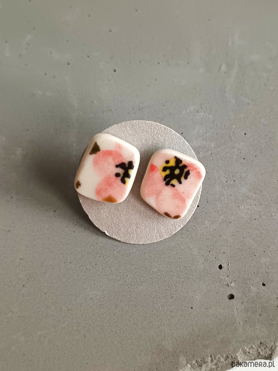 Ceramika w Bolesławcu i jego okolicach produkowana była już w XIV wieku. Do dziś najważniejszy surowiec, czyli glina wydobywany jest na miejscu, a tradycja wyrobu naczyń ceramicznych, rozwijana i kultywowana przez wieki - trwa. Bolesławiec jako marka, tworzona przez kilkadziesiąt różnych manufaktur, znana jest na całym świecie, a charakterystycznego wzoru w kobaltowe kropki nie sposób pomylić z żadnym innym. Co najbardziej wyróżnia Bolesławiec, to że szkliwo nakładane jest ręcznie, za pomocą stempelków z gąbki. Oto nieduże kolczyki, które wykonałam z fragmentów stłuczonej filiżanki, wykonanej właśnie w Bolesławcu. Kawałki stłuczki oszlifowałam w prostokątne kształty i połączyłam ze srebrnymi sztyftami. Ceramikę zeszlifowałam również z grubości - jest cieńsza niż pierwotnie, dzięki czemu kolczyki nie są masywne. Brzegi pokryłam lakierem, co sprawia, że nie brudzą się i nie chłoną wilgoci. Sztyfty oraz baranki (zapięcia) wykonane są ze srebra próby 925 - wyrób jest antyalergiczny. Wymiary elementów ceramicznych: 10 x 11 mm. Unikat - każdy z moich wyrobów występuje w jednym egzemplarzu. Upcykling - nie reprodukuję wykorzystywanych wzorów, niczego nie domalowuję - wykorzystuję wyłącznie oryginalne naczynia i motywy, które się na nich znajdują. Tym samym, stłuczce z odzysku nadaję nowe życie.