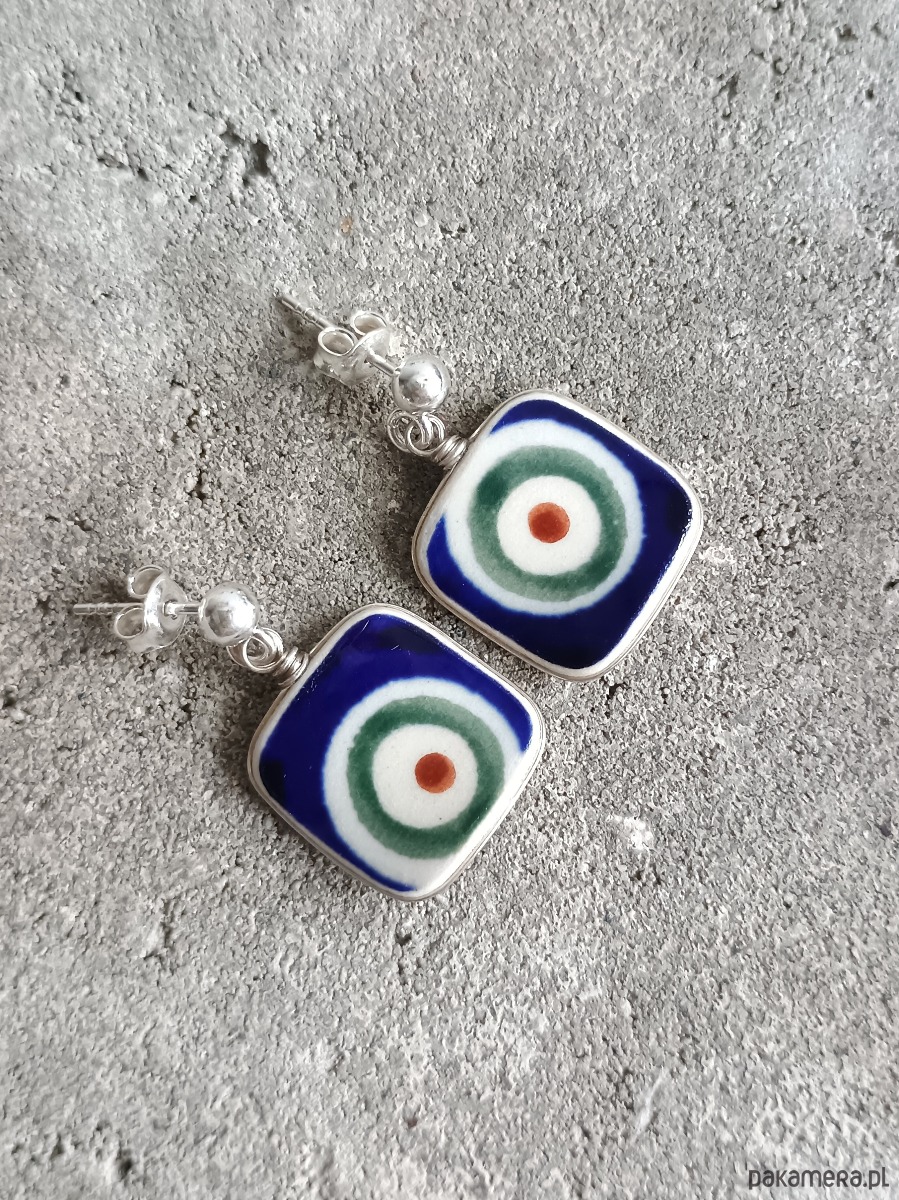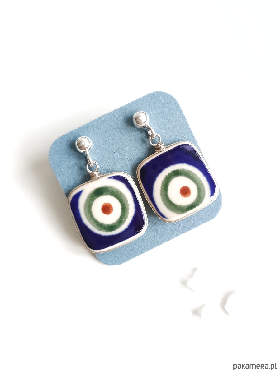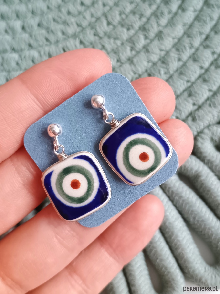 Ceramika w Bolesławcu i jego okolicach produkowana była już w XIV wieku. Do dziś najważniejszy surowiec, czyli glina wydobywany jest na miejscu, a tradycja wyrobu naczyń ceramicznych, rozwijana i kultywowana przez wieki - trwa. Bolesławiec jako marka, tworzona przez kilkadziesiąt różnych manufaktur, znana jest na całym świecie, a charakterystycznego wzoru w kobaltowe kropki nie sposób pomylić z żadnym innym. Co najbardziej wyróżnia Bolesławiec, to że szkliwo nakładane jest ręcznie, za pomocą stempelków z gąbki. Oto wiszące kolczyki, które wykonałam z fragmentów stłuczonego talerza, wykonanego właśnie w Bolesławcu (dekoracja nr 8, pawie oko). Kawałki stłuczki oszlifowałam w kwadratowe kształty, oprawiłam w drucik i połączyłam ze srebrnymi sztyftami. Ceramikę zeszlifowałam również z grubości - jest cieńsza niż pierwotnie, dzięki czemu kolczyki nie są masywne. Brzegi i tył pokryłam lakierem, co sprawia, że nie brudzą się i nie chłoną wilgoci. Oprawa, sztyfty oraz baranki (zapięcia) wykonane są ze srebra próby 925 - wyrób jest antyalergiczny. Wymiary elementów ceramicznych: 16 x 16 mm. Waga jednego kolczyka: 1,9 g. Unikat - każdy z moich wyrobów występuje w jednym egzemplarzu. Upcykling - nie reprodukuję wykorzystywanych wzorów, niczego nie domalowuję - wykorzystuję wyłącznie oryginalne naczynia i motywy, które się na nich znajdują. Tym samym, stłuczce z odzysku nadaję nowe życie.