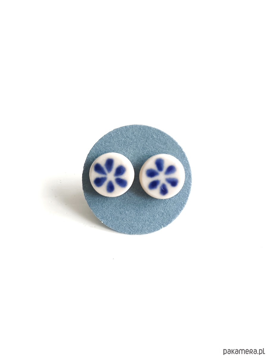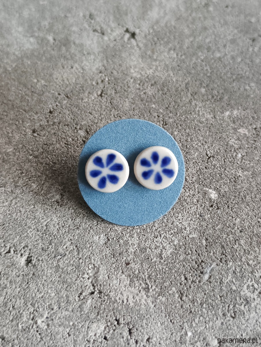 Ceramika w Bolesławcu i jego okolicach produkowana była już w XIV wieku. Do dziś najważniejszy surowiec, czyli glina wydobywany jest na miejscu, a tradycja wyrobu naczyń ceramicznych, rozwijana i kultywowana przez wieki - trwa. Bolesławiec jako marka, tworzona przez kilkadziesiąt różnych manufaktur, znana jest na całym świecie, a charakterystycznego wzoru w kobaltowe kropki nie sposób pomylić z żadnym innym. Co najbardziej wyróżnia Bolesławiec, to że szkliwo nakładane jest ręcznie, za pomocą stempelków z gąbki. Oto malutkie kolczyki, które wykonałam z fragmentów stłuczonego kubka, wykonanego właśnie w Bolesławcu. Kawałki stłuczki oszlifowałam w okrągłe kształty i połączyłam ze srebrnymi sztyftami. Ceramikę zeszlifowałam również z grubości - jest cieńsza niż pierwotnie, dzięki czemu kolczyki nie są masywne. Brzegi i tył pokryłam lakierem, co sprawia, że nie brudzą się i nie chłoną wilgoci. Sztyfty oraz baranki (zapięcia) wykonane są ze srebra próby 925 - wyrób jest antyalergiczny. Średnica elementów ceramicznych: 9 mm. Unikat - każdy z moich wyrobów występuje w jednym egzemplarzu. Upcykling - nie reprodukuję wykorzystywanych wzorów, niczego nie domalowuję - wykorzystuję wyłącznie oryginalne naczynia i motywy, które się na nich znajdują. Tym samym, stłuczce z odzysku nadaję nowe życie.