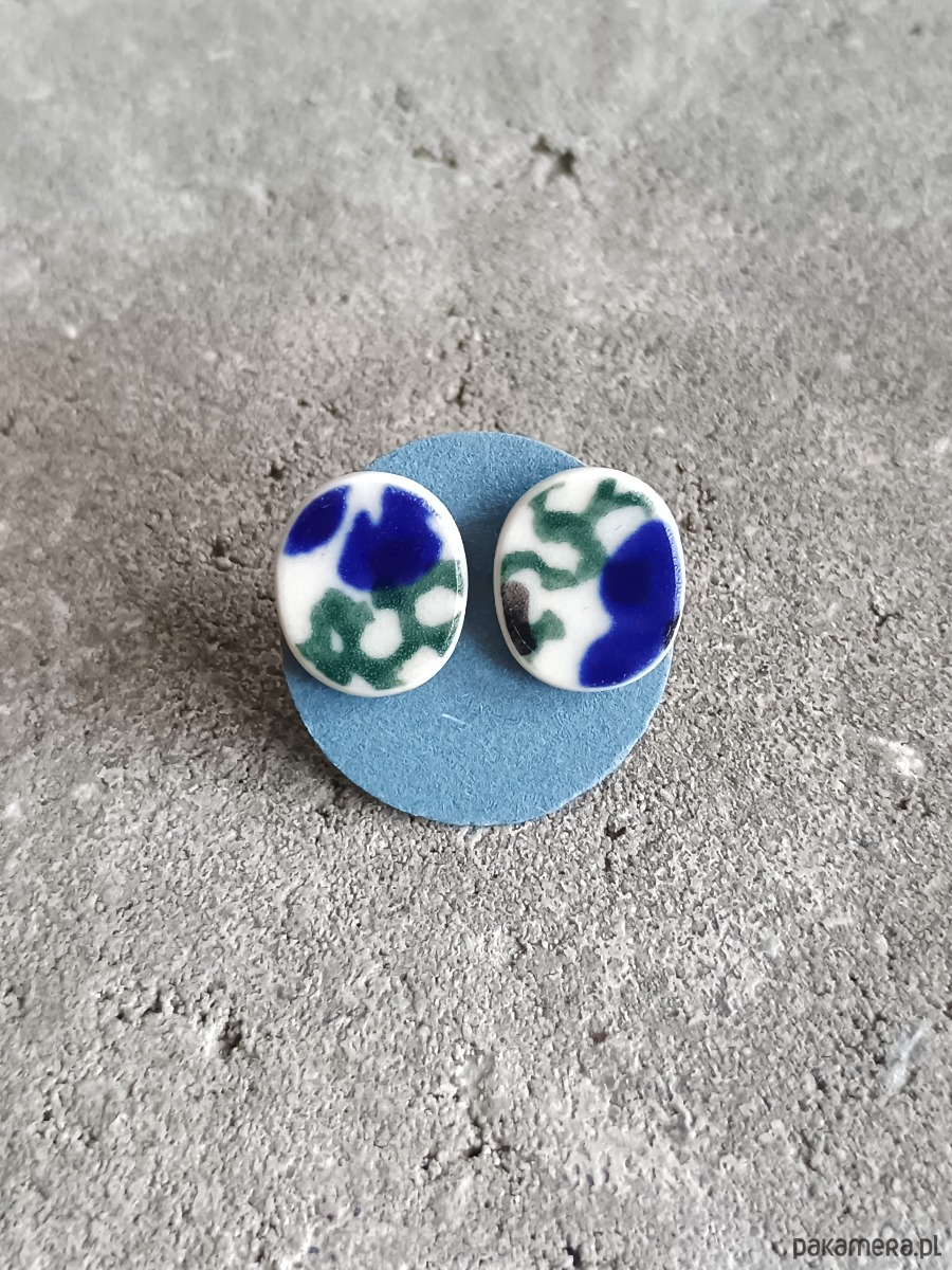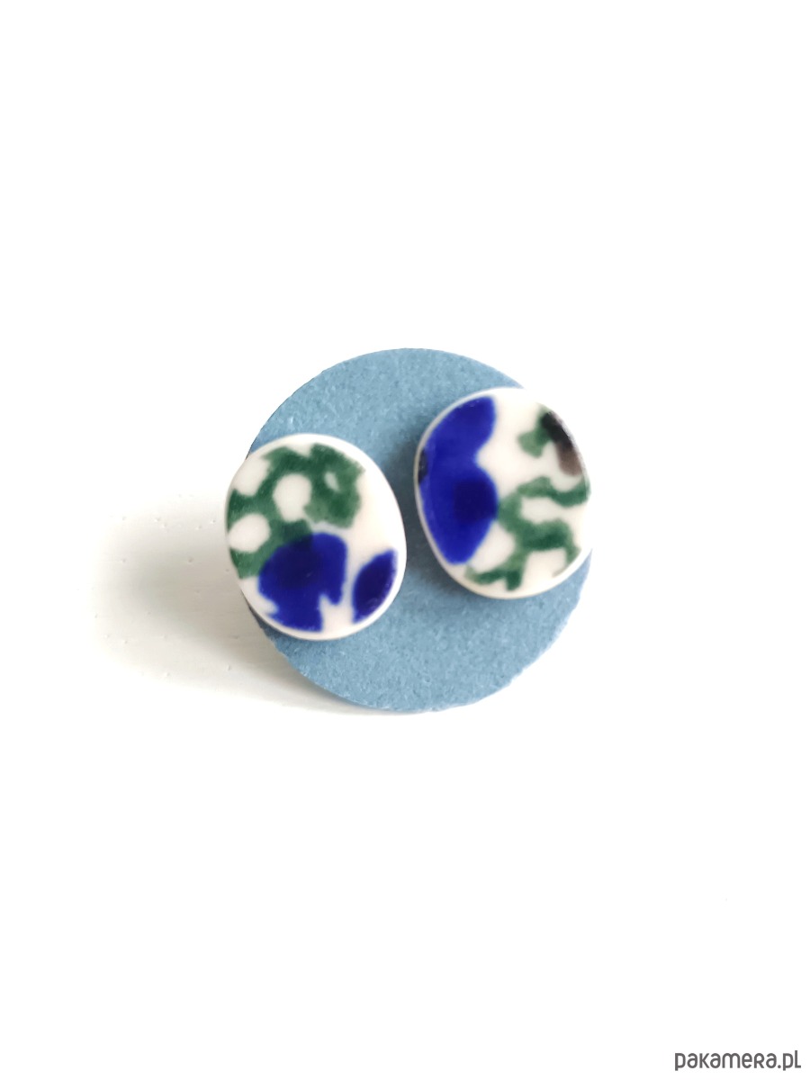 Ceramika w Bolesławcu i jego okolicach produkowana była już w XIV wieku. Do dziś najważniejszy surowiec, czyli glina wydobywany jest na miejscu, a tradycja wyrobu naczyń ceramicznych, rozwijana i kultywowana przez wieki - trwa. Bolesławiec jako marka, tworzona przez kilkadziesiąt różnych manufaktur, znana jest na całym świecie, a charakterystycznego wzoru w kobaltowe kropki nie sposób pomylić z żadnym innym. Co najbardziej wyróżnia Bolesławiec, to że szkliwo nakładane jest ręcznie, za pomocą stempelków z gąbki. Oto nieduże kolczyki, które wykonałam z fragmentów stłuczonego kubka, wykonanego właśnie w Bolesławcu. Kawałki stłuczki oszlifowałam w owalne kształty i połączyłam ze srebrnymi sztyftami. Ceramikę zeszlifowałam również z grubości - jest cieńsza niż pierwotnie, dzięki czemu kolczyki nie są masywne. Brzegi i tył pokryłam lakierem, co sprawia, że nie brudzą się i nie chłoną wilgoci. Sztyfty oraz baranki (zapięcia) wykonane są ze srebra próby 925 - wyrób jest antyalergiczny. Wymiary elementów ceramicznych: 11 x 12 mm. Unikat - każdy z moich wyrobów występuje w jednym egzemplarzu. Upcykling - nie reprodukuję wykorzystywanych wzorów, niczego nie domalowuję - wykorzystuję wyłącznie oryginalne naczynia i motywy, które się na nich znajdują. Tym samym, stłuczce z odzysku nadaję nowe życie.