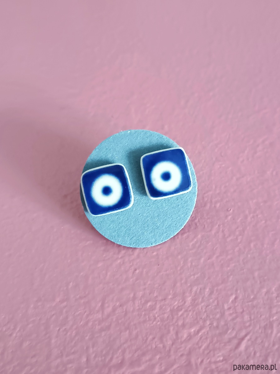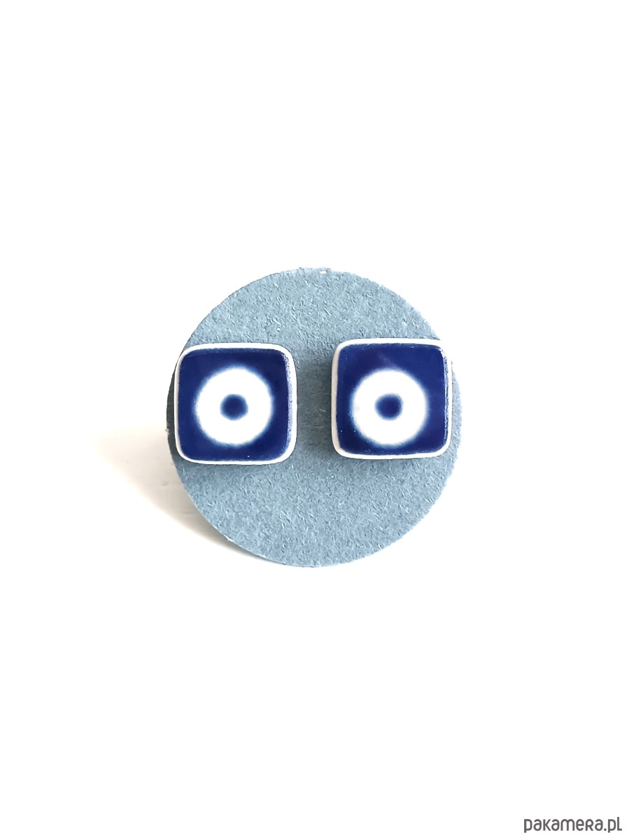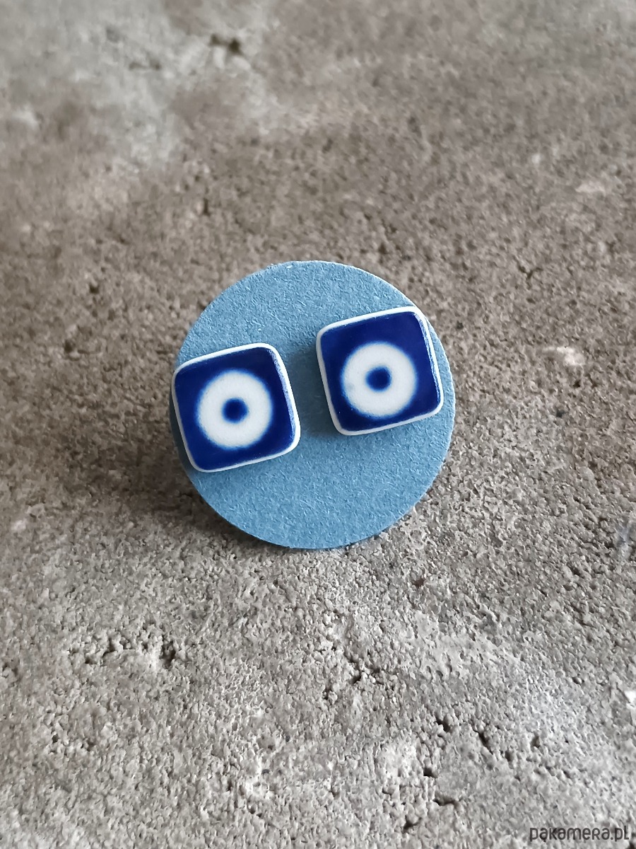 Ceramika w Bolesławcu i jego okolicach produkowana była już w XIV wieku. Do dziś najważniejszy surowiec, czyli glina wydobywany jest na miejscu, a tradycja wyrobu naczyń ceramicznych, rozwijana i kultywowana przez wieki - trwa. Bolesławiec jako marka, tworzona przez kilkadziesiąt różnych manufaktur, znana jest na całym świecie, a charakterystycznego wzoru w kobaltowe kropki nie sposób pomylić z żadnym innym. Co najbardziej wyróżnia Bolesławiec, to że szkliwo nakładane jest ręcznie, za pomocą stempelków z gąbki. Oto nieduże kolczyki, które wykonałam z fragmentów stłuczonego kubka, wykonanego właśnie w Bolesławcu (dekoracja nr 42). Kawałki stłuczki oszlifowałam w kwadratowe kształty i połączyłam ze srebrnymi sztyftami. Ceramikę zeszlifowałam również z grubości - jest cieńsza niż pierwotnie, dzięki czemu kolczyki nie są masywne. Brzegi i tył pokryłam lakierem, co sprawia, że nie brudzą się i nie chłoną wilgoci. Sztyfty oraz baranki (zapięcia) wykonane są ze srebra próby 925 - wyrób jest antyalergiczny. Wymiary elementów ceramicznych: 9 x 9 mm. Unikat - każdy z moich wyrobów występuje w jednym egzemplarzu. Upcykling - nie reprodukuję wykorzystywanych wzorów, niczego nie domalowuję - wykorzystuję wyłącznie oryginalne naczynia i motywy, które się na nich znajdują. Tym samym, stłuczce z odzysku nadaję nowe życie.