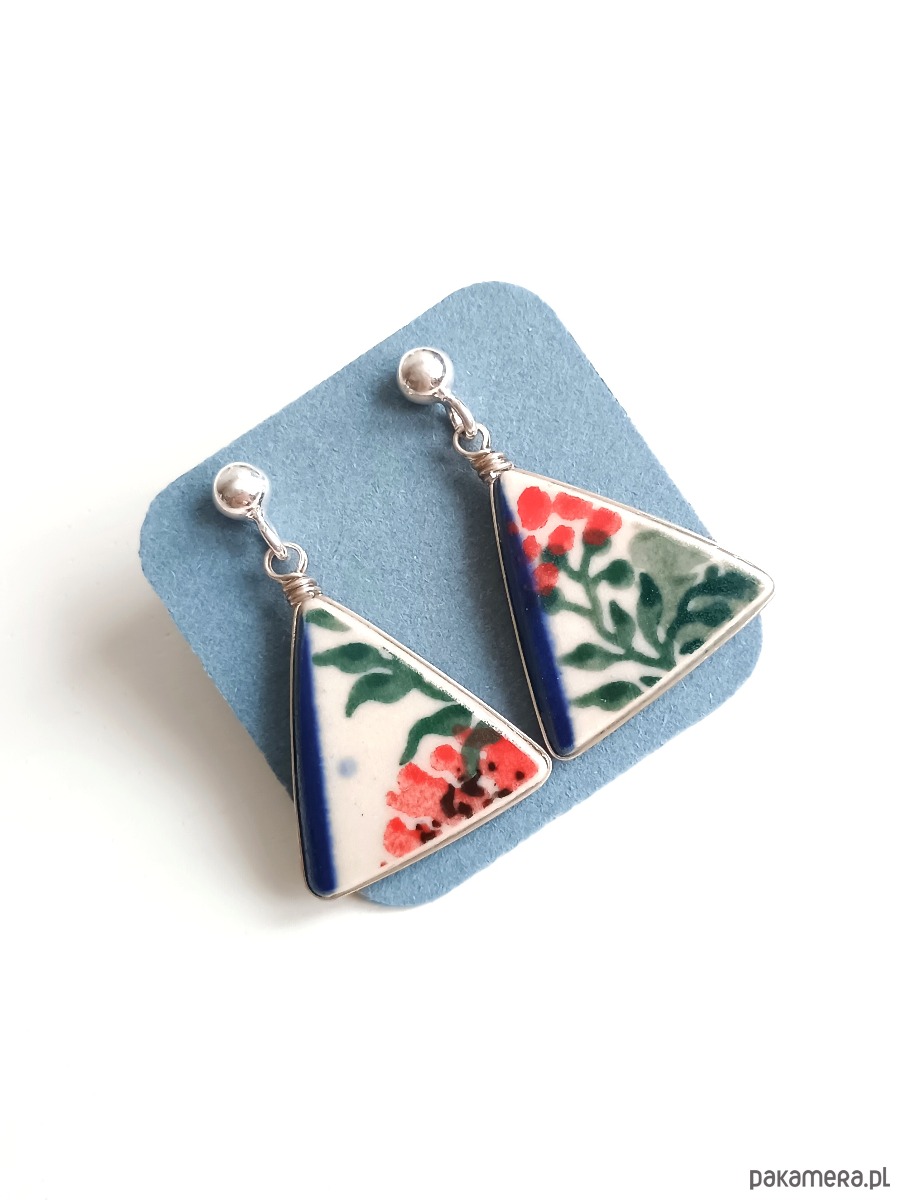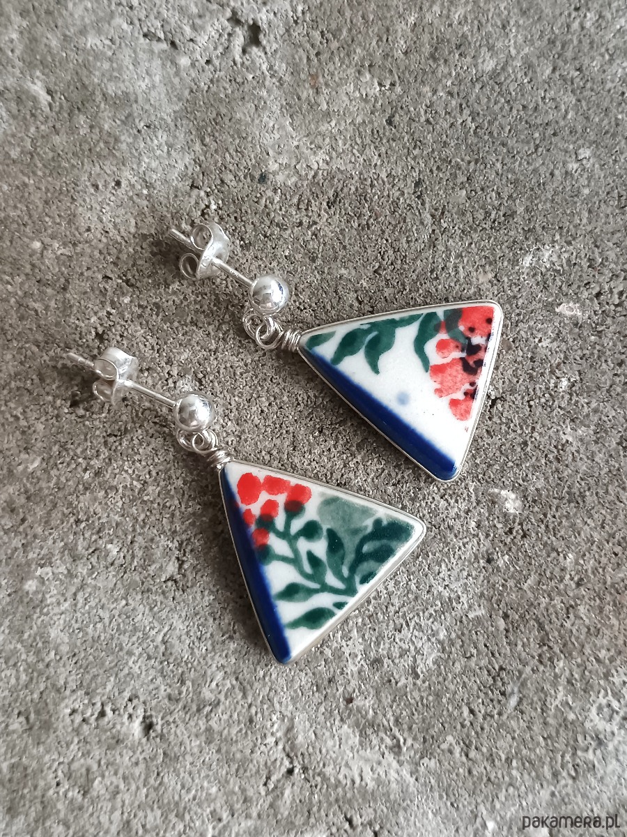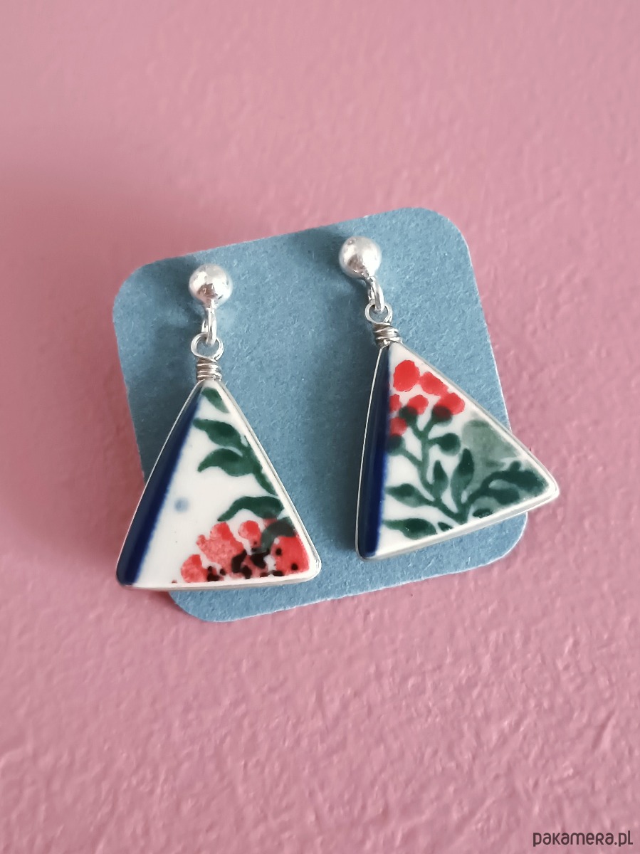 Ceramika w Bolesławcu i jego okolicach produkowana była już w XIV wieku. Do dziś najważniejszy surowiec, czyli glina wydobywany jest na miejscu, a tradycja wyrobu naczyń ceramicznych, rozwijana i kultywowana przez wieki - trwa. Bolesławiec jako marka, tworzona przez kilkadziesiąt różnych manufaktur, znana jest na całym świecie, a charakterystycznego wzoru w kobaltowe kropki nie sposób pomylić z żadnym innym. Co najbardziej wyróżnia Bolesławiec, to że szkliwo nakładane jest ręcznie, za pomocą stempelków z gąbki. Oto wiszące kolczyki, które wykonałam z fragmentów stłuczonego kubka, wykonanego właśnie w Bolesławcu. Kawałki stłuczki oszlifowałam w trójkątne kształty, oprawiłam w drucik i połączyłam ze srebrnymi sztyftami. Ceramikę zeszlifowałam również z grubości - jest cieńsza niż pierwotnie, dzięki czemu kolczyki nie są masywne. Brzegi i tył pokryłam lakierem, co sprawia, że nie brudzą się i nie chłoną wilgoci. Oprawa, sztyfty oraz baranki (zapięcia) wykonane są ze srebra próby 925 - wyrób jest antyalergiczny. Wymiary elementów ceramicznych: 18 x 18 mm. Waga jednego kolczyka: 1,7 g. Unikat - każdy z moich wyrobów występuje w jednym egzemplarzu. Upcykling - nie reprodukuję wykorzystywanych wzorów, niczego nie domalowuję - wykorzystuję wyłącznie oryginalne naczynia i motywy, które się na nich znajdują. Tym samym, stłuczce z odzysku nadaję nowe życie.