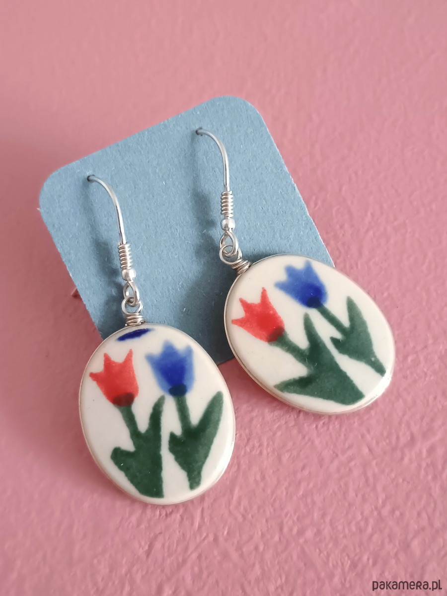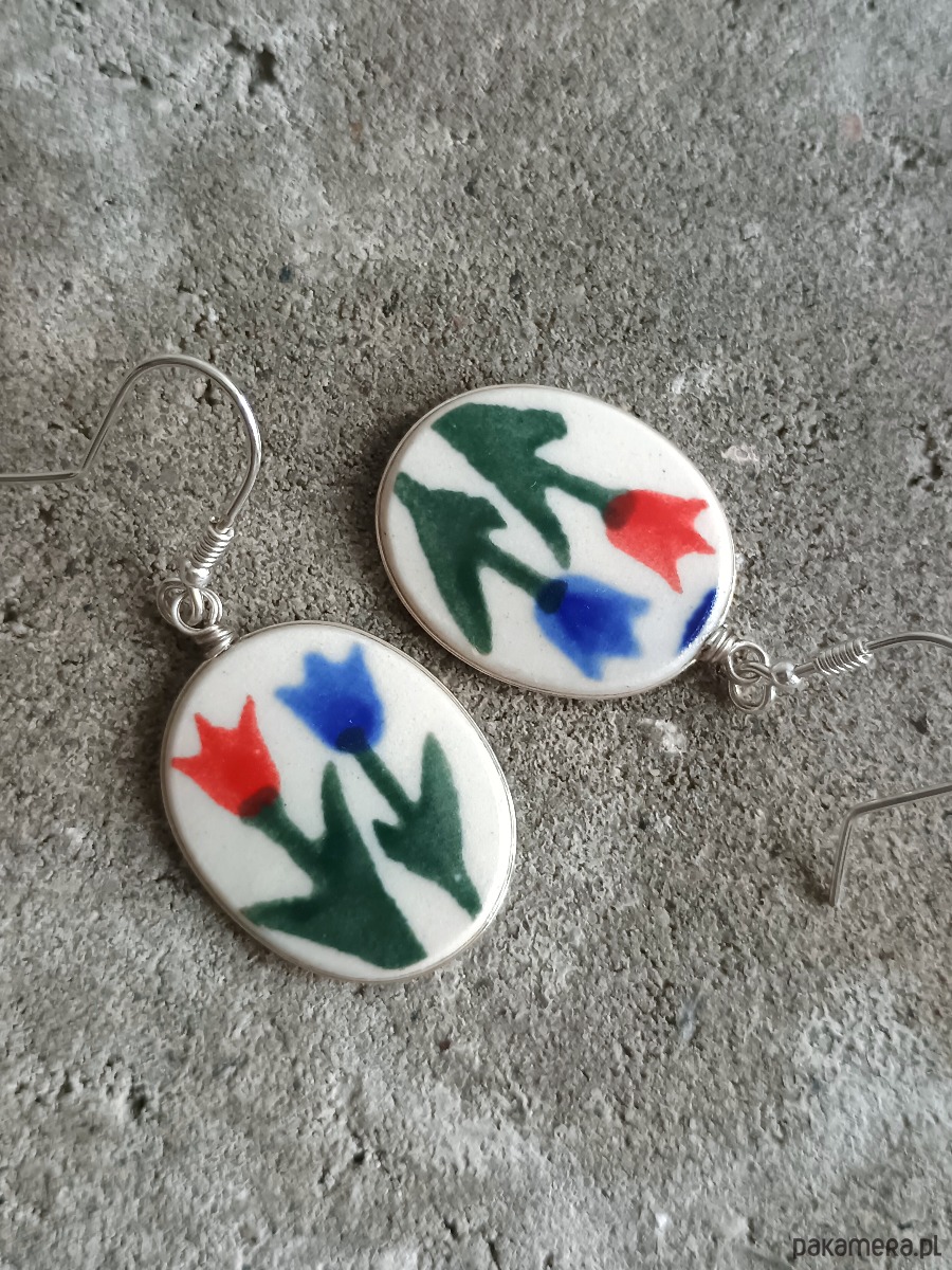 Ceramika w Bolesławcu i jego okolicach produkowana była już w XIV wieku. Do dziś najważniejszy surowiec, czyli glina wydobywany jest na miejscu, a tradycja wyrobu naczyń ceramicznych, rozwijana i kultywowana przez wieki - trwa. Bolesławiec jako marka, tworzona przez kilkadziesiąt różnych manufaktur, znana jest na całym świecie, a charakterystycznego wzoru w kobaltowe kropki nie sposób pomylić z żadnym innym. Co najbardziej wyróżnia Bolesławiec, to że szkliwo nakładane jest ręcznie, za pomocą stempelków z gąbki. Oto wiszące kolczyki, które wykonałam z fragmentów stłuczonego kubka, wykonanego właśnie w Bolesławcu. Kawałki stłuczki oszlifowałam w owalne kształty, oprawiłam w drucik i połączyłam ze srebrnymi biglami. Ceramikę zeszlifowałam również z grubości - jest cieńsza niż pierwotnie, dzięki czemu kolczyki nie są masywne. Brzegi i tył pokryłam lakierem, co sprawia, że nie brudzą się i nie chłoną wilgoci. Oprawa, sztyfty oraz bigle (zapięcia) wykonane są ze srebra próby 925 - wyrób jest antyalergiczny. Wymiary elementów ceramicznych: 19 x 24 mm. Waga jednego kolczyka: 2,6 g. Unikat - każdy z moich wyrobów występuje w jednym egzemplarzu. Upcykling - nie reprodukuję wykorzystywanych wzorów, niczego nie domalowuję - wykorzystuję wyłącznie oryginalne naczynia i motywy, które się na nich znajdują. Tym samym, stłuczce z odzysku nadaję nowe życie.