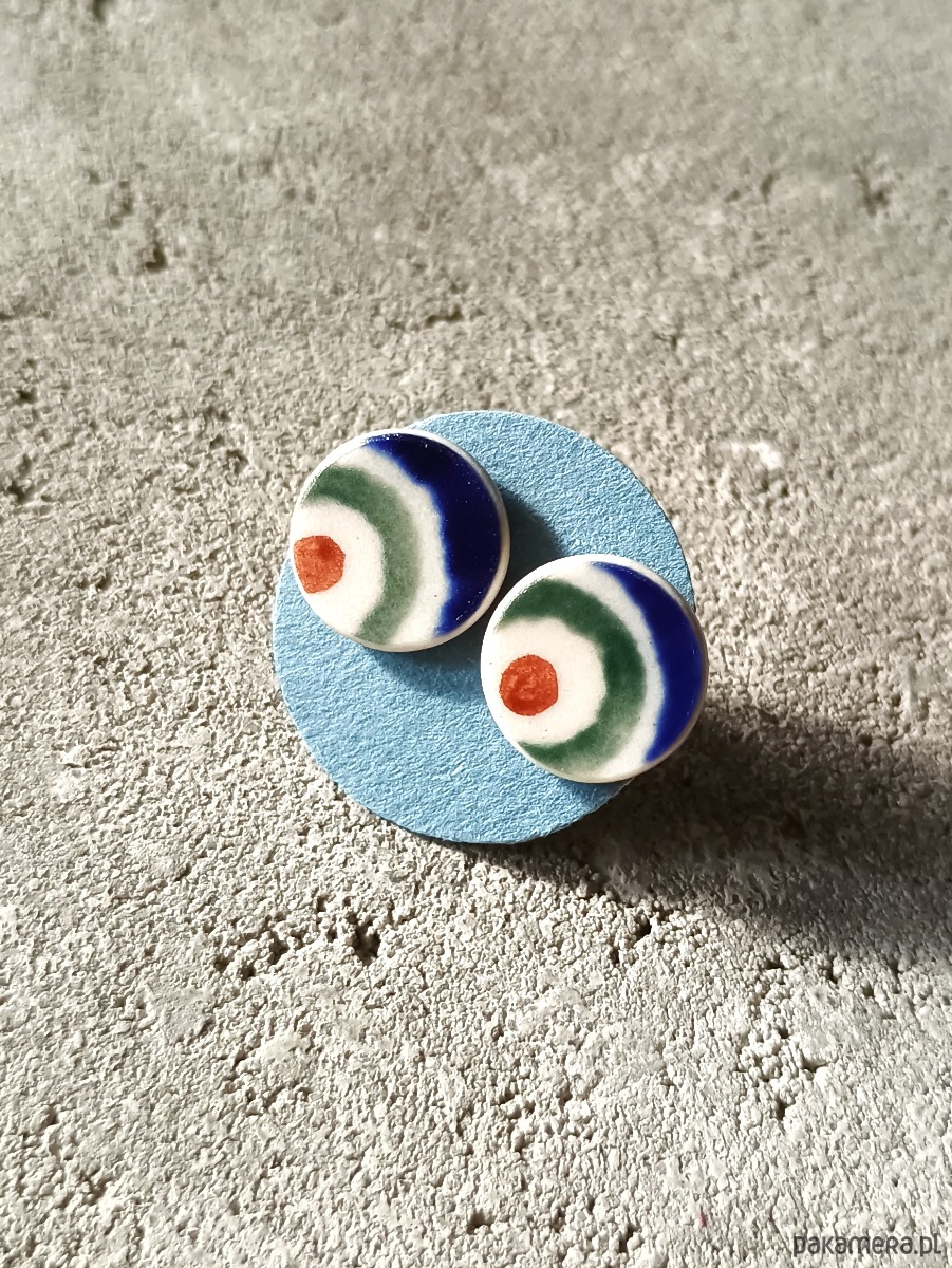 Ceramika w Bolesławcu i jego okolicach produkowana była już w XIV wieku. Do dziś najważniejszy surowiec, czyli glina wydobywany jest na miejscu, a tradycja wyrobu naczyń ceramicznych, rozwijana i kultywowana przez wieki - trwa. Bolesławiec jako marka, tworzona przez kilkadziesiąt różnych manufaktur, znana jest na całym świecie, a charakterystycznego wzoru w kobaltowe kropki nie sposób pomylić z żadnym innym. Co najbardziej wyróżnia Bolesławiec, to że szkliwo nakładane jest ręcznie, za pomocą stempelków z gąbki. Oto nieduże kolczyki, które wykonałam z fragmentów stłuczonego kubka, wykonanego właśnie w Bolesławcu (dekoracja nr 8, pawie oko). Kawałki stłuczki oszlifowałam w okrągłe kształty i połączyłam ze srebrnymi sztyftami. Ceramikę zeszlifowałam również z grubości - jest cieńsza niż pierwotnie, dzięki czemu kolczyki nie są masywne. Brzegi i tył pokryłam lakierem, co sprawia, że nie brudzą się i nie chłoną wilgoci. Sztyfty oraz baranki (zapięcia) wykonane są ze srebra próby 925 - wyrób jest antyalergiczny. Średnica elementów ceramicznych: 11 mm. Unikat - każdy z moich wyrobów występuje w jednym egzemplarzu. Upcykling - nie reprodukuję wykorzystywanych wzorów, niczego nie domalowuję - wykorzystuję wyłącznie oryginalne naczynia i motywy, które się na nich znajdują. Tym samym, stłuczce z odzysku nadaję nowe życie.