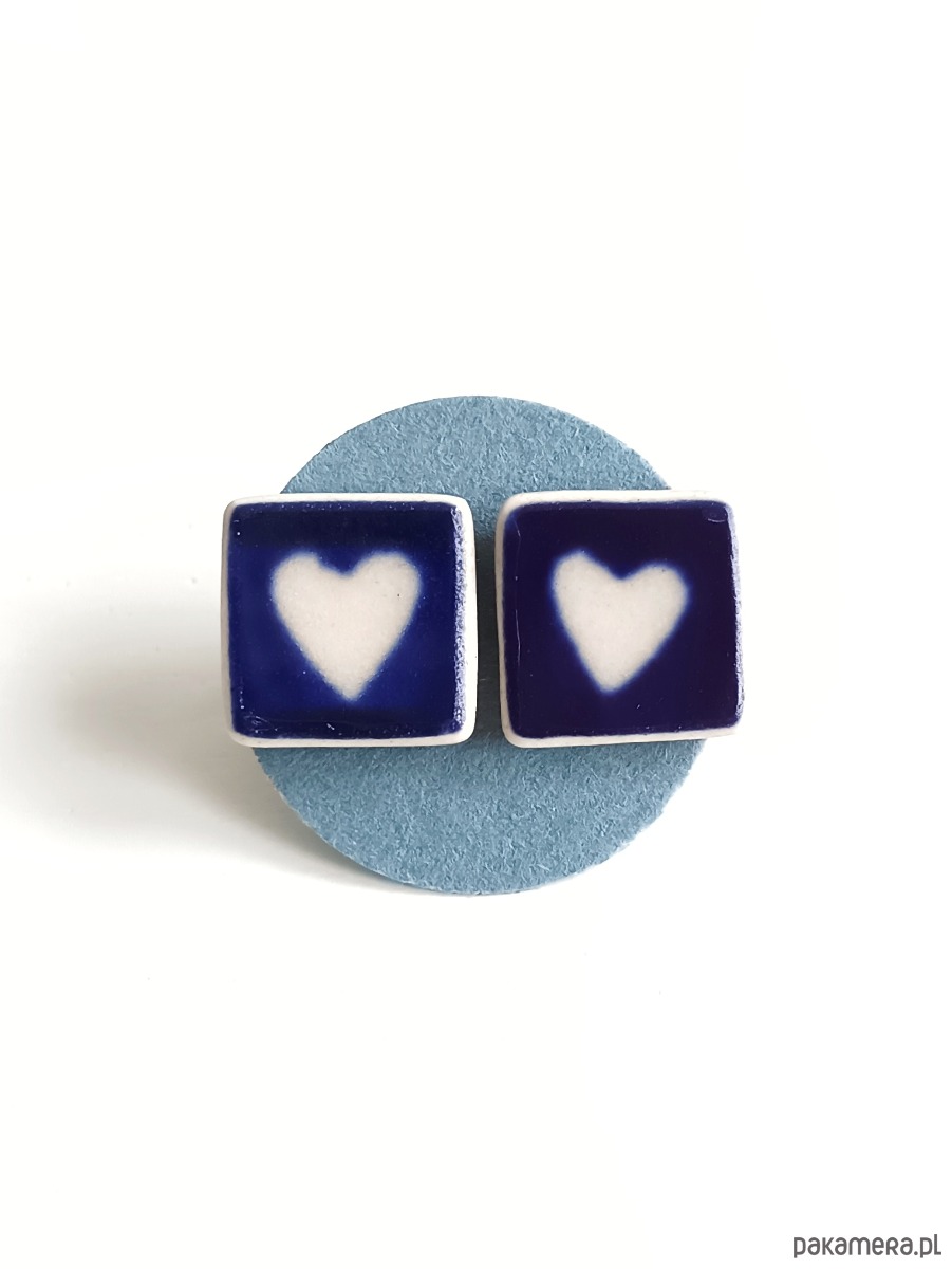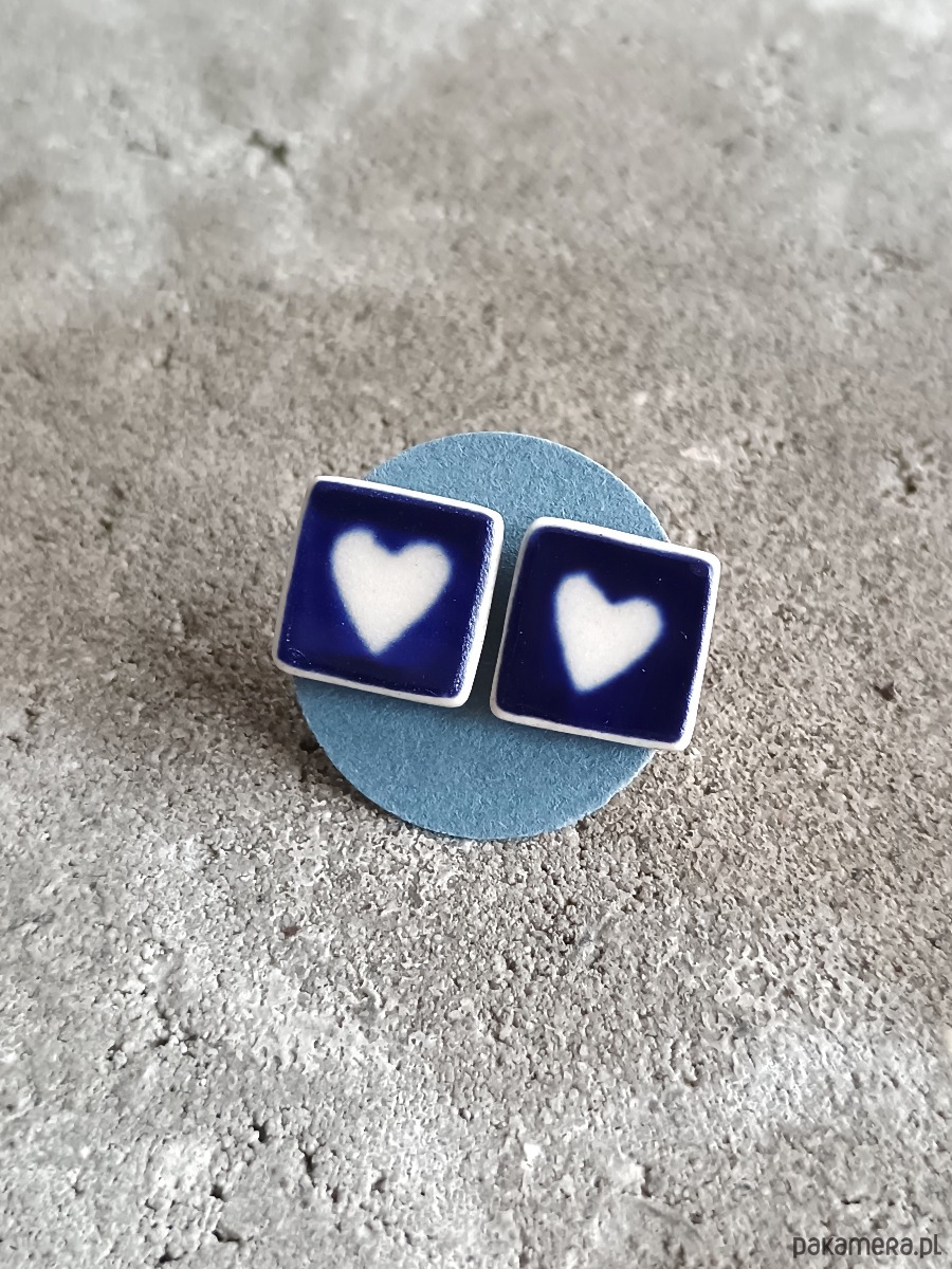 Ceramika w Bolesławcu i jego okolicach produkowana była już w XIV wieku. Do dziś najważniejszy surowiec, czyli glina wydobywany jest na miejscu, a tradycja wyrobu naczyń ceramicznych, rozwijana i kultywowana przez wieki - trwa. Bolesławiec jako marka, tworzona przez kilkadziesiąt różnych manufaktur, znana jest na całym świecie, a charakterystycznego wzoru w kobaltowe kropki nie sposób pomylić z żadnym innym. Co najbardziej wyróżnia Bolesławiec, to że szkliwo nakładane jest ręcznie, za pomocą stempelków z gąbki. Oto nieduże kolczyki, które wykonałam z fragmentów stłuczonego talerza, wykonanego właśnie w Bolesławcu. Kawałki stłuczki oszlifowałam w kwadratowe kształty i połączyłam ze srebrnymi sztyftami. Ceramikę zeszlifowałam również z grubości - jest cieńsza niż pierwotnie, dzięki czemu kolczyki nie są masywne. Brzegi i tył pokryłam lakierem, co sprawia, że nie brudzą się i nie chłoną wilgoci. Sztyfty oraz baranki (zapięcia) wykonane są ze srebra próby 925 - wyrób jest antyalergiczny. Wymiary elementów ceramicznych: 11 x 11 mm. Unikat - każdy z moich wyrobów występuje w jednym egzemplarzu. Upcykling - nie reprodukuję wykorzystywanych wzorów, niczego nie domalowuję - wykorzystuję wyłącznie oryginalne naczynia i motywy, które się na nich znajdują. Tym samym, stłuczce z odzysku nadaję nowe życie.