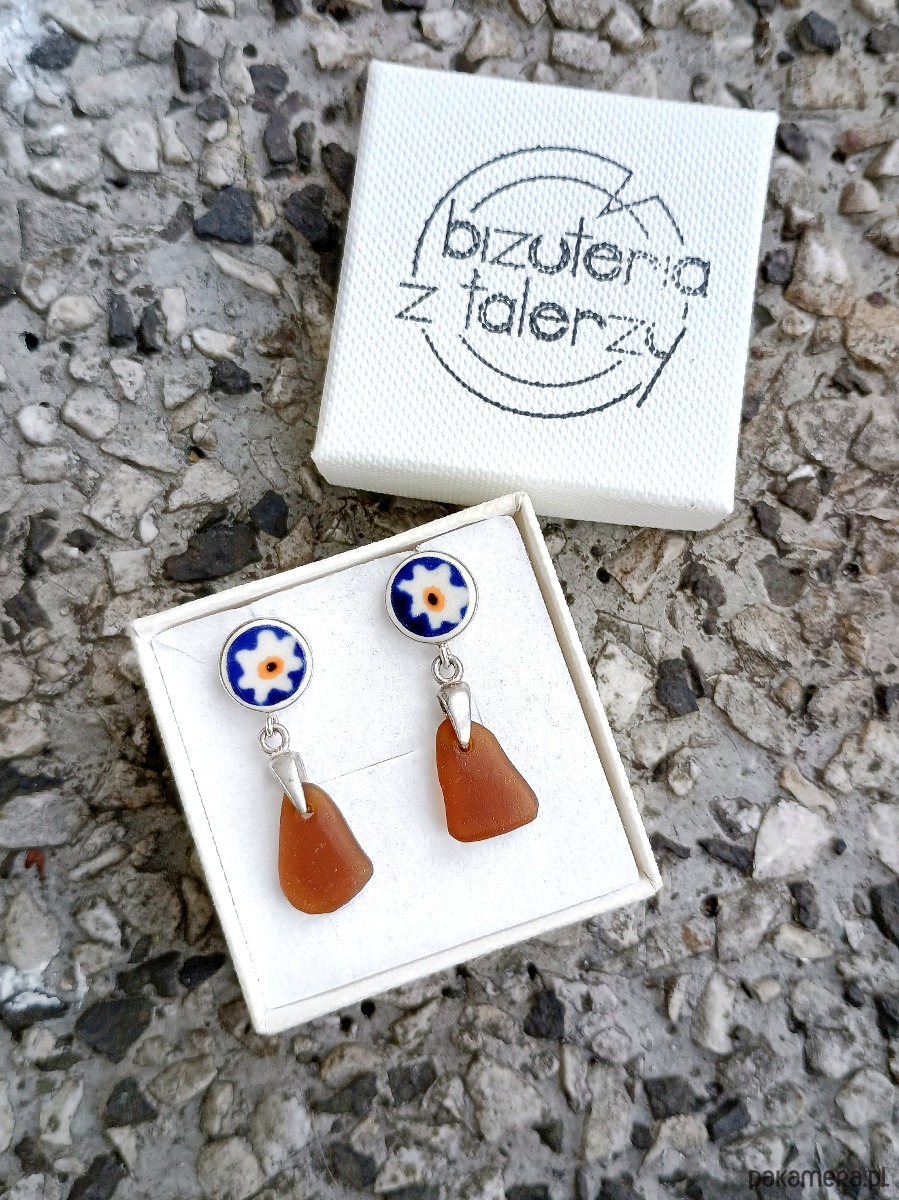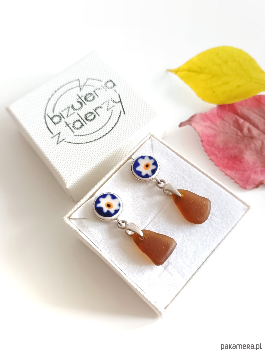 Kolczyki ceramiczne Bolesławiec + szkło z morza