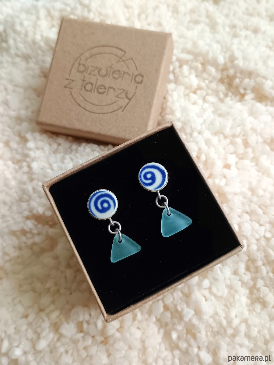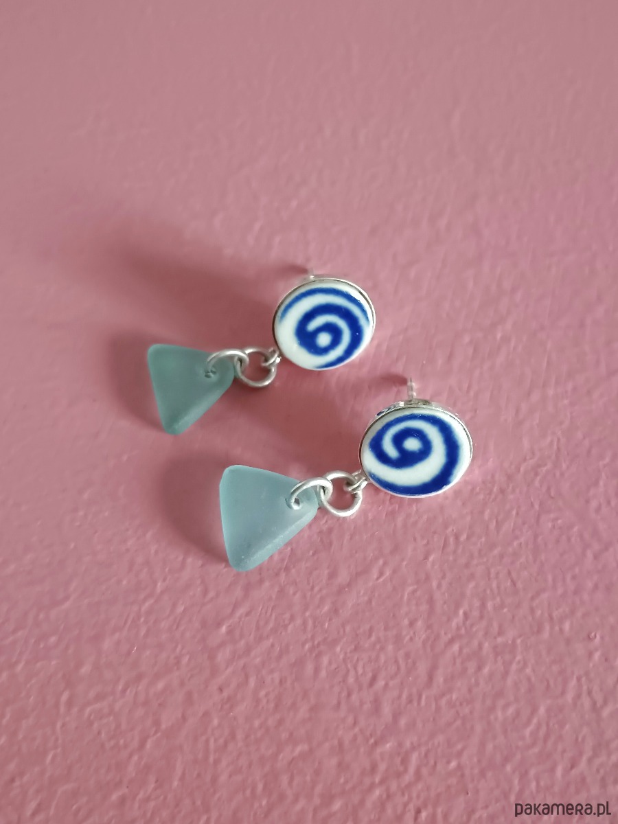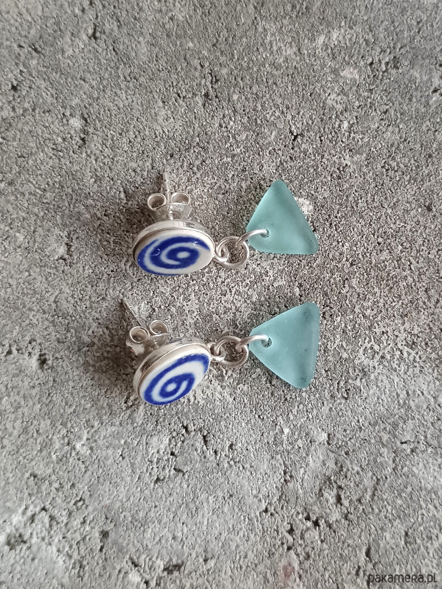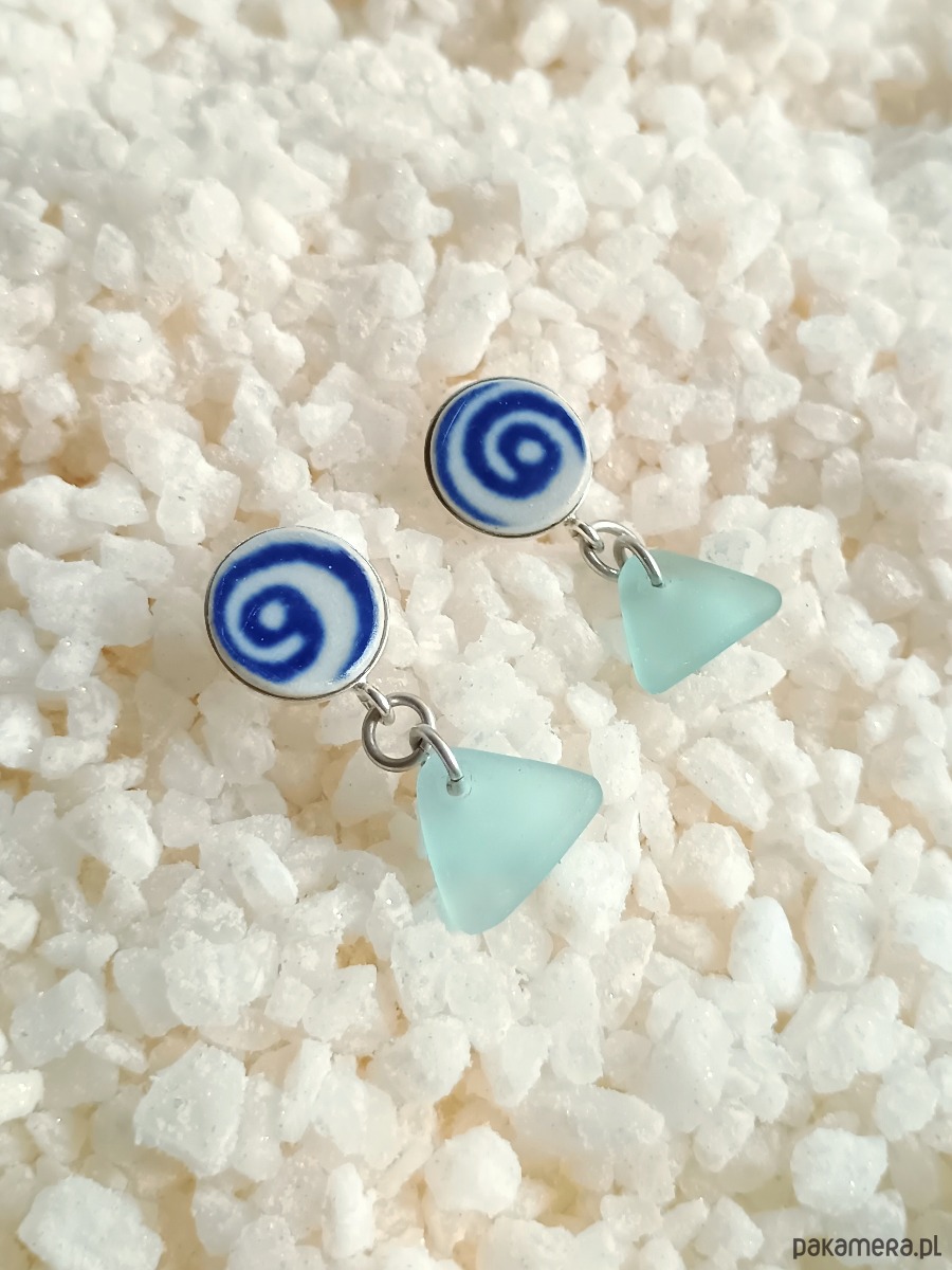 Kolczyki ceramiczne Bolesławiec + szkło z morza