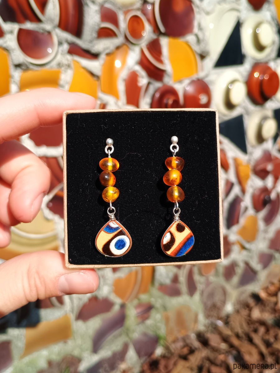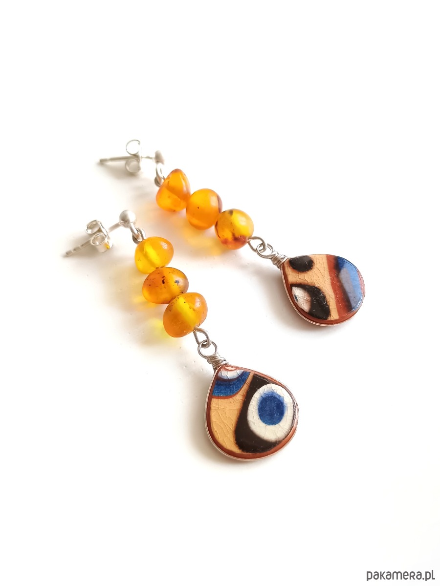 Kolczyki ceramiczne bułgarskie 3 bursztyny