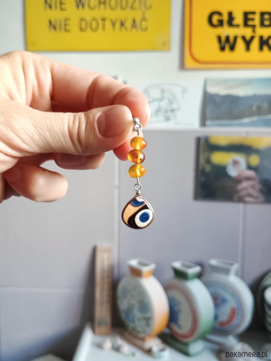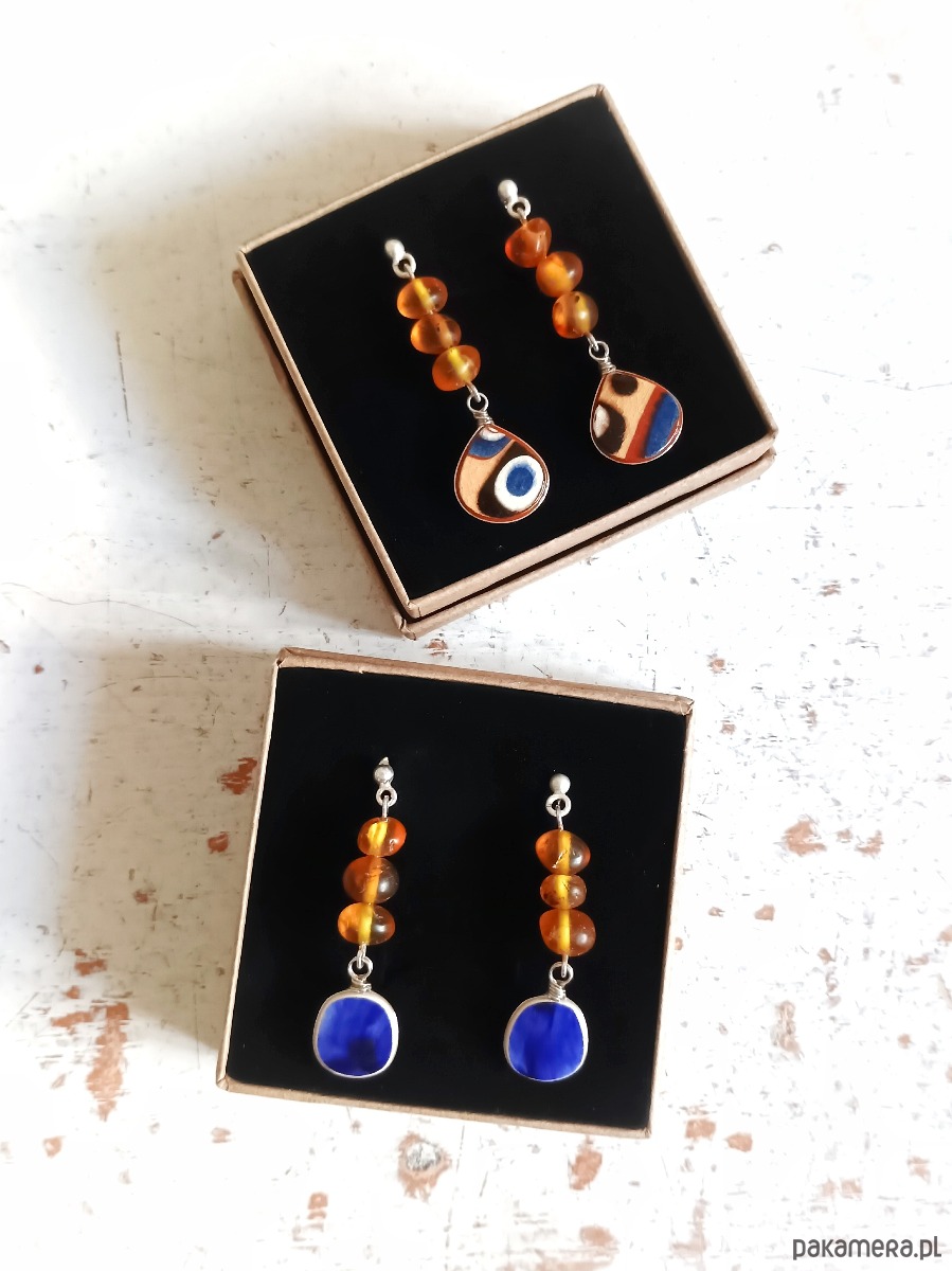 Oto kolczyki, które wykonałam z fragmentów tradycyjnej ceramiki bułgarskiej w kolorowe wzory. Kawałki stłuczki oszlifowałam w kształt łezek, oprawiłam w drucik i połączyłam z bursztynami oraz srebrnymi sztyftami. Ceramikę zeszlifowałam również z grubości - jest cieńsza niż pierwotnie, dzięki czemu kolczyki nie są masywne. Brzegi i tył pokryłam lakierem, co sprawia, że nie brudzą się i nie chłoną wilgoci. Oprawa oraz sztyfty wykonane są ze srebra próby 925 - wyrób jest antyalergiczny. Wymiary elementu ceramicznego: 13 x 14 mm. Średnica elementów bursztynowych: 7 mm. Długość całego kolczyka: 46 mm. Waga jednego kolczyka: 1,8 g. Unikat - każdy z moich wyrobów występuje w jednym egzemplarzu. Upcykling - nie reprodukuję wykorzystywanych wzorów, niczego nie domalowuję - wykorzystuję wyłącznie oryginalne naczynia i motywy, które się na nich znajdują. Tym samym, stłuczce z odzysku nadaję nowe życie.