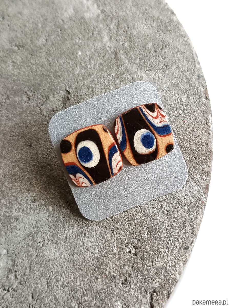 Duże kwadratowe kolczyki, które wykonałam z fragmentów stłuczonego talerza z tradycyjnej bułgarskiej ceramiki. Kawałki stłuczki oszlifowałam i połączyłam ze srebrnymi sztyftami. Ceramikę zeszlifowałam również z grubości - jest cieńsza niż pierwotnie, dzięki czemu kolczyki nie są masywne. Brzegi i tył pokryłam lakierem, co sprawia, że nie brudzą się i nie chłoną wilgoci. Sztyfty oraz baranki (zapięcia) wykonane są ze srebra próby 925 - wyrób jest antyalergiczny. Wymiary elementów ceramicznych: 16 x 16 mm. Unikat - każdy z moich wyrobów występuje w jednym egzemplarzu. Upcykling - nie reprodukuję wykorzystywanych wzorów, niczego nie domalowuję - wykorzystuję wyłącznie oryginalne naczynia i motywy, które się na nich znajdują. Tym samym, stłuczce z odzysku nadaję nowe życie.