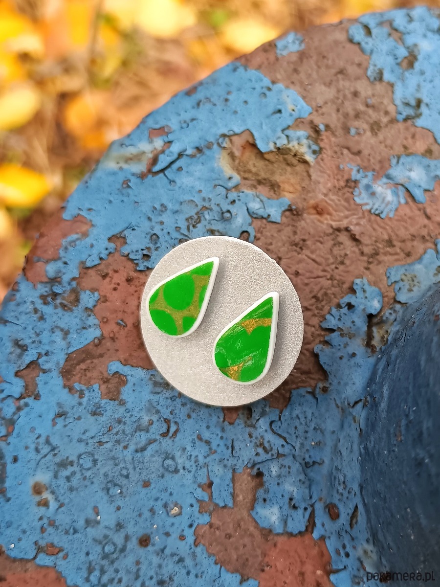 Nieduże kolczyki, które wykonałam z fragmentów stłuczonego spodeczka z Chodzieży, zielonego z charakterystycznym złotym marmurkowym tamponażem. Kawałki stłuczki oszlifowałam w kształt łezek i połączyłam ze srebrnymi sztyftami. Ceramikę zeszlifowałam również z grubości - jest cieńsza niż pierwotnie, dzięki czemu kolczyki nie są masywne. Brzegi i tył pokryłam lakierem, co sprawia, że nie brudzą się i nie chłoną wilgoci. Sztyfty oraz baranki (zapięcia) wykonane są ze srebra próby 925 - wyrób jest antyalergiczny. Wymiary elementów ceramicznych: 8 x 13 mm. Unikat - każdy z moich wyrobów występuje w jednym egzemplarzu. Upcykling - nie reprodukuję wykorzystywanych wzorów, niczego nie domalowuję - wykorzystuję wyłącznie oryginalne naczynia i motywy, które się na nich znajdują. Tym samym, stłuczce z odzysku nadaję nowe życie.