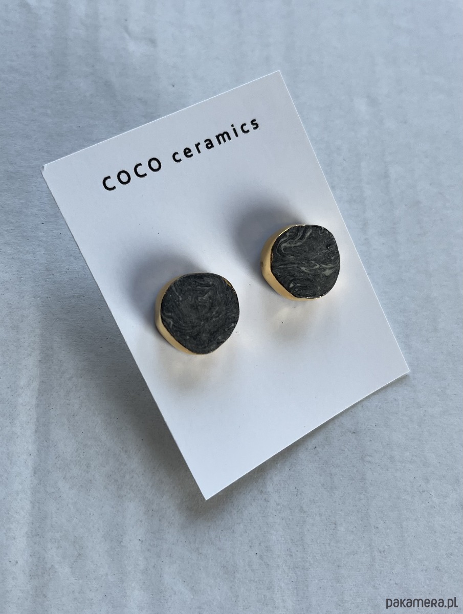 Element ceramiczny zdobiony jest złotem. Kolczyki są wykonane u nas w pracowni, część ceramiczna to autorski projekt.