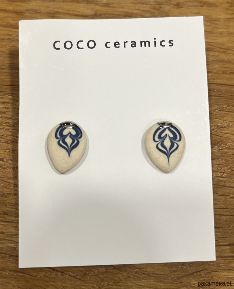 Ceramiczne kolczyki wykonane są z barwionego porcelitu. Delikatne. Subtelny dodatek na każdą okazję. Nawet na siłownię. Osadzone są na biglach ze stali chirurgicznej (niezawierającej niklu). Delikatny dekor, złoty relief .