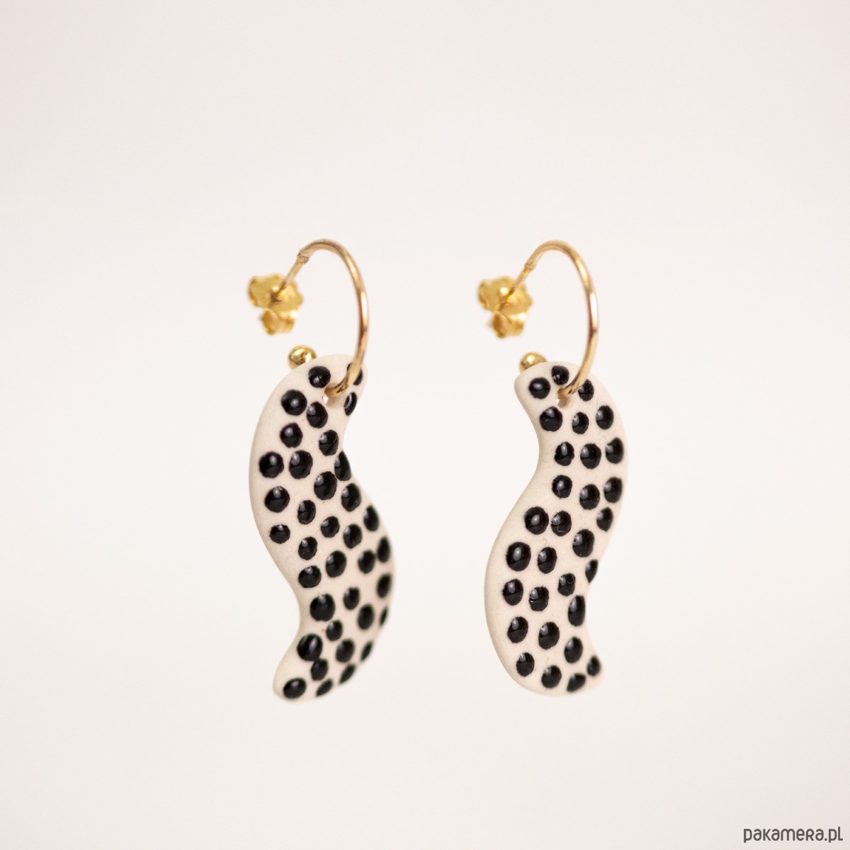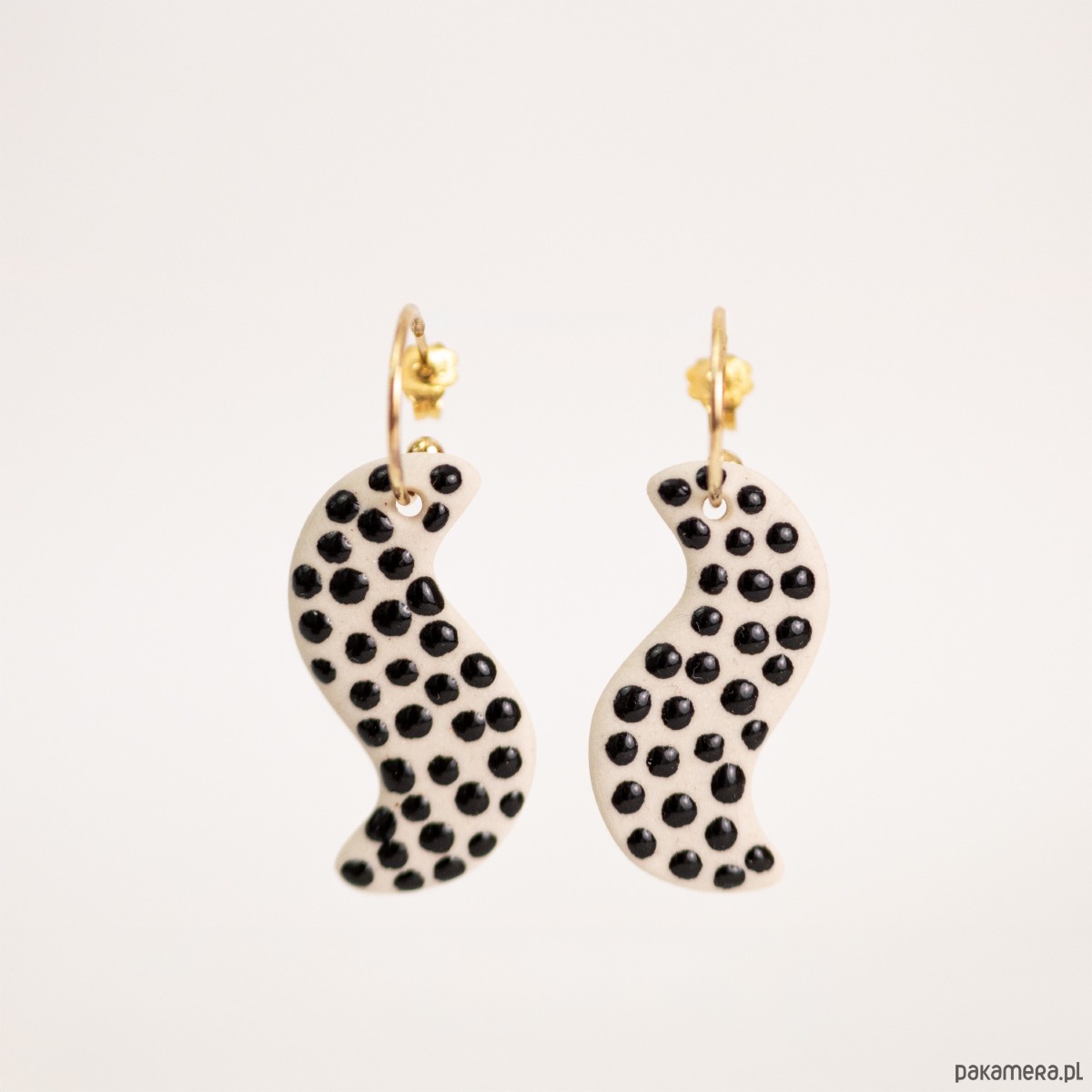 Kolczyki ceramiczne z elementem ze srebra pr. 925 w kolorze delikatnego złota. Kolczyki ręcznie formowane z gliny ceramicznej z nakrapianym wzorem z czarnego błyszczącego szkliwa. Ceramiczna część jest w kształcie płaskiej, nieregularnej "eski". Element ceramiczny wypalony jest w wysokiej temperaturze 1250 st.C.