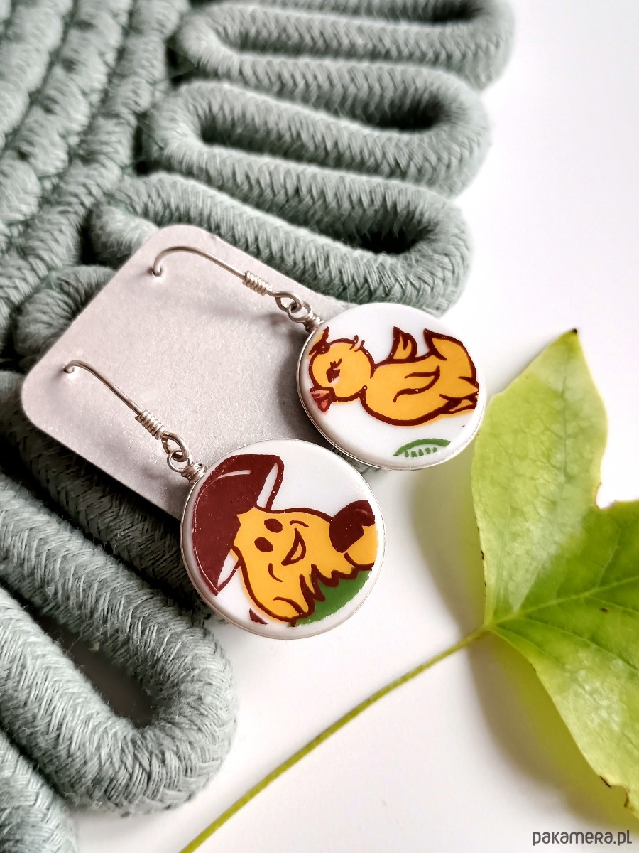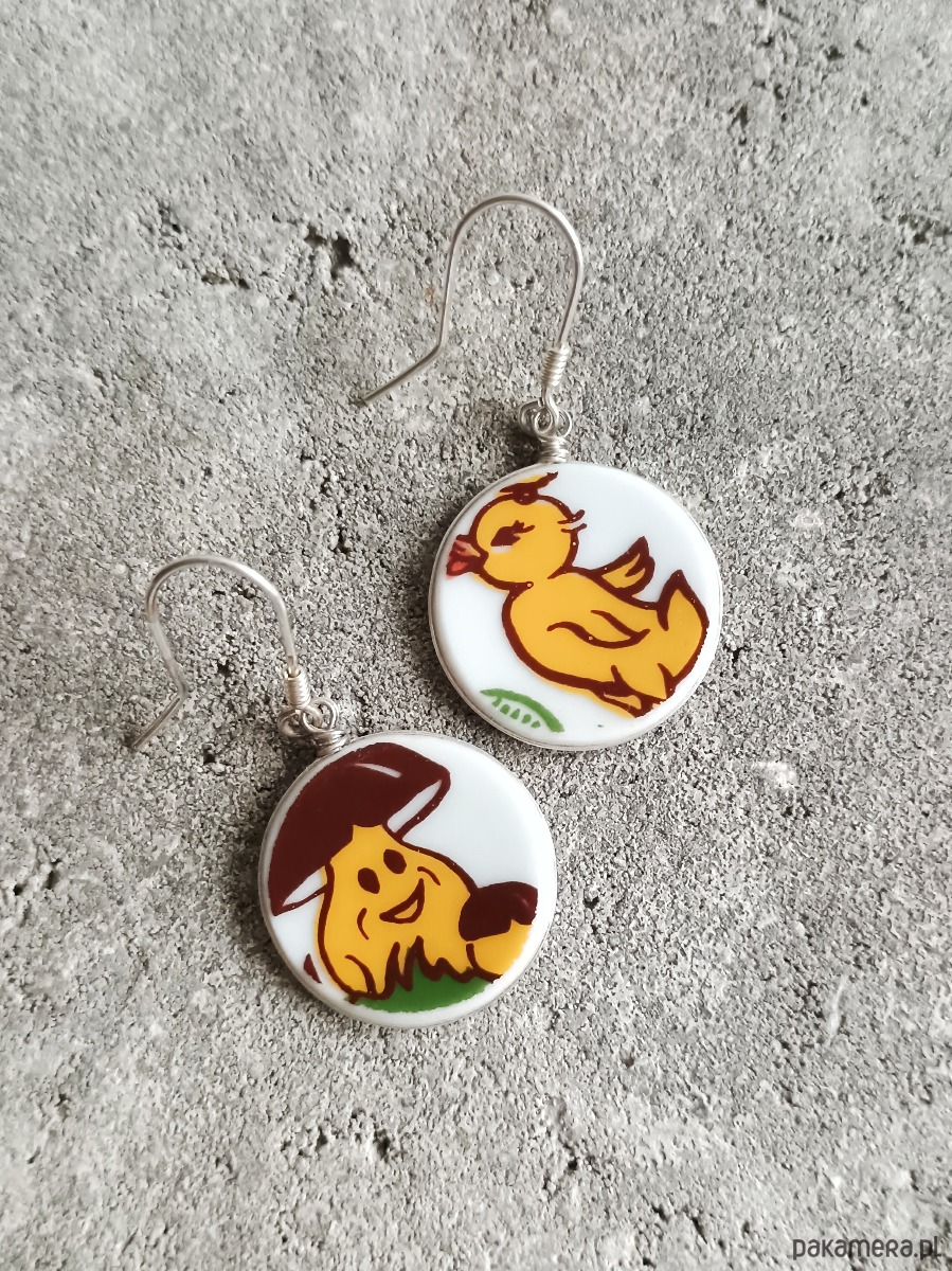 Okrągłe wiszące kolczyki, które wykonałam z fragmentów stłuczonego talerza z Lubiany w dziecięce wzory. Kawałki stłuczki oszlifowałam, oprawiłam w drucik i połączyłam ze srebrnymi biglami. Ceramikę zeszlifowałam również z grubości - jest cieńsza niż pierwotnie, dzięki czemu kolczyki nie są masywne. Brzegi i tył pokryłam lakierem, co sprawia, że nie brudzą się i nie chłoną wilgoci. Oprawa oraz bigle (zapięcia) wykonane są ze srebra próby 925 - wyrób jest antyalergiczny. Średnica elementów ceramicznych: 22 mm. Waga jednego kolczyka: 2,4 g. Unikat - każdy z moich wyrobów występuje w jednym egzemplarzu. Upcykling - nie reprodukuję wykorzystywanych wzorów, niczego nie domalowuję - wykorzystuję wyłącznie oryginalne naczynia i motywy, które się na nich znajdują. Tym samym, stłuczce z odzysku nadaję nowe życie.