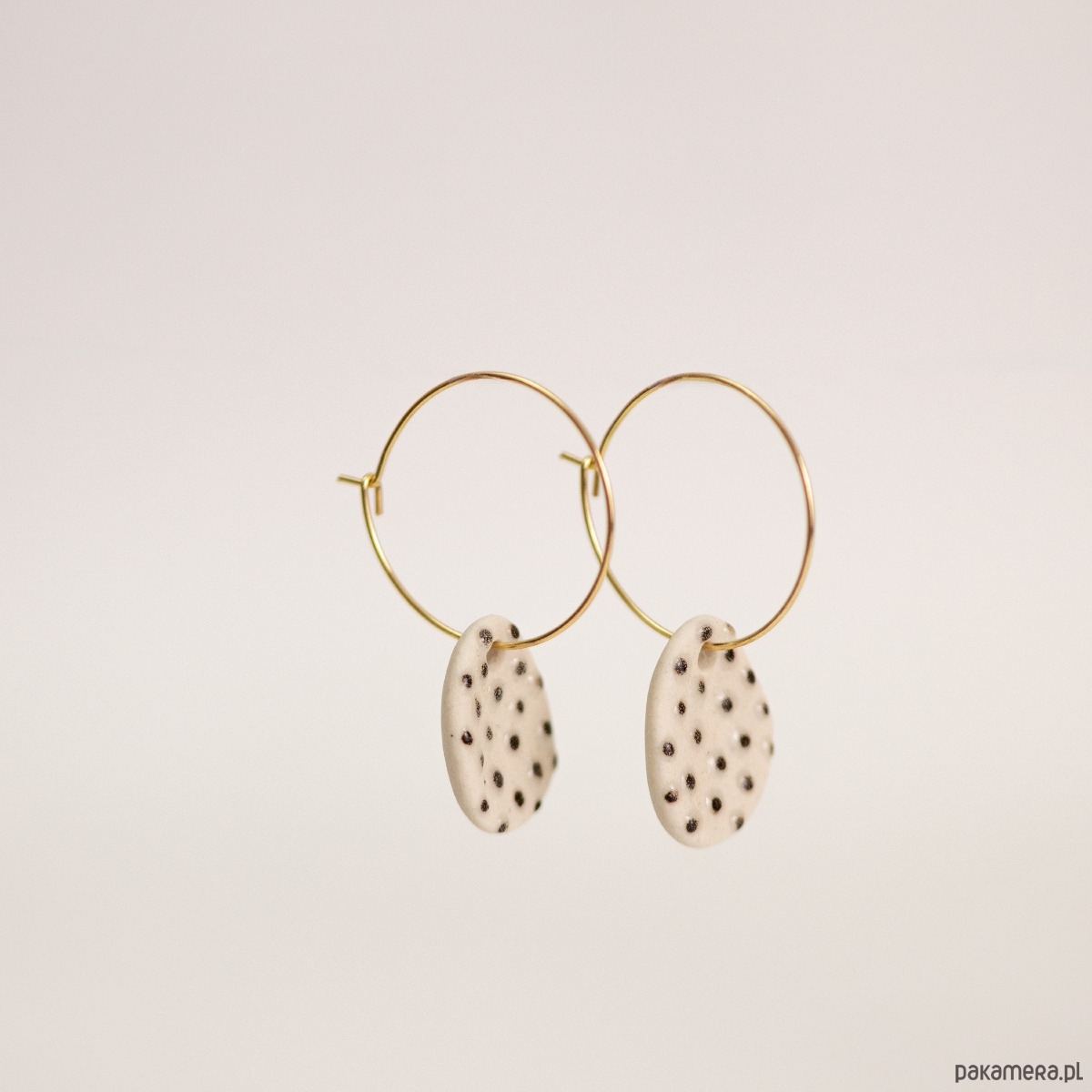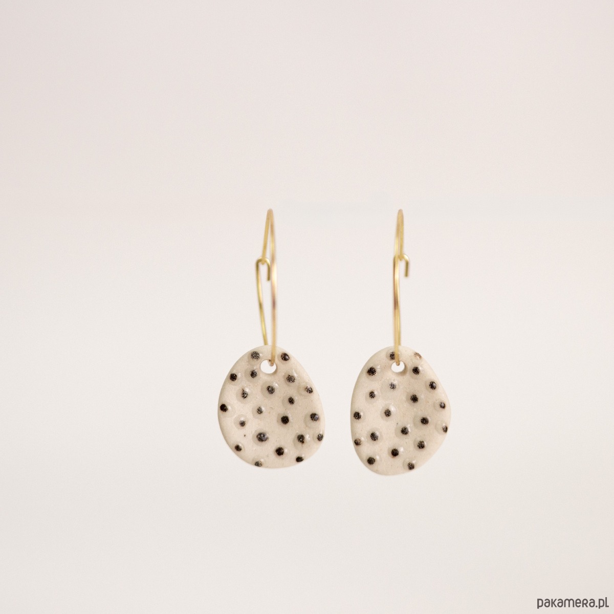 Kolczyki ceramiczne z biglem ze stali chirurgicznej w kolorze delikatnego złota. Kolczyki ręcznie formowane z gliny ceramicznej z malowanymi czarnymi kropkami, nakrapianymi błyszczącym szkliwem transparentnym. Element ceramiczny wypalony jest w wysokiej temperaturze 1250 st.C