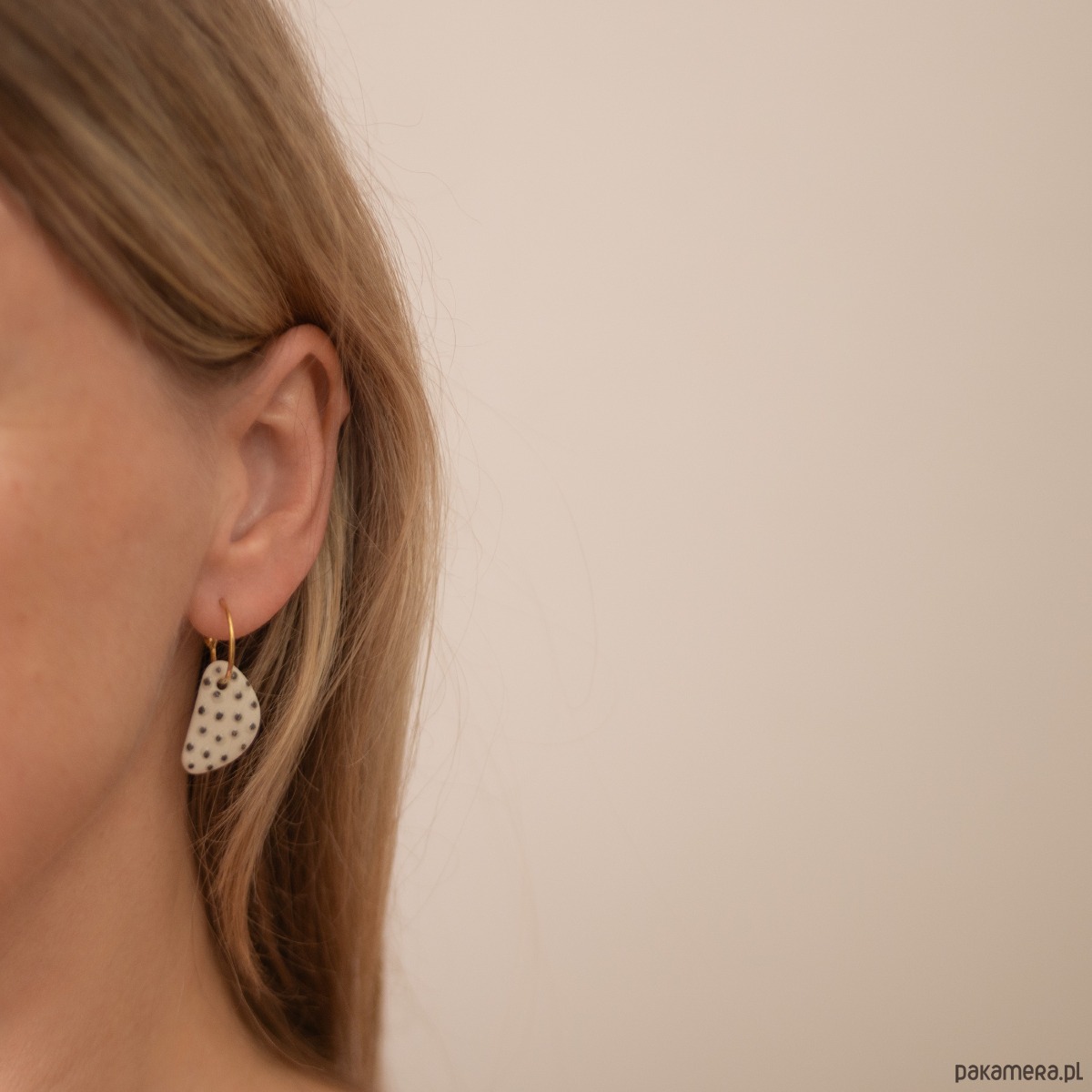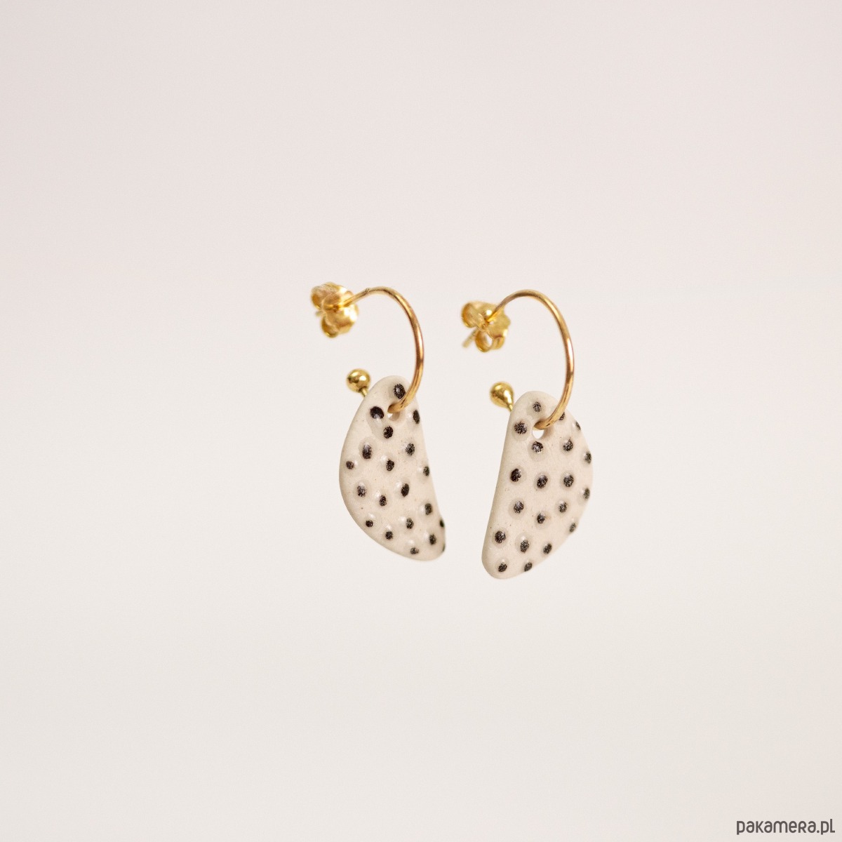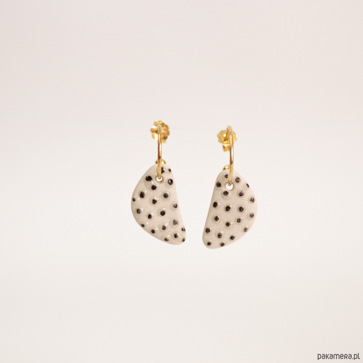 Kolczyki ceramiczne z elementem ze srebra pr. 925 w kolorze jasnego złota. Kolczyki ręcznie formowane z gliny ceramicznej z malowanymi czarnymi kropkami, nakrapianymi błyszczącym szkliwem transparentnym. Element ceramiczny wypalony jest w wysokiej temperaturze 1250 st.C