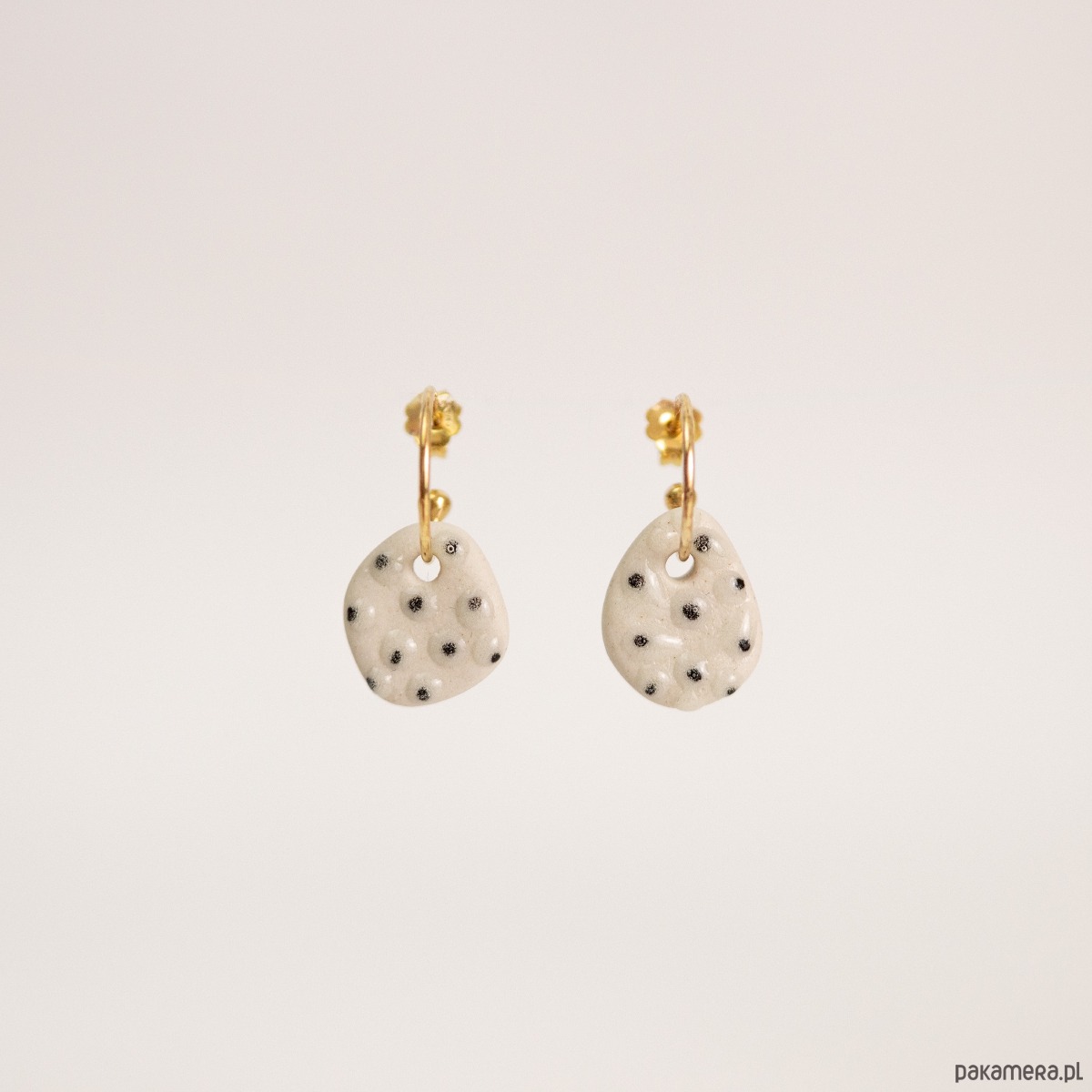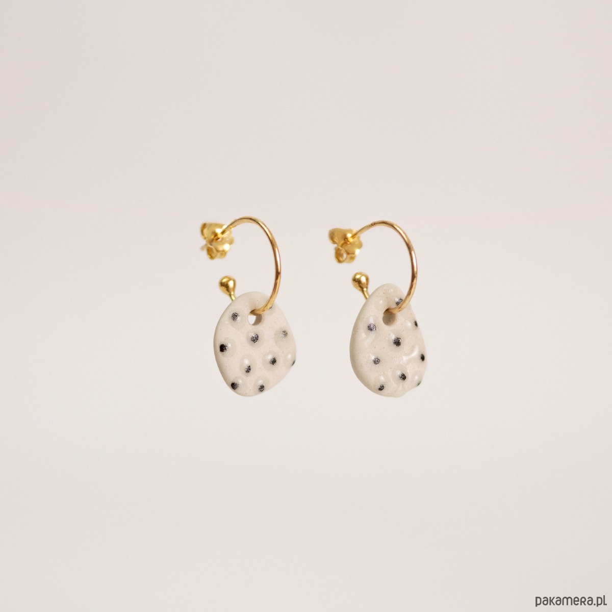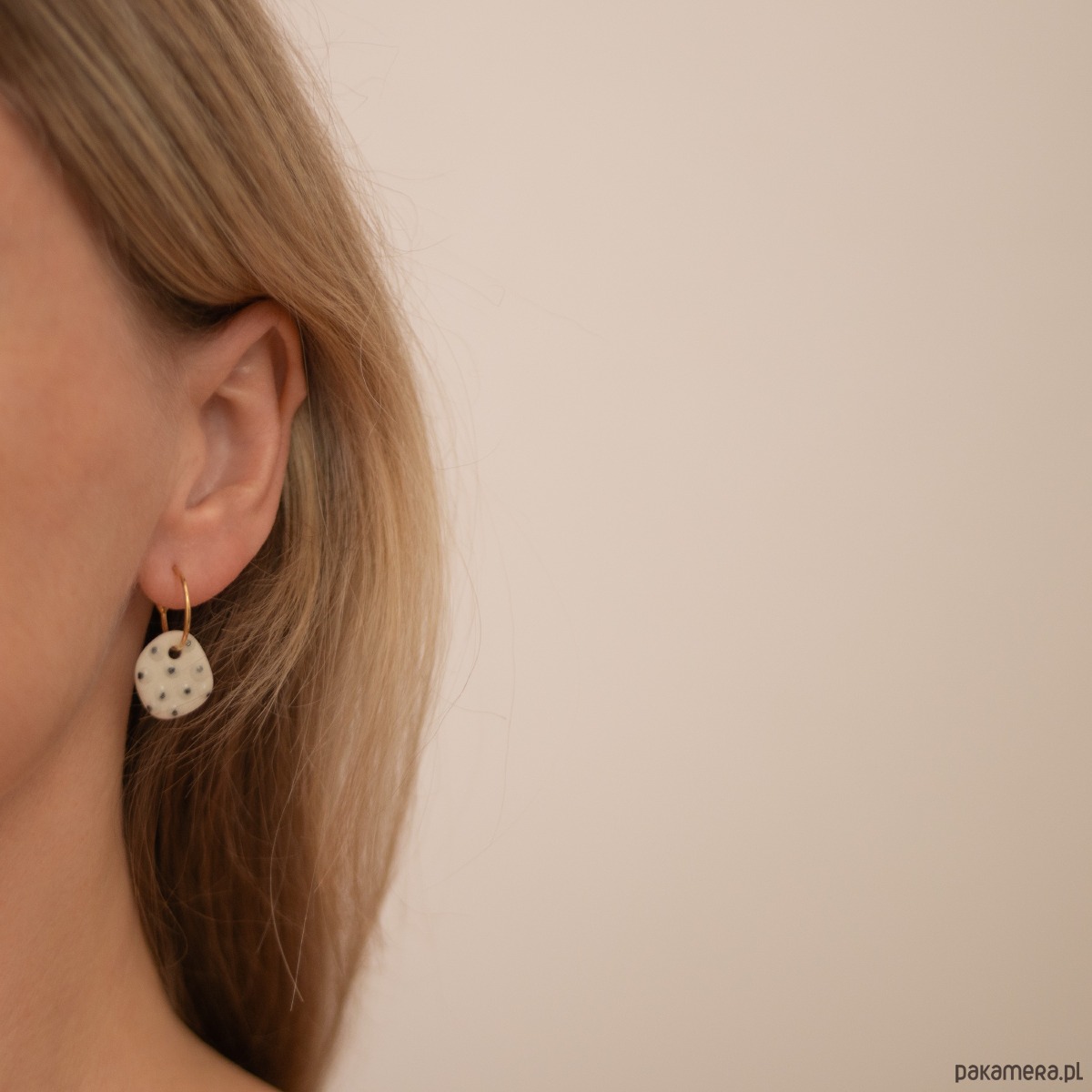 Kolczyki ceramiczne z elementem ze srebra pr. 925 w kolorze jasnego złota. Kolczyki ręcznie formowane z gliny ceramicznej z malowanymi czarnymi kropkami, nakrapianymi błyszczącym szkliwem transparentnym. Element ceramiczny wypalony jest w wysokiej temperaturze 1250 st.C