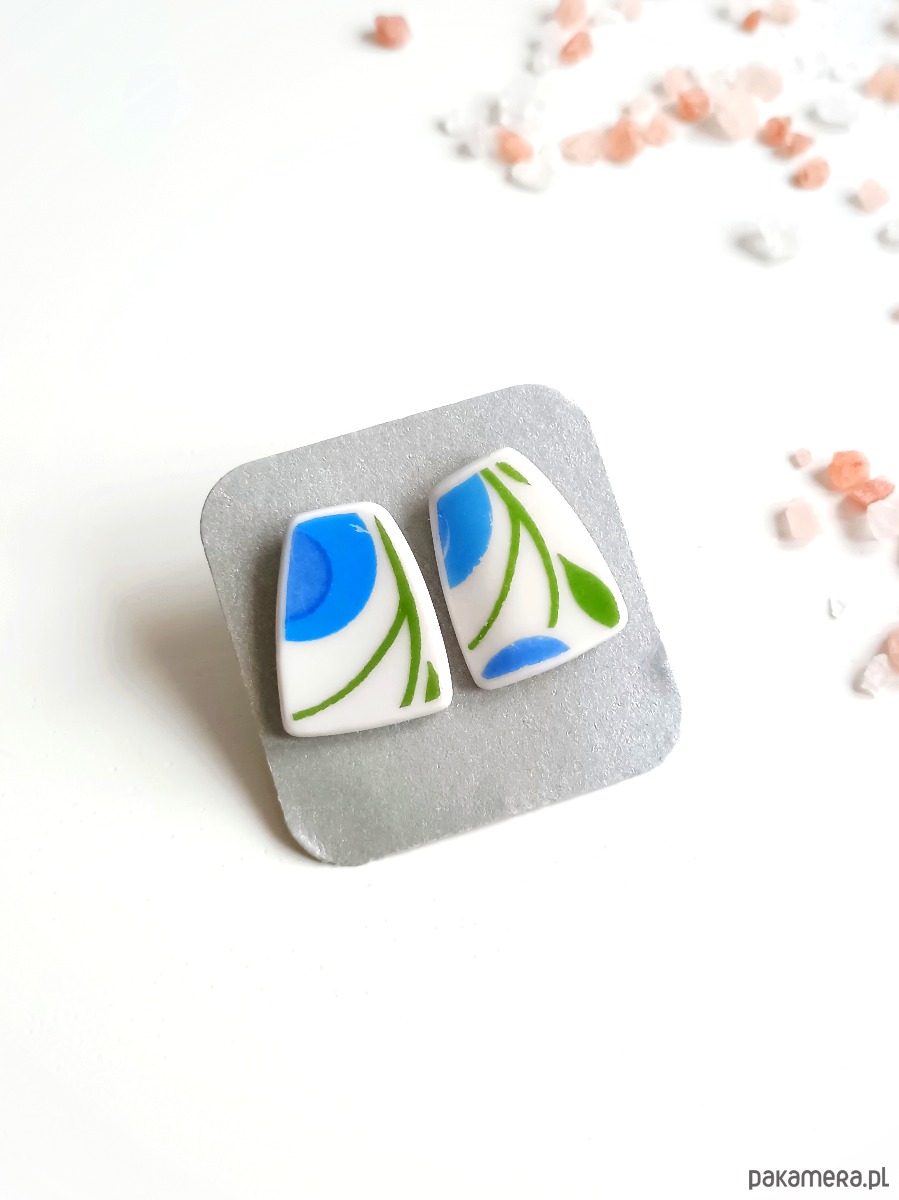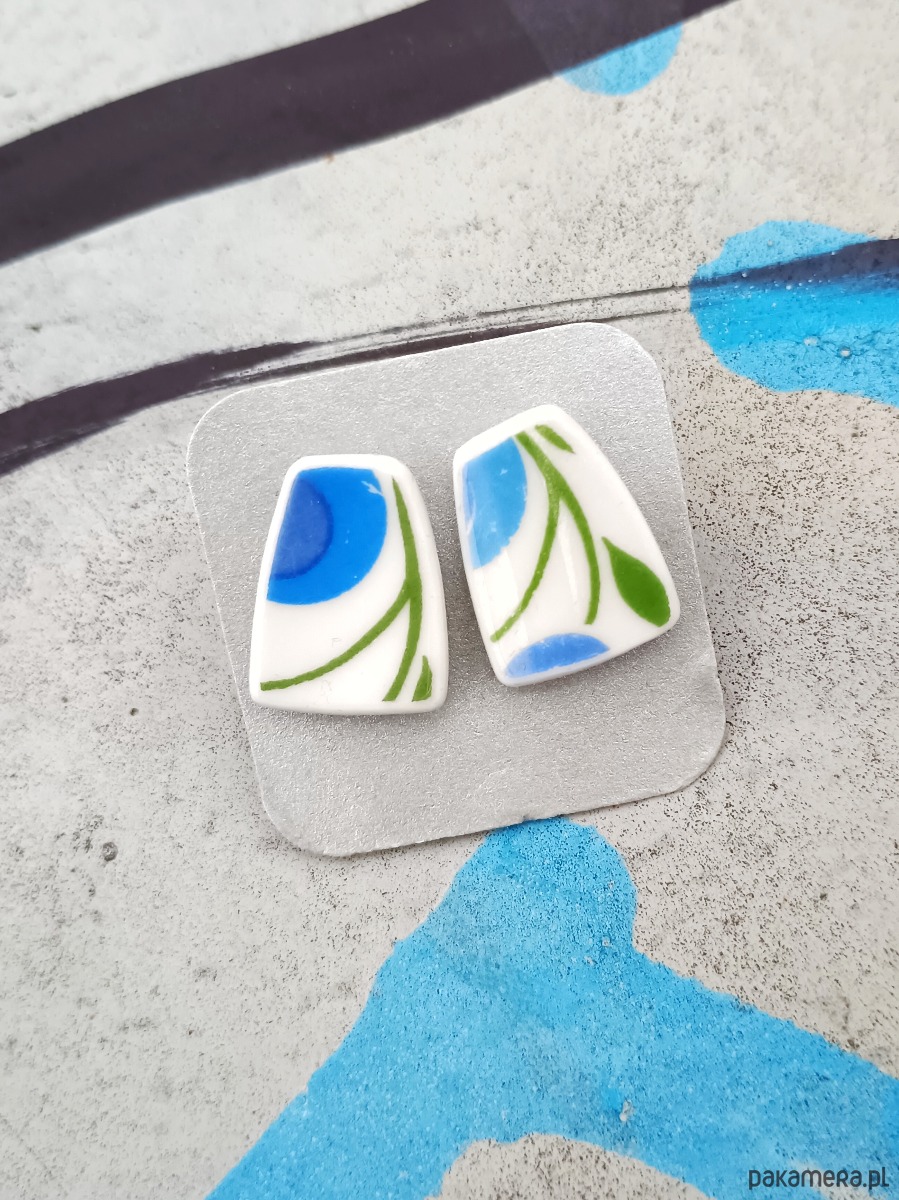 Spore prostokątne kolczyki, które wykonałam z fragmentów stłuczonego talerza wyprodukowanego w fabryce Lubiana z tradycyjnym wzorem kaszubskim. Kawałki stłuczki oszlifowałam i połączyłam ze srebrnymi sztyftami. Ceramikę zeszlifowałam również z grubości - jest cieńsza niż pierwotnie, dzięki czemu kolczyki nie są masywne. Brzegi pokryłam lakierem, co sprawia, że nie brudzą się i nie chłoną wilgoci. Sztyfty oraz baranki (zapięcia) wykonane są ze srebra próby 925 - wyrób jest antyalergiczny. Wymiary elementów ceramicznych: 14 x 18 mm. Unikat - każdy z moich wyrobów występuje w jednym egzemplarzu. Upcykling - nie reprodukuję wykorzystywanych wzorów, niczego nie domalowuję - wykorzystuję wyłącznie oryginalne naczynia i motywy, które się na nich znajdują. Tym samym, stłuczce z odzysku nadaję nowe życie.