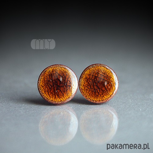 Ceramiczne okrągłe kolczyki w formie sztyftów, ręcznie wykonane z delikatnej gliny kamionkowej, jednostronnie szkliwione mieszanką brązowych szkliw z efektem plamek i połyskujących drobinek, na antyalergicznych sztyftach w kolorze srebrnym. Średnica ok.14mm. Polecam