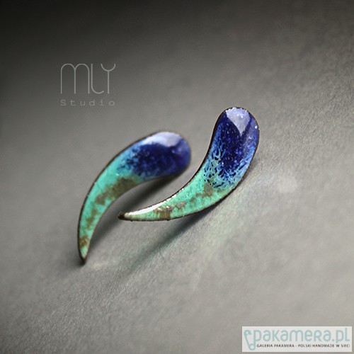 Ceramiczne podłużne kolczyki, ręcznie wykonane z delikatnej gliny kamionkowej, jednostronnie szkliwione mieszanką subtelnie błyszczących zielonych i błękitnych szkliw z efektem plamek, tył matowy, na antyalergicznych sztyftach ze stali chirurgicznej w kolorze srebrnym. długość ok 2,8cm. Polecam