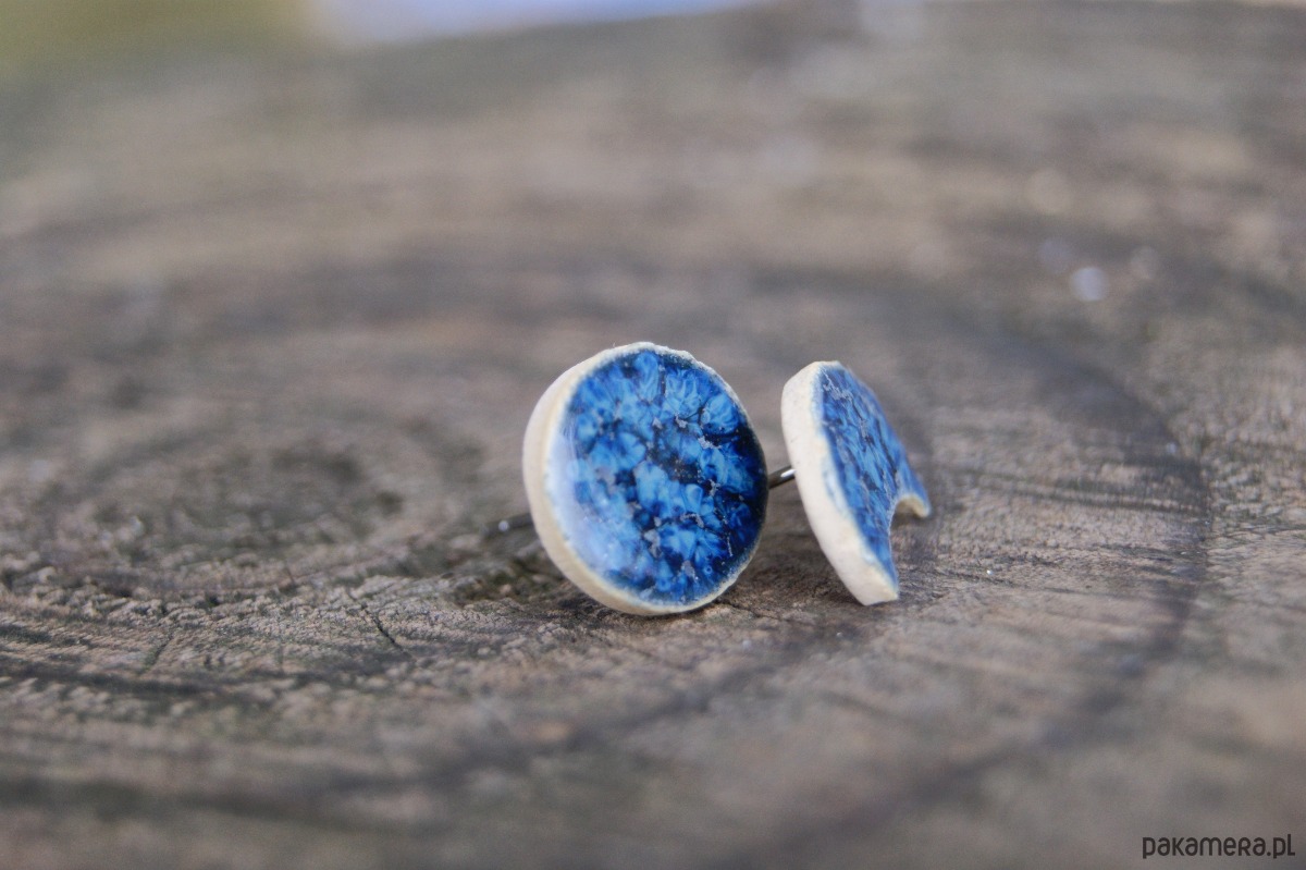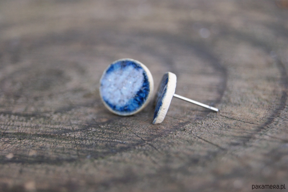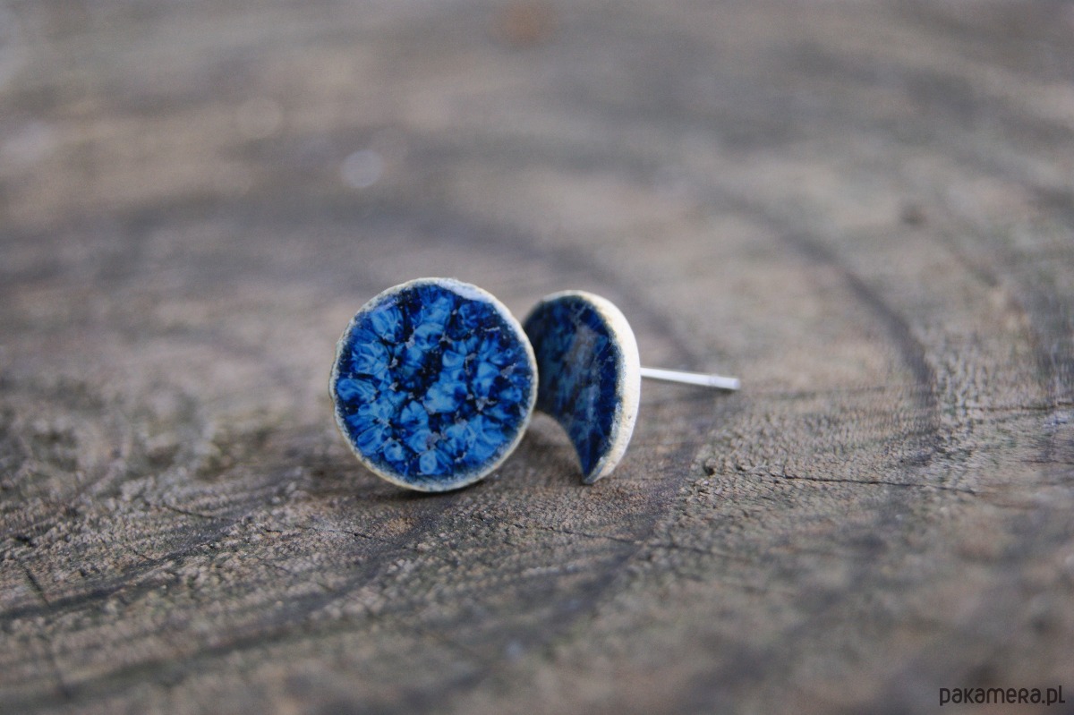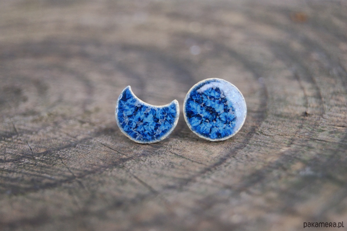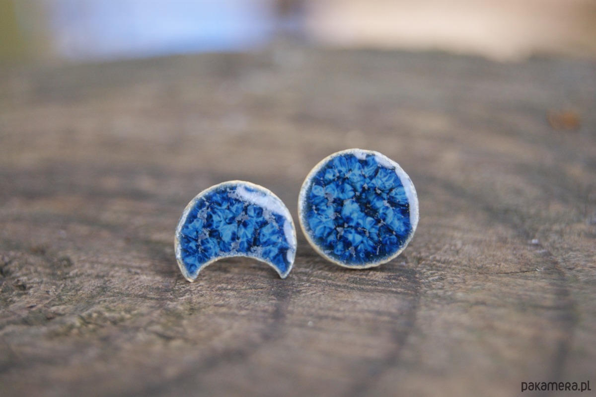 Wyjątkowe kolczyki ceramiczne inspirowane fazami księżyca – jeden w kształcie pełnego koła, drugi w formie delikatnego księżyca w nowiu. Ręcznie wykonane i szkliwione na głęboki, niebieski odcień, przywołują skojarzenia z nocnym niebem i jego spokojnym blaskiem.