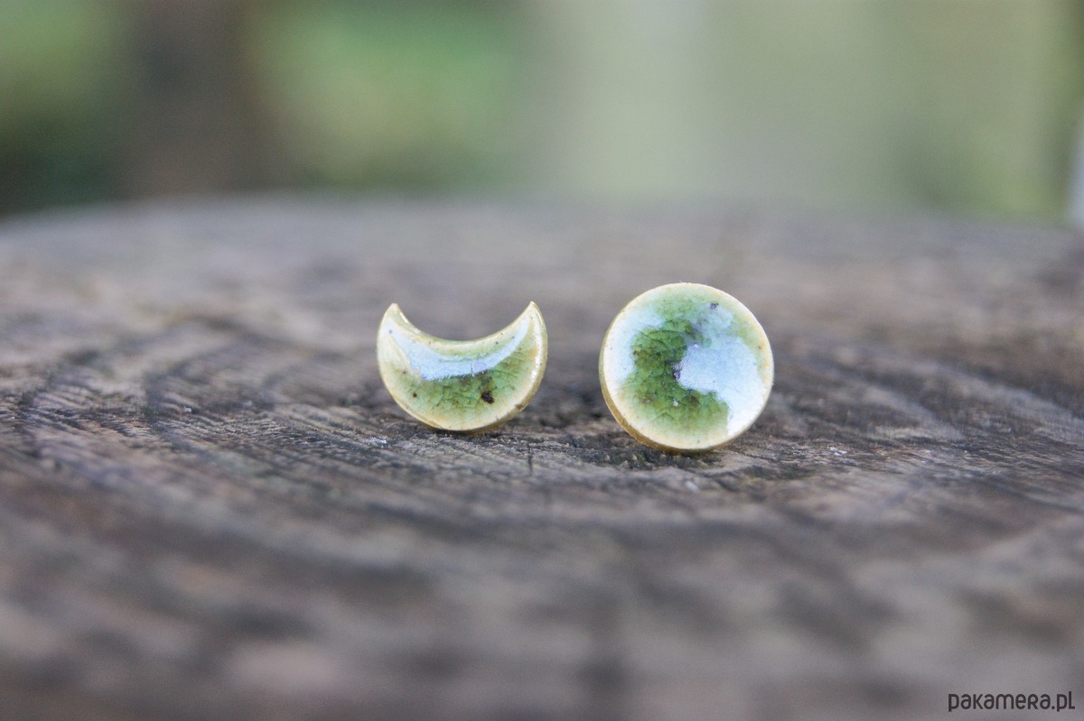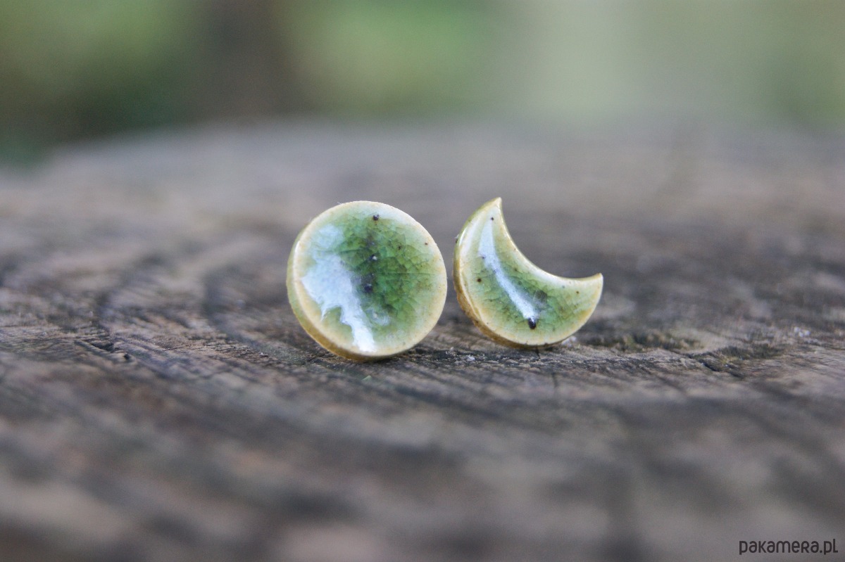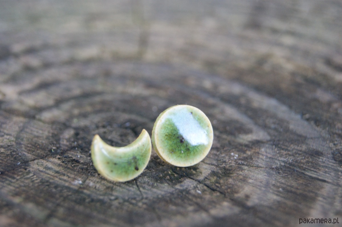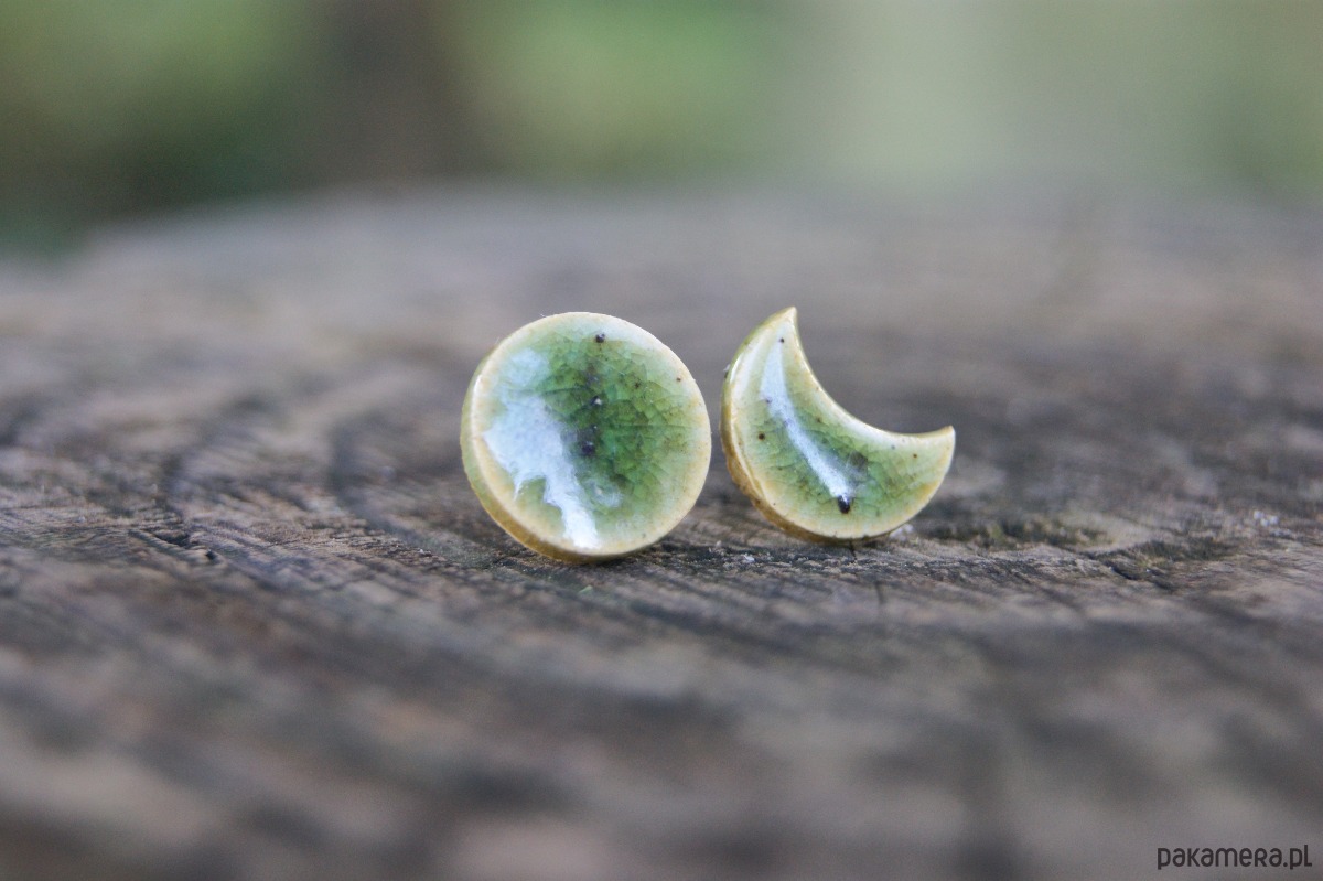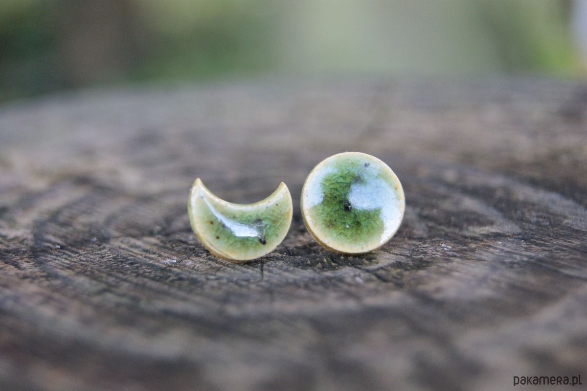 Subtelne, a jednocześnie pełne znaczenia kolczyki ceramiczne inspirowane fazami księżyca. Jeden element ma kształt pełnego koła, drugi delikatnego księżyca w nowiu. Pokryte szkliwem o zielonym odcieniu, który przywodzi na myśl roślinne energie, harmonię i odrodzenie.