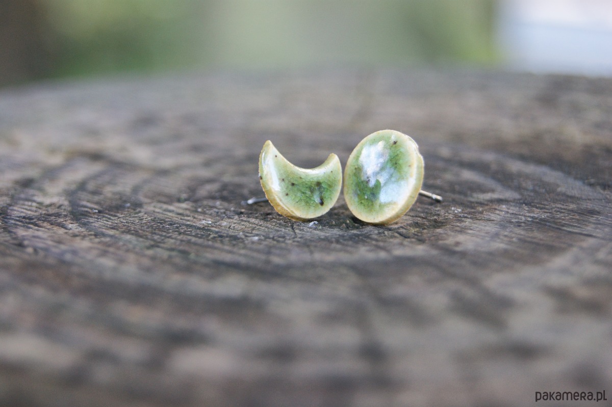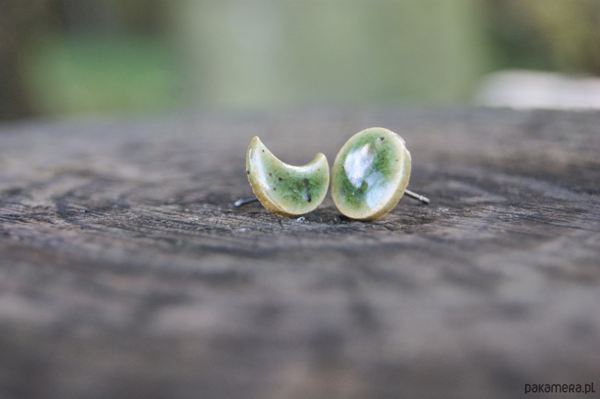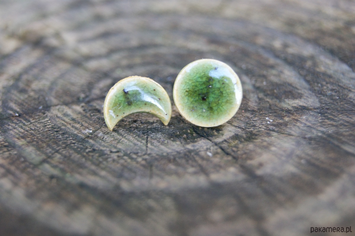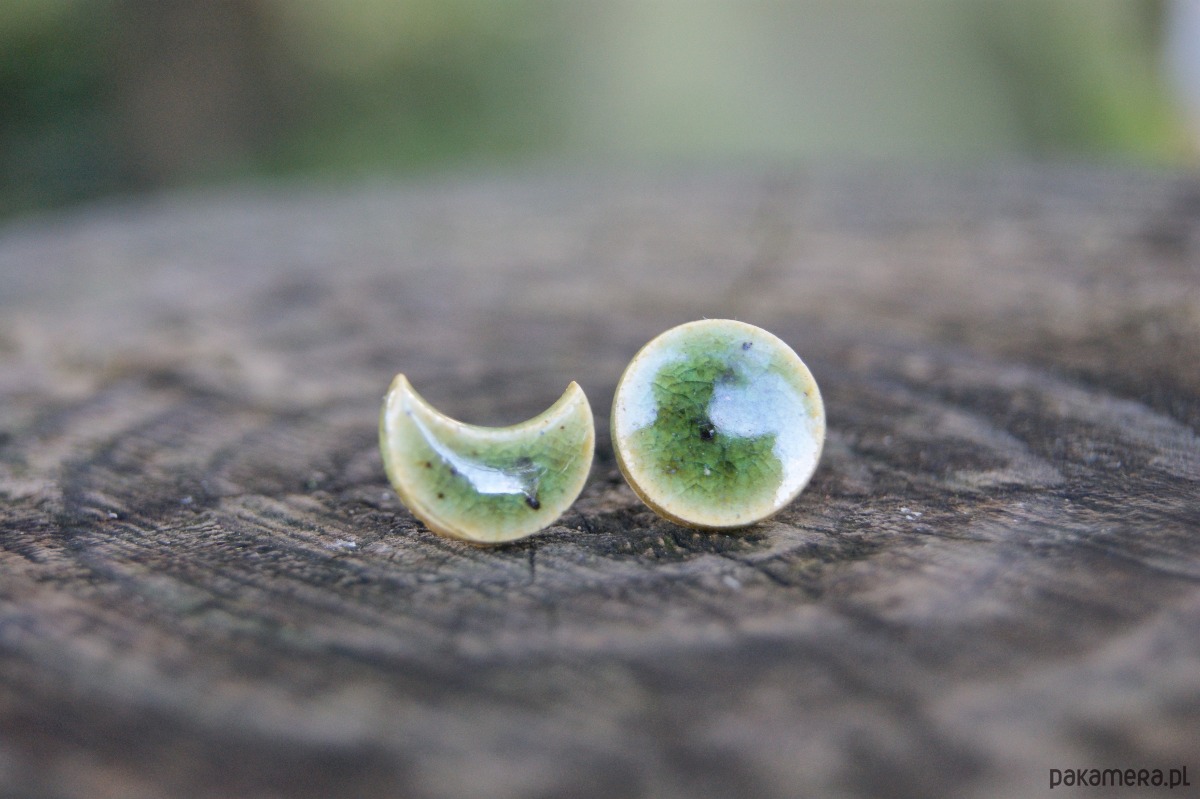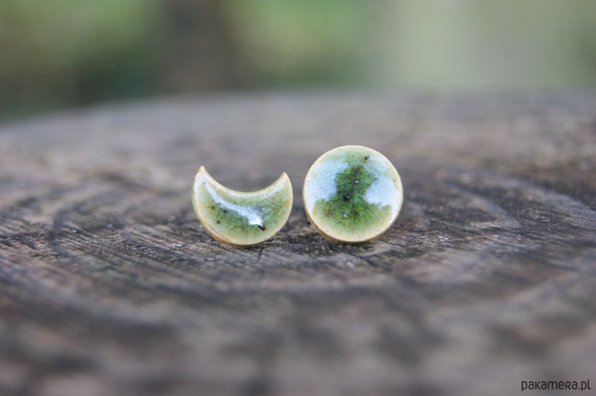 Subtelne, a jednocześnie pełne znaczenia kolczyki ceramiczne inspirowane fazami księżyca. Jeden element ma kształt pełnego koła, drugi delikatnego księżyca w nowiu. Pokryte szkliwem o zielonym odcieniu, który przywodzi na myśl roślinne energie, harmonię i odrodzenie.