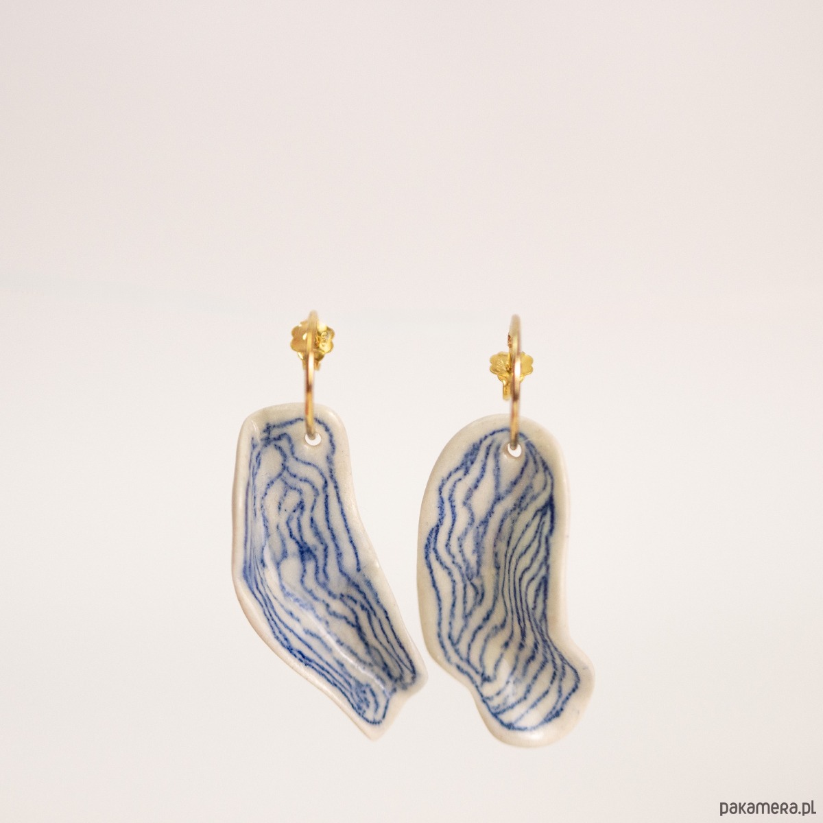 Kolczyki ceramiczne z elementem ze srebra pr. 925 w kolorze jasnego złota. Ceramiczne części w kształcie dwóch pofalowanych, owalnych płatków z rysowanym kobaltowym wzorem i błyszczącym transparentnym szkliwem. Element ceramiczny wypalony w wysokiej temperaturze 1250 st.C