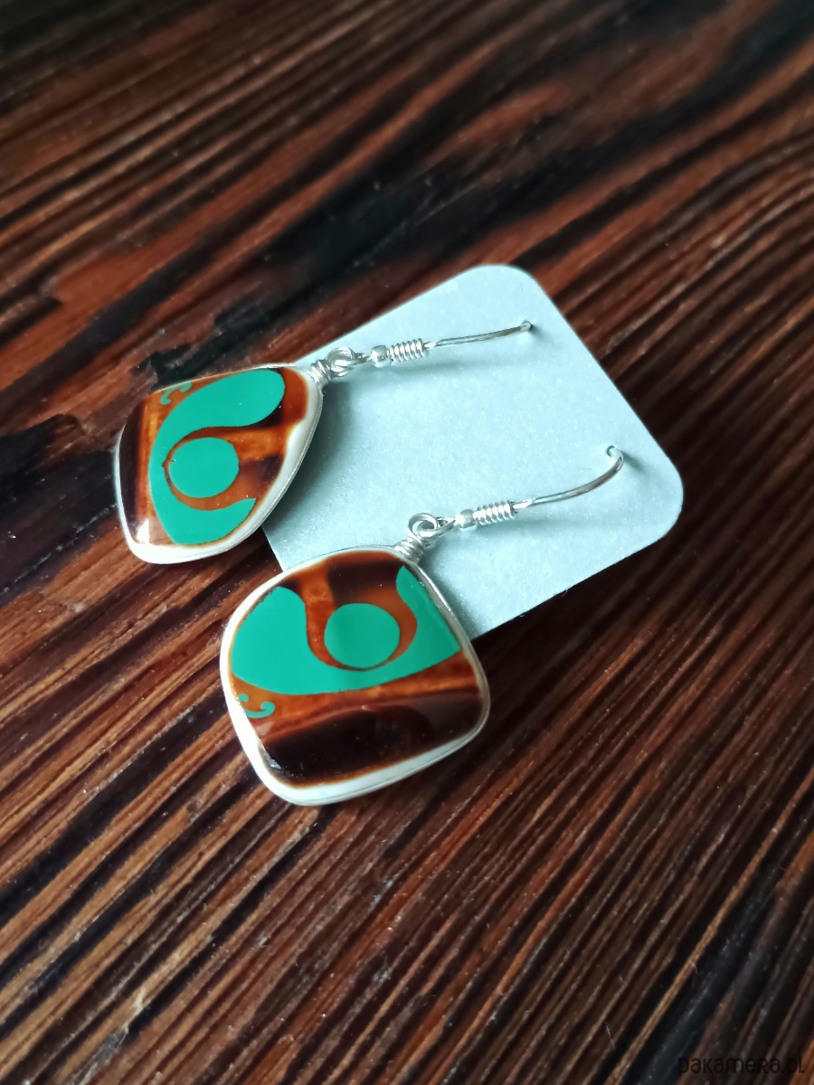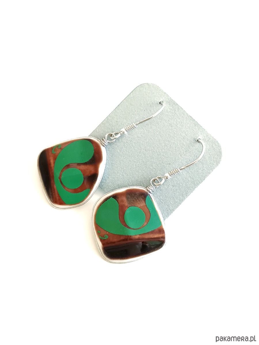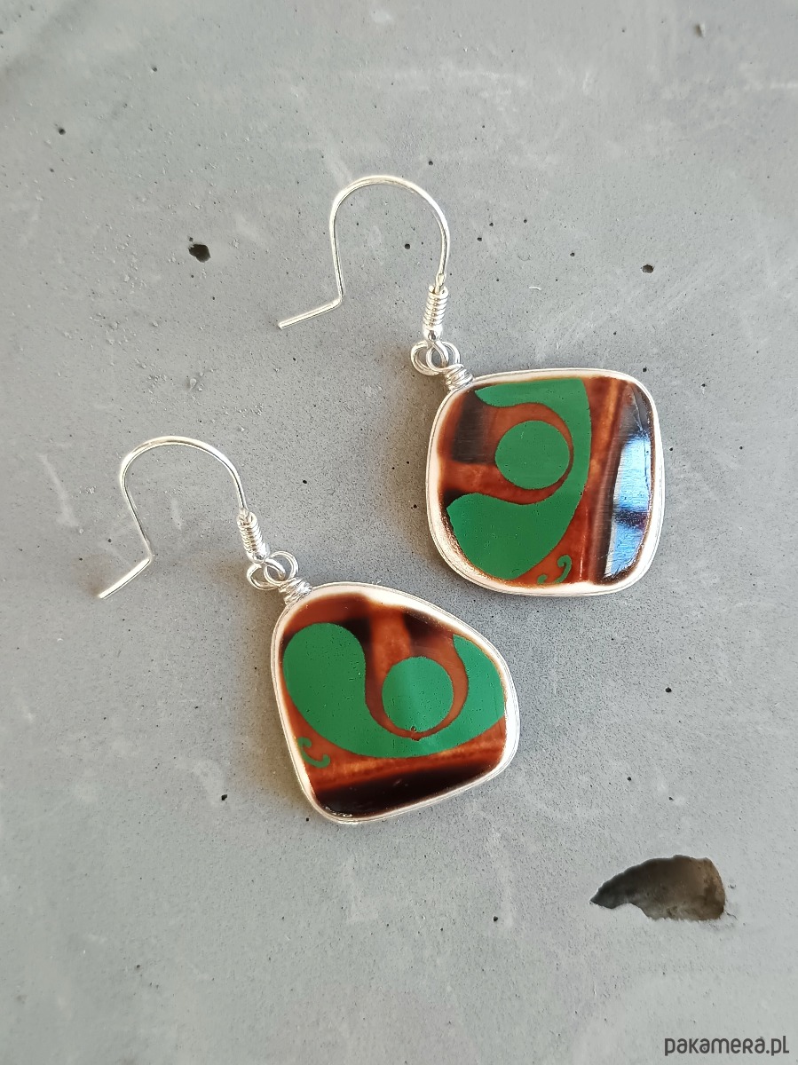 W Pruszkowie początkowo działała fabryka fajansu, założona przez Jakuba Teichfelda i Ludwika Asterbluma (późniejszych współwłaścicieli fabryki we Włocławku). Z kolei w latach 50. XX wieku zmodernizowano linię prudukcyjną, poszerzono ofertę i nadano nazwę "Zakłady Porcelitu Stołowego Pruszków". Oto wiszące kolczyki, które wykonałam z fragmentów stłuczonego kubka z porcelitu pruszkowskiego. Kawałki stłuczki oszlifowałam w nieregularne kształty, oprawiłam w drucik i połączyłam ze srebrnymi biglami. Ceramikę zeszlifowałam również z grubości, dzięki czemu kolczyki nie są ciężkie. Brzegi i tył pokryłam lakierem, co sprawia, że nie brudzą się i nie chłoną wilgoci. Oprawa oraz bigle wykonane są ze srebra próby 925 - wyrób jest antyalergiczny. Średnica elementów ceramicznych: 19 x 20 mm. Waga jednego kolczyka: 2,6 g. Unikat - każdy z moich wyrobów występuje w jednym egzemplarzu. Upcykling - nie reprodukuję wykorzystywanych wzorów, niczego nie domalowuję - wykorzystuję wyłącznie oryginalne naczynia i motywy, które się na nich znajdują. Tym samym, stłuczce z odzysku nadaję nowe życie.