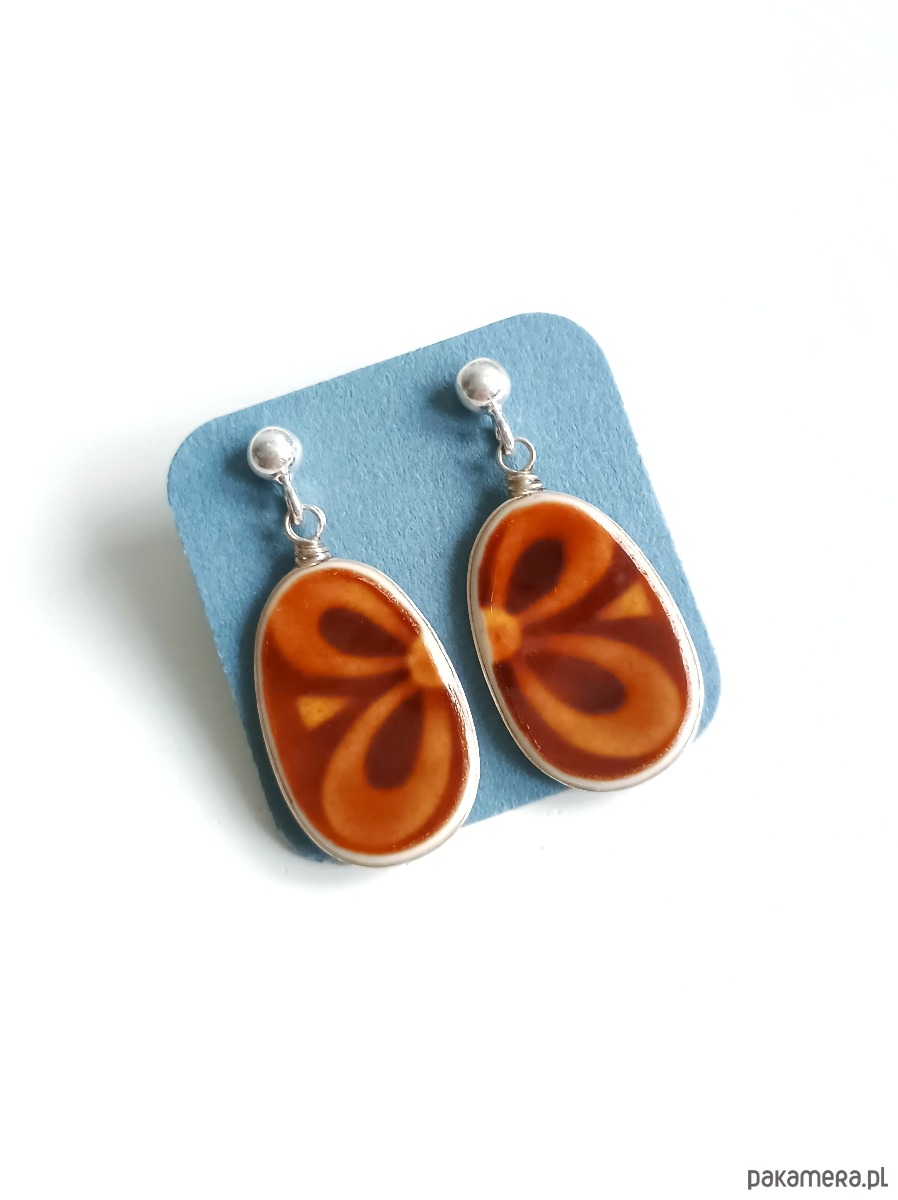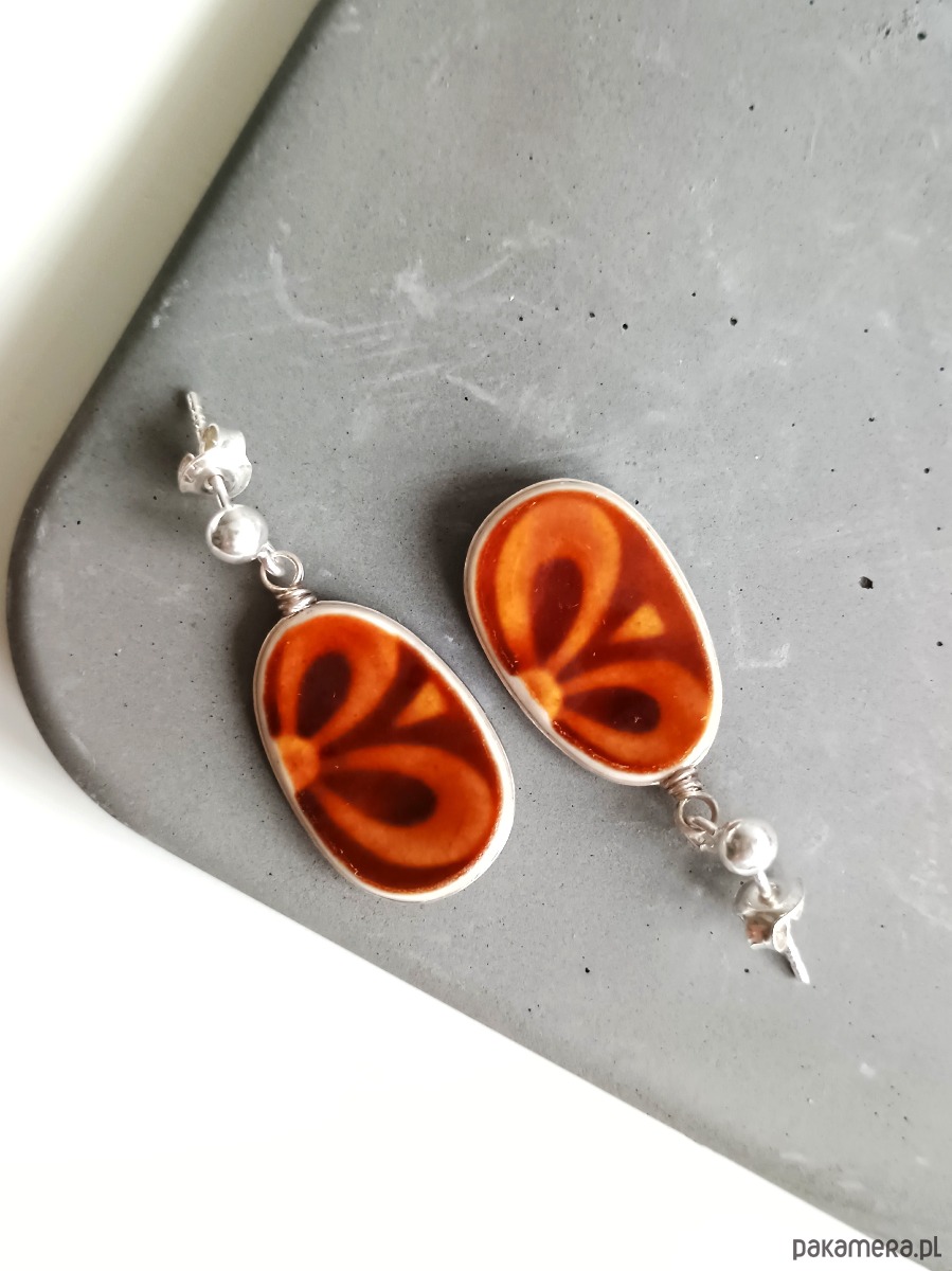 W Pruszkowie początkowo działała fabryka fajansu, założona przez Jakuba Teichfelda i Ludwika Asterbluma (późniejszych współwłaścicieli fabryki we Włocławku). Z kolei w latach 50. XX wieku zmodernizowano linię prudukcyjną, poszerzono ofertę i nadano nazwę "Zakłady Porcelitu Stołowego Pruszków". Oto wiszące kolczyki, które wykonałam z fragmentów stłuczonego talerza z porcelitu pruszkowskiego w kolorze brązowym. Kawałki stłuczki oszlifowałam w owalne kształty, oprawiłam w drucik i połączyłam ze srebrnymi sztyftami. Ceramikę zeszlifowałam również z grubości - jest cieńsza niż pierwotnie, dzięki czemu kolczyki nie są masywne. Brzegi i tył pokryłam lakierem, co sprawia, że nie brudzą się i nie chłoną wilgoci. Oprawa, sztyfty oraz baranki (zapięcia) wykonane są ze srebra próby 925 - wyrób jest antyalergiczny. Wymiary elementów ceramicznych: 14 x 21 mm. Waga jednego kolczyka: 1,7 g. Unikat - każdy z moich wyrobów występuje w jednym egzemplarzu. Upcykling - nie reprodukuję wykorzystywanych wzorów, niczego nie domalowuję - wykorzystuję wyłącznie oryginalne naczynia i motywy, które się na nich znajdują. Tym samym, stłuczce z odzysku nadaję nowe życie.