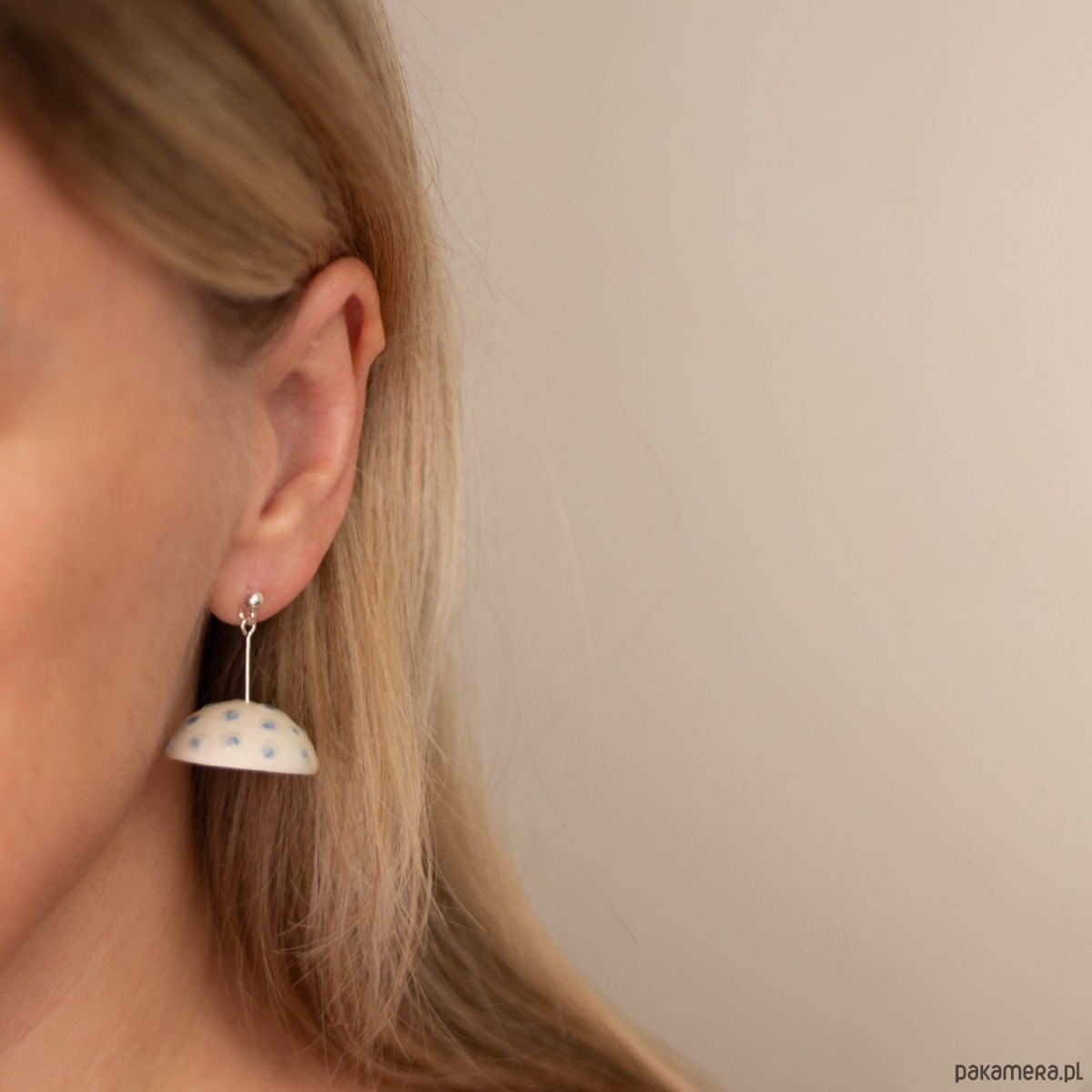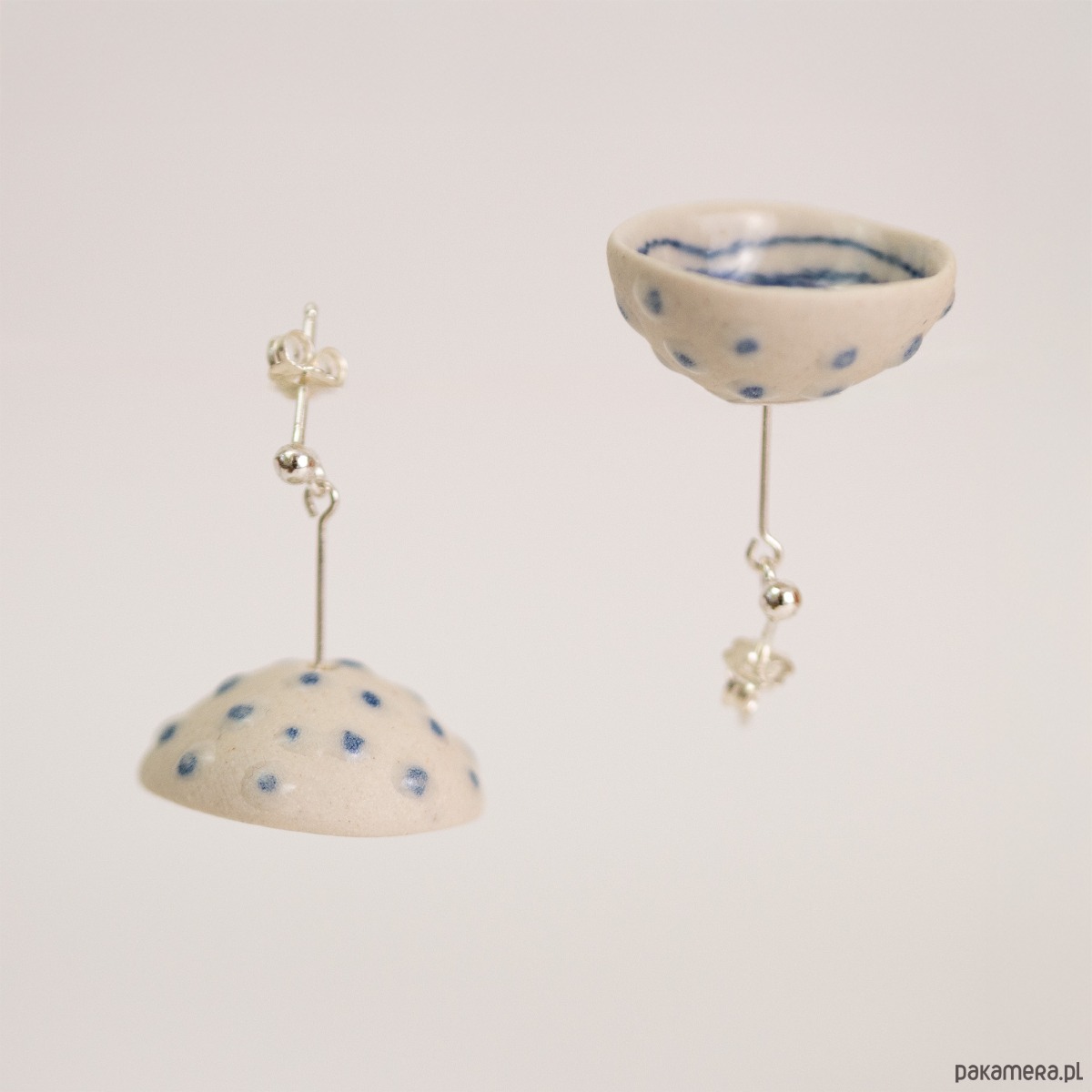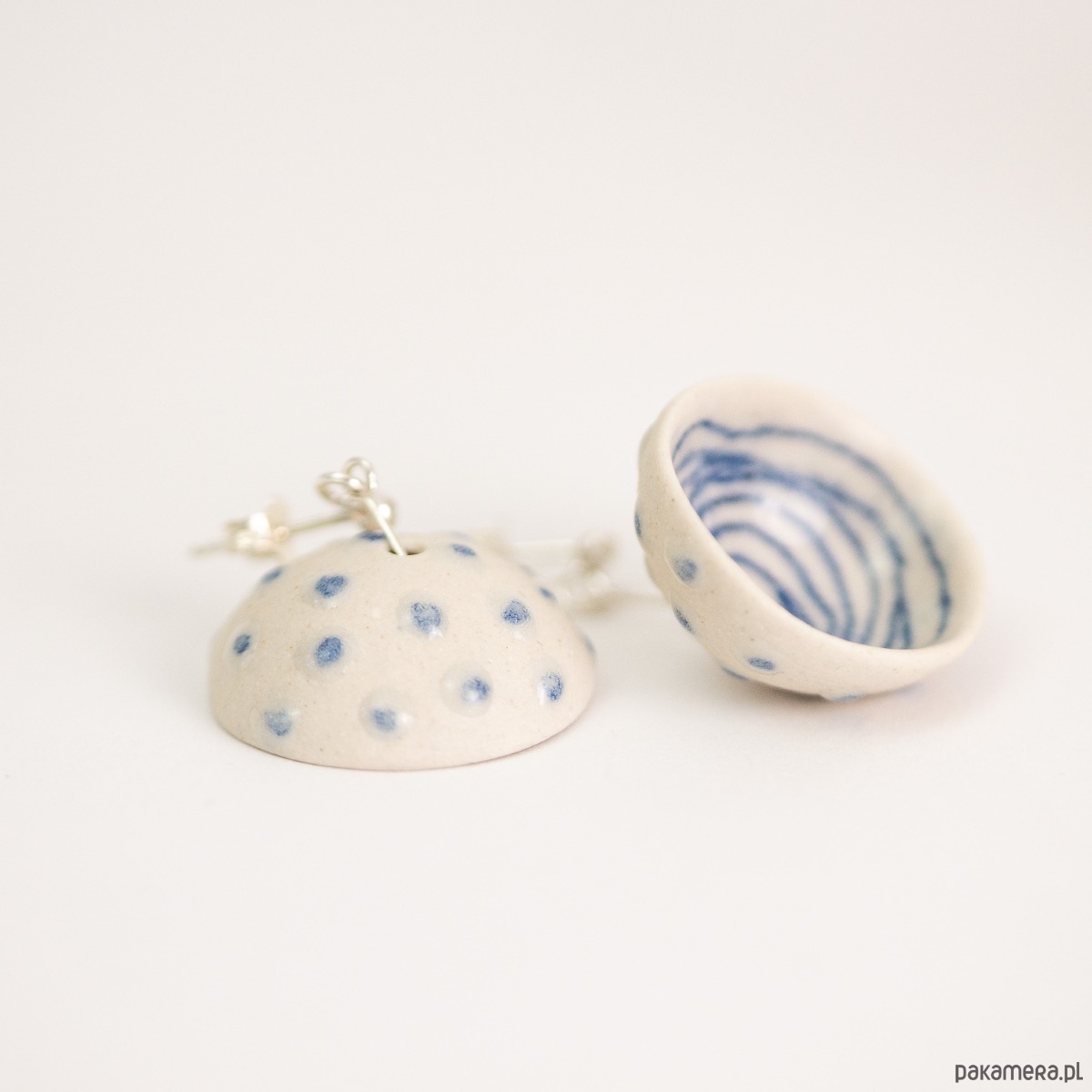 Kolczyki ceramiczne z elementem ze srebra pr. 925 w kolorze jasnego srebra. Półkule ręcznie formowane z gliny ceramicznej z rysowanym kobaltowym wzorem i błyszczącym transparentnym szkliwem. Ceramiczna część jest w kształcie pustej półkuli a wzór znajduje się po obu stronach - kropeczki na zewnątrz i nieregularne linie wewnątrz. Element ceramiczny wypalony jest w wysokiej temperaturze 1250 st.C.