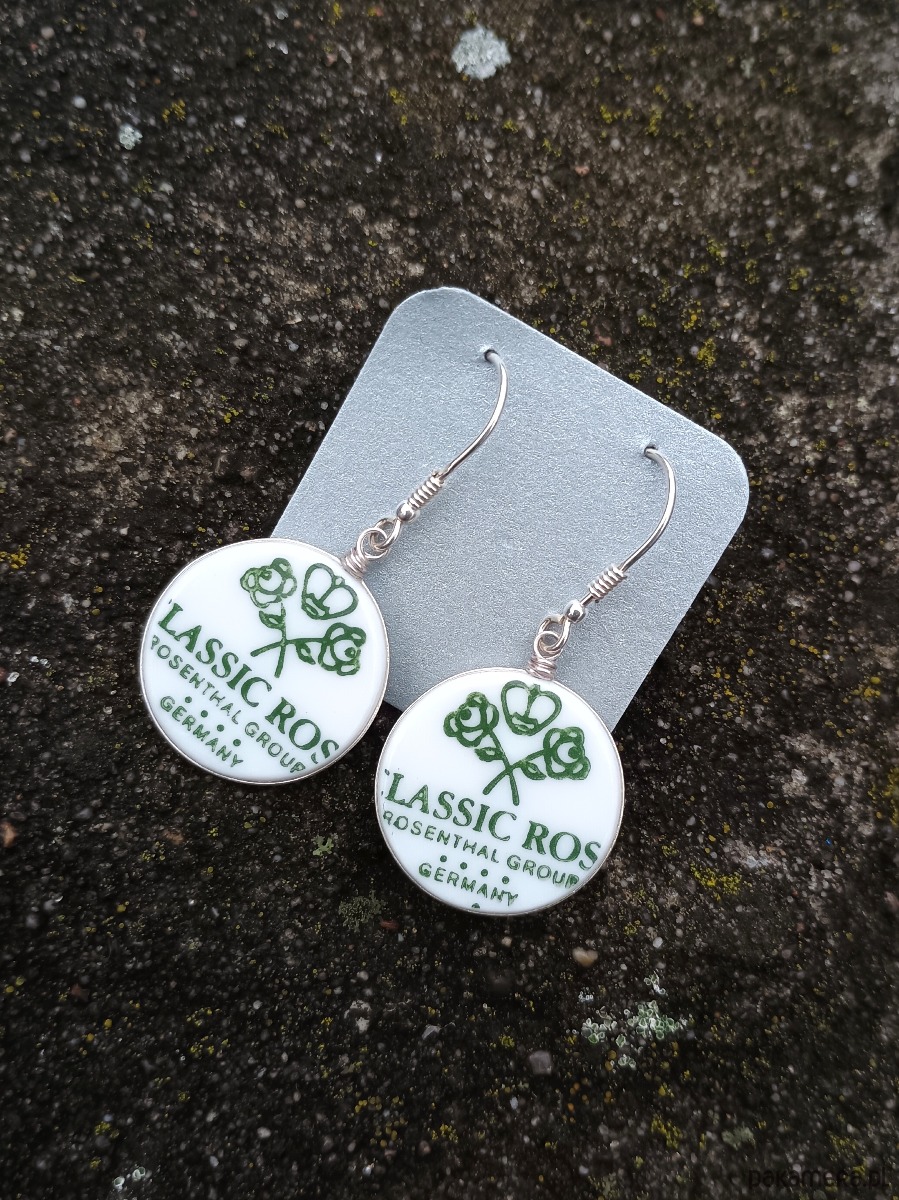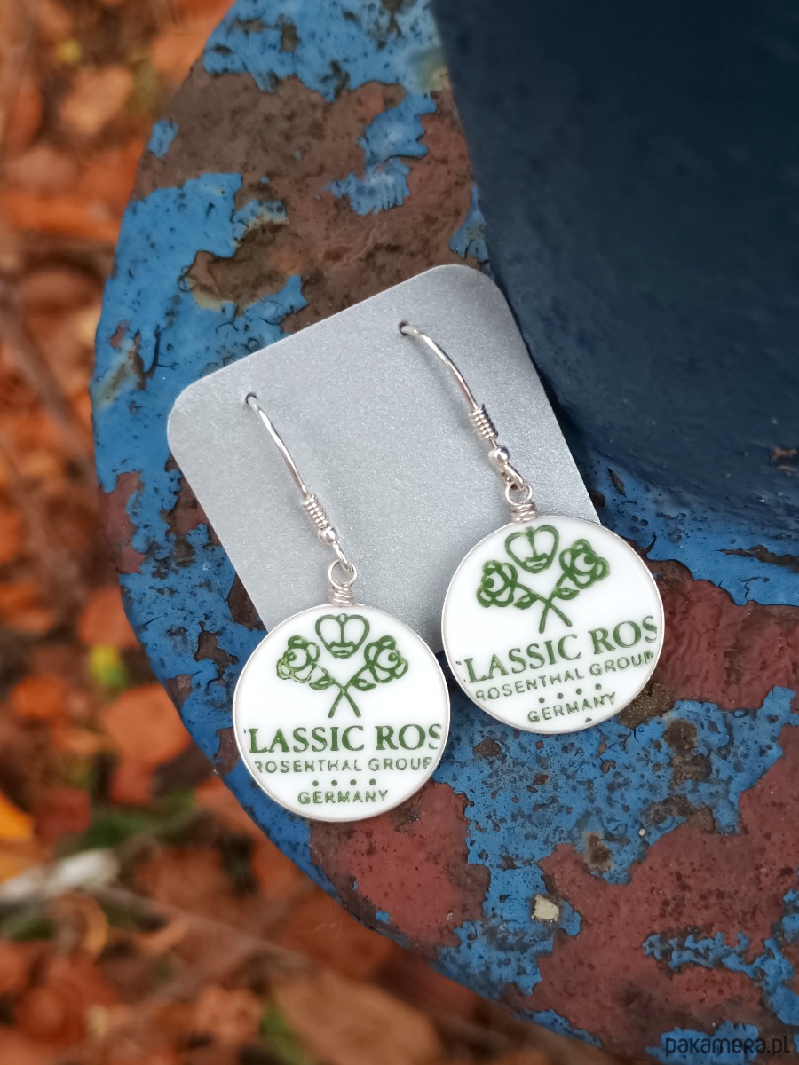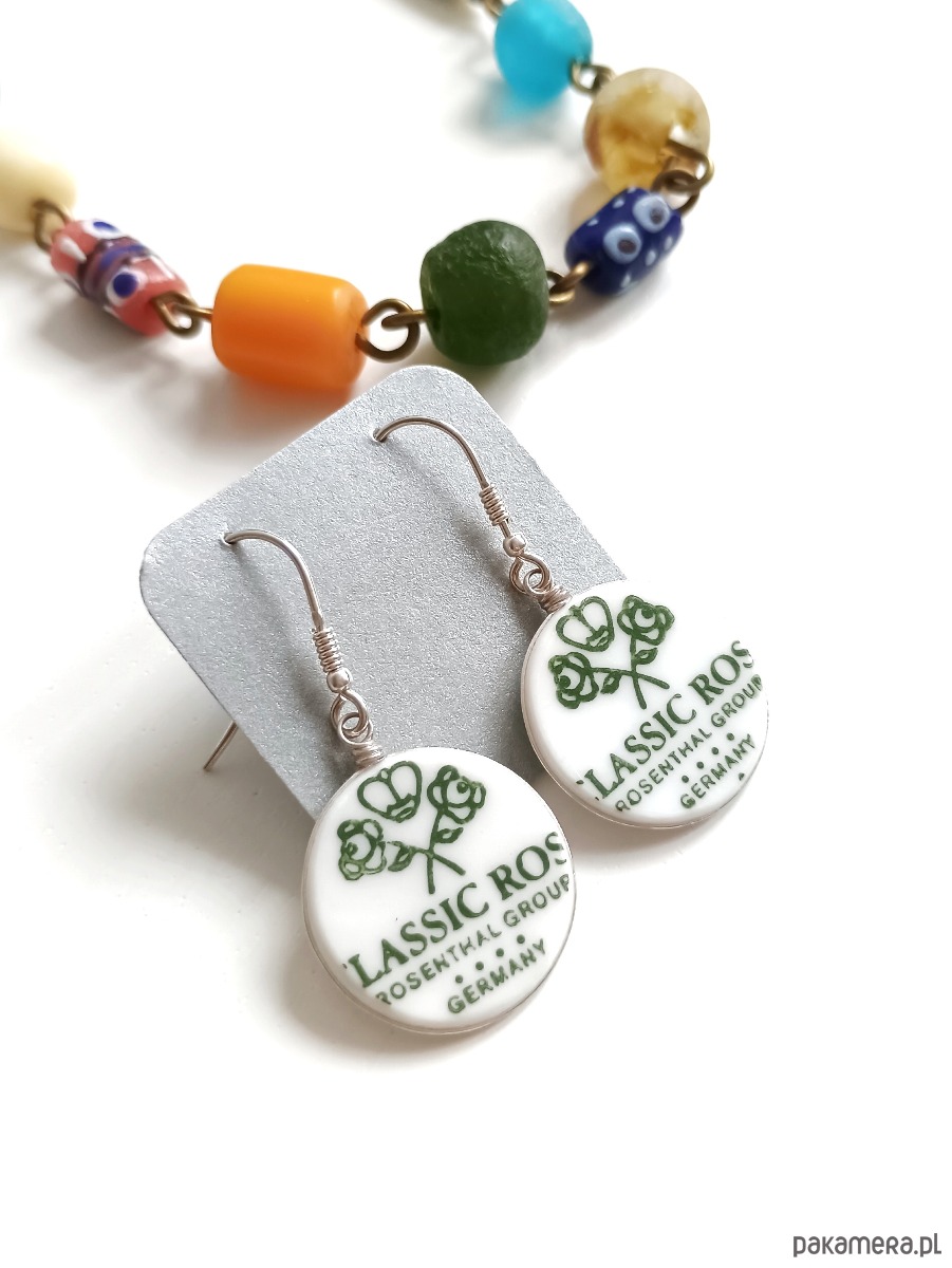Oto wiszące kolczyki, które wykonałam z fragmentów stłuczonych talerzy Rosenthal. Kawałki stłuczki oszlifowałam w okrągłe kształty, oprawiłam w drucik i połączyłam ze srebrnymi biglami. Ceramikę zeszlifowałam również z grubości - jest cieńsza niż pierwotnie, dzięki czemu kolczyki nie są masywne. Brzegi i tył pokryłam lakierem, co sprawia, że nie brudzą się i nie chłoną wilgoci. Oprawa, sztyfty oraz bigle (zapięcia) wykonane są ze srebra próby 925 - wyrób jest antyalergiczny. Średnica elementów ceramicznych: 20 mm. Waga jednego kolczyka: 2,3 g. Unikat - każdy z moich wyrobów występuje w jednym egzemplarzu. Upcykling - nie reprodukuję wykorzystywanych wzorów, niczego nie domalowuję - wykorzystuję wyłącznie oryginalne naczynia i motywy, które się na nich znajdują. Tym samym, stłuczce z odzysku nadaję nowe życie.