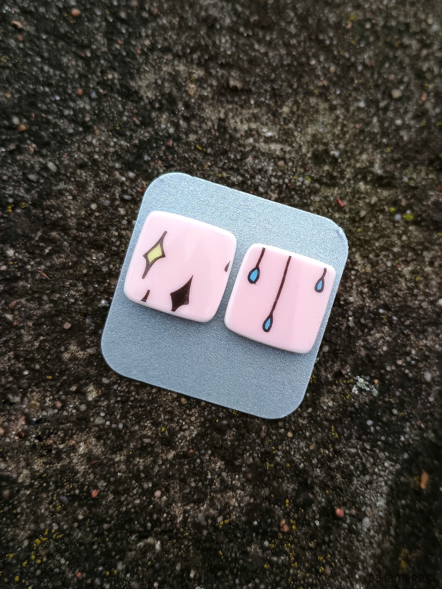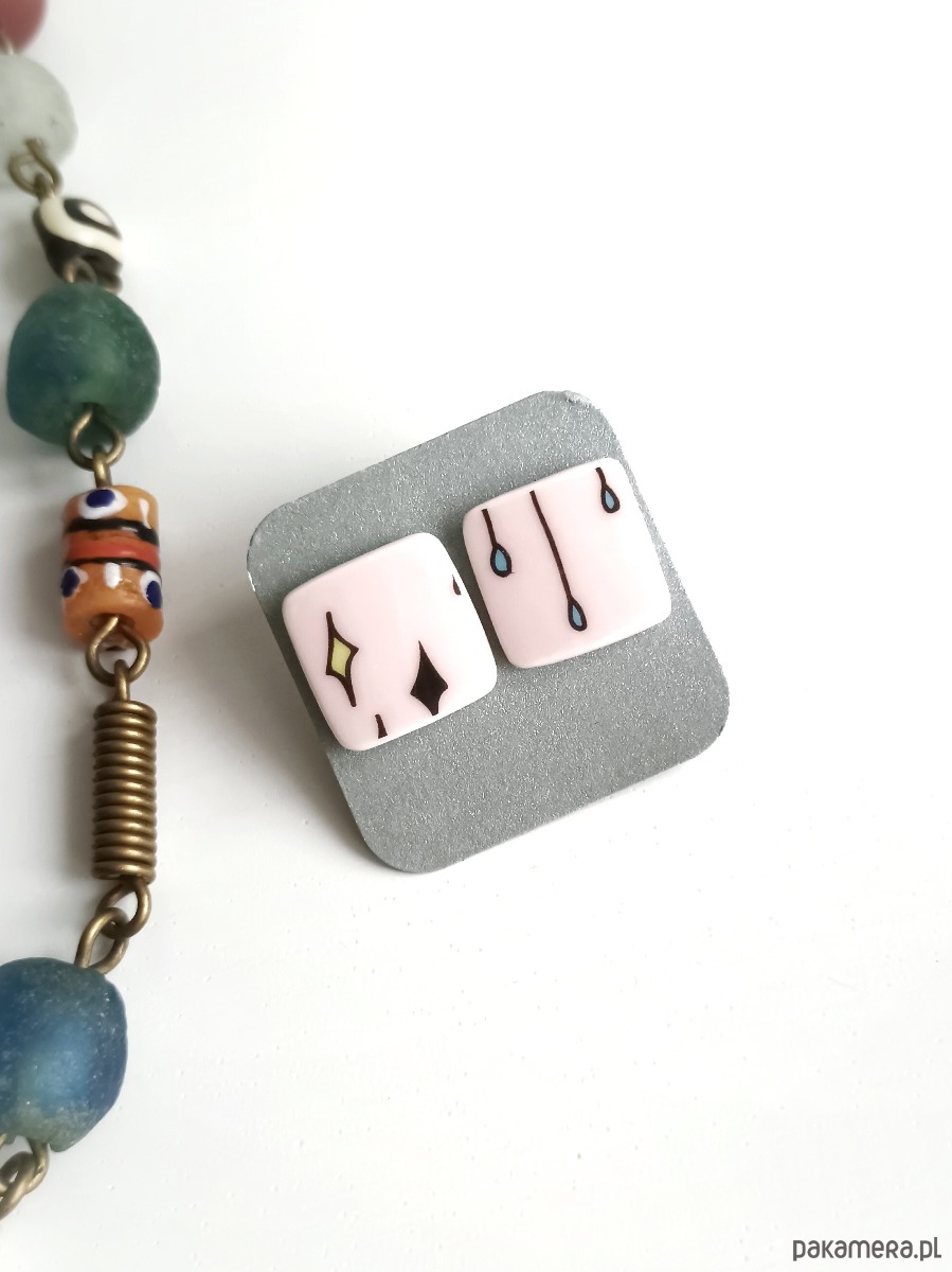Kwadratowe kolczyki, które wykonałam z fragmentów stłuczonego kubka w różowe wzory. Kawałki stłuczki oszlifowałam i połączyłam ze srebrnymi sztyftami. Ceramikę zeszlifowałam również z grubości - jest cieńsza niż pierwotnie, dzięki czemu kolczyki nie są masywne. Brzegi pokryłam lakierem, co sprawia, że nie brudzą się i nie chłoną wilgoci. Sztyfty oraz baranki (zapięcia) wykonane są ze srebra próby 925 - wyrób jest antyalergiczny. Wymiary elementów ceramicznych: 15 x 15 mm. Unikat - każdy z moich wyrobów występuje w jednym egzemplarzu. Upcykling - nie reprodukuję wykorzystywanych wzorów, niczego nie domalowuję - wykorzystuję wyłącznie oryginalne naczynia i motywy, które się na nich znajdują. Tym samym, stłuczce z odzysku nadaję nowe życie.