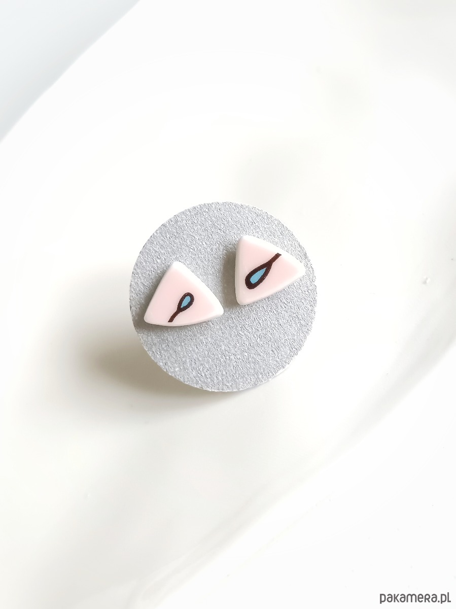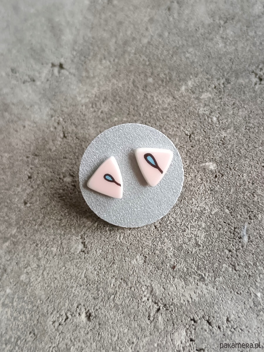 Malutkie trójkątne kolczyki, które wykonałam z fragmentów stłuczonego kubka w różowe wzory. Kawałki stłuczki oszlifowałam i połączyłam ze srebrnymi sztyftami. Ceramikę zeszlifowałam również z grubości - jest cieńsza niż pierwotnie, dzięki czemu kolczyki nie są masywne. Brzegi pokryłam lakierem, co sprawia, że nie brudzą się i nie chłoną wilgoci. Sztyfty oraz baranki (zapięcia) wykonane są ze srebra próby 925 - wyrób jest antyalergiczny. Wymiary elementów ceramicznych: 8 x 8 mm. Unikat - każdy z moich wyrobów występuje w jednym egzemplarzu. Upcykling - nie reprodukuję wykorzystywanych wzorów, niczego nie domalowuję - wykorzystuję wyłącznie oryginalne naczynia i motywy, które się na nich znajdują. Tym samym, stłuczce z odzysku nadaję nowe życie.