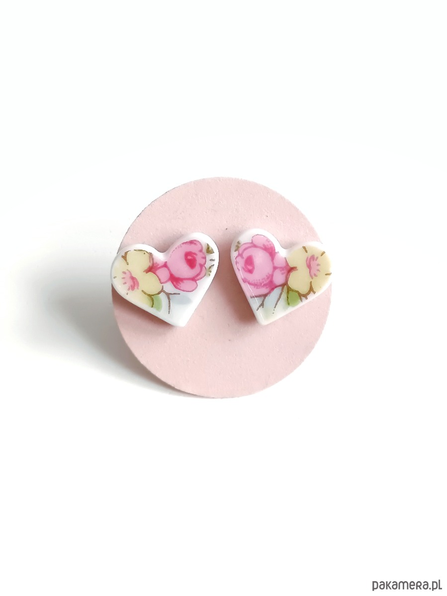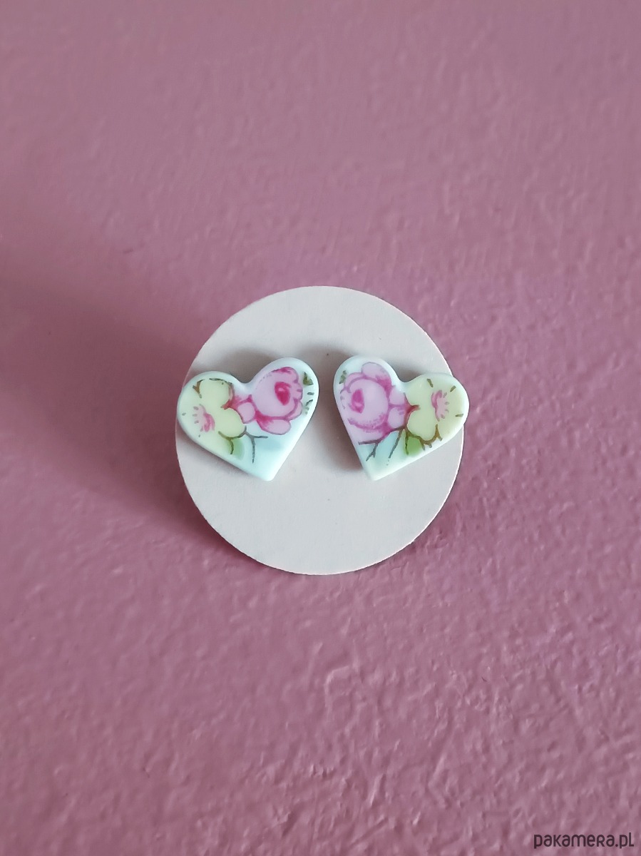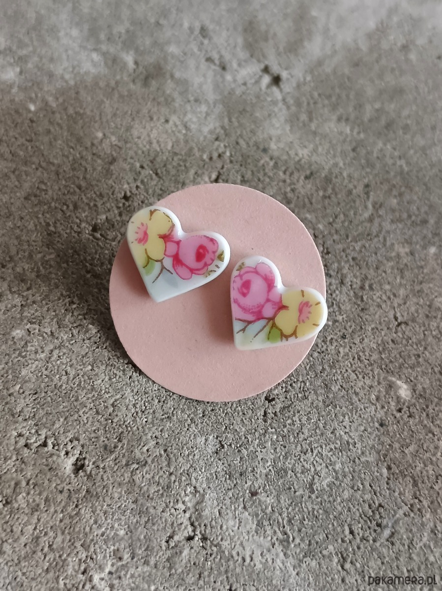 Oto nieduże kolczyki, które wykonałam z fragmentów starej porcelany - stłuczonego talerza w delikatne kwiatki. Kawałki stłuczki oszlifowałam w kształty serduszek i połączyłam ze srebrnymi sztyftami. Ceramikę zeszlifowałam również z grubości - jest cieńsza niż pierwotnie, dzięki czemu kolczyki nie są masywne. Brzegi i tył pokryłam lakierem, co sprawia, że nie brudzą się i nie chłoną wilgoci. Sztyfty oraz baranki (zapięcia) wykonane są ze srebra próby 925 - wyrób jest antyalergiczny. Wymiary elementów ceramicznych: 11 x 12 mm. Unikat - każdy z moich wyrobów występuje w jednym egzemplarzu. Upcykling - nie reprodukuję wykorzystywanych wzorów, niczego nie domalowuję - wykorzystuję wyłącznie oryginalne naczynia i motywy, które się na nich znajdują. Tym samym, stłuczce z odzysku nadaję nowe życie.