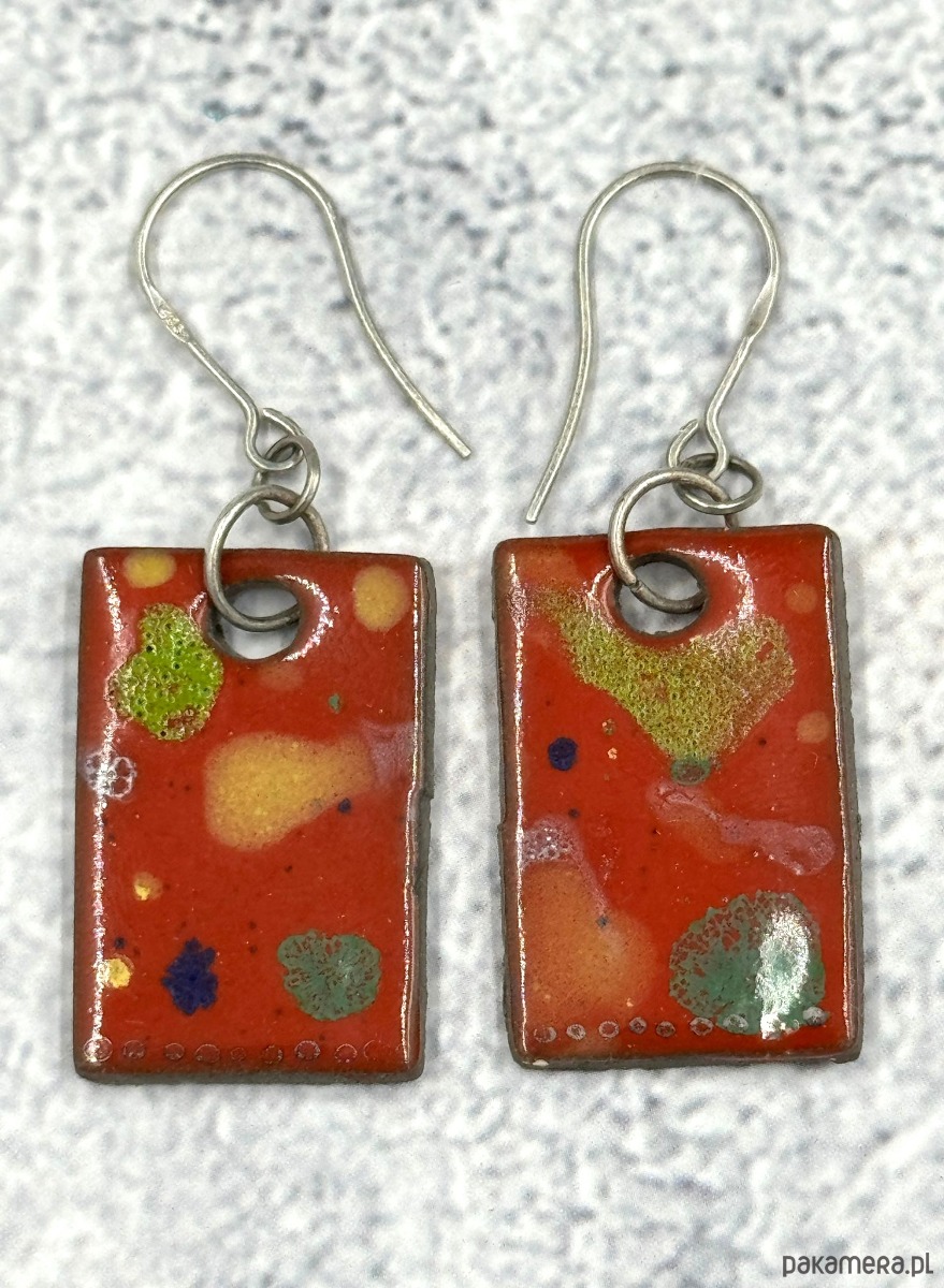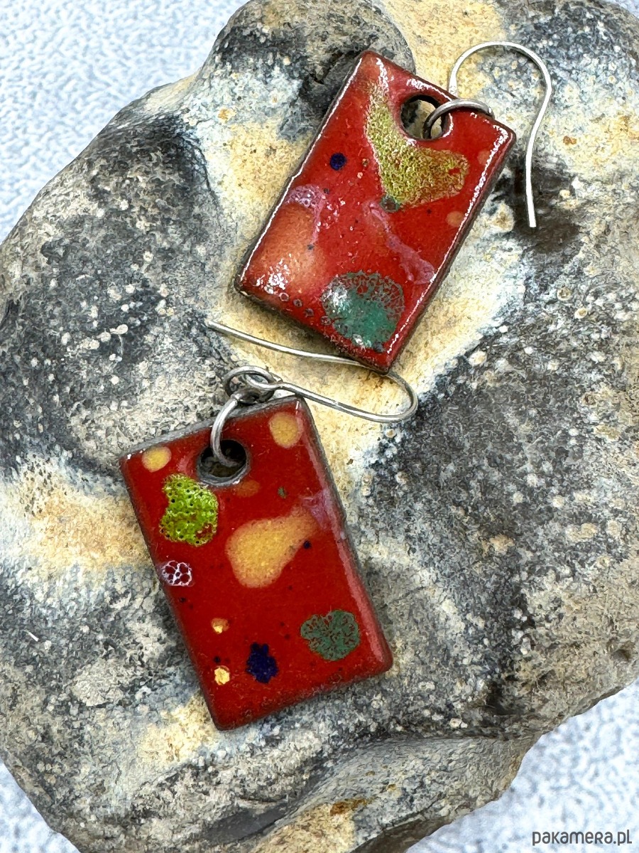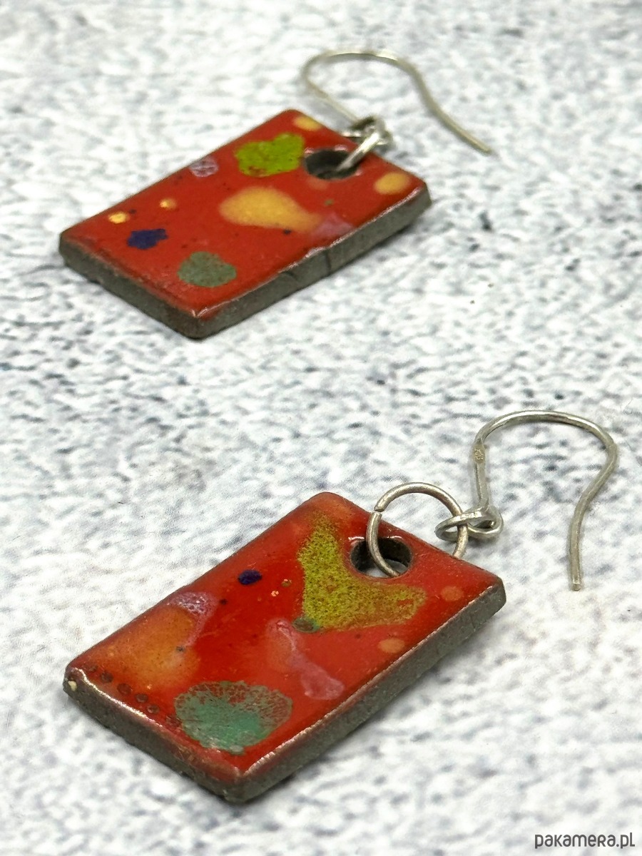 Nowoczesne, unikatowe kolczyki, które będą stanowiły mocny, pozytywny akcent Twojej stylizacji. Wykonane z grafitowej gliny, która stanowi o kolorze odwróciła. Pokryte błyszczącym, energetycznym szkliwem, usianym dużymi plamami podstawowych kolorów. Srebrne bigle z próbą. Prostokątna zawieszka wielkości 3x2 cm. Długość z biglem - 5 cm.