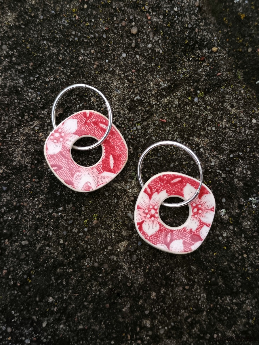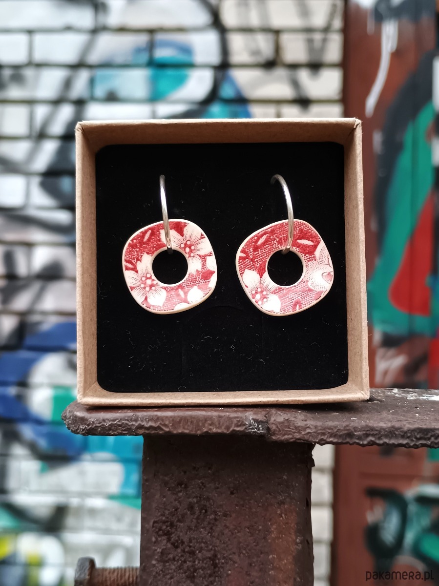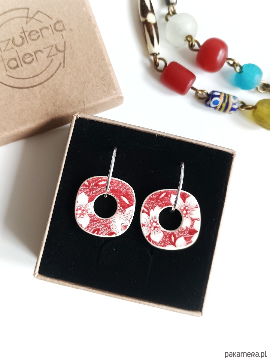Oto wiszące kolczyki, które wykonałam z fragmentów stłuczonej filiżanki fajansowej Villeroy & Boch w czerwone wzory kwiatowe. Kawałki stłuczki oszlifowałam wopływowe kwadratowe kształty i połączyłam ze srebrnymi zapięciami. Ceramikę zeszlifowałam z grubości, dzięki czemu kolczyki nie są ciężkie. Brzegi i tył pokryłam lakierem, co sprawia, że nie brudzą się i nie chłoną wilgoci. Zapięcie, czyli koła o średnicy 19 mm wykonane są ze srebra próby 925 - wyrób jest antyalergiczny. Wymiary elementów ceramicznych: 21 x 21 mm. Waga jednego kolczyka: 2,1 g. Unikat - każdy z moich wyrobów występuje w jednym egzemplarzu. Upcykling - nie reprodukuję wykorzystywanych wzorów, niczego nie domalowuję - wykorzystuję wyłącznie oryginalne naczynia i motywy, które się na nich znajdują. Tym samym, stłuczce z odzysku nadaję nowe życie.