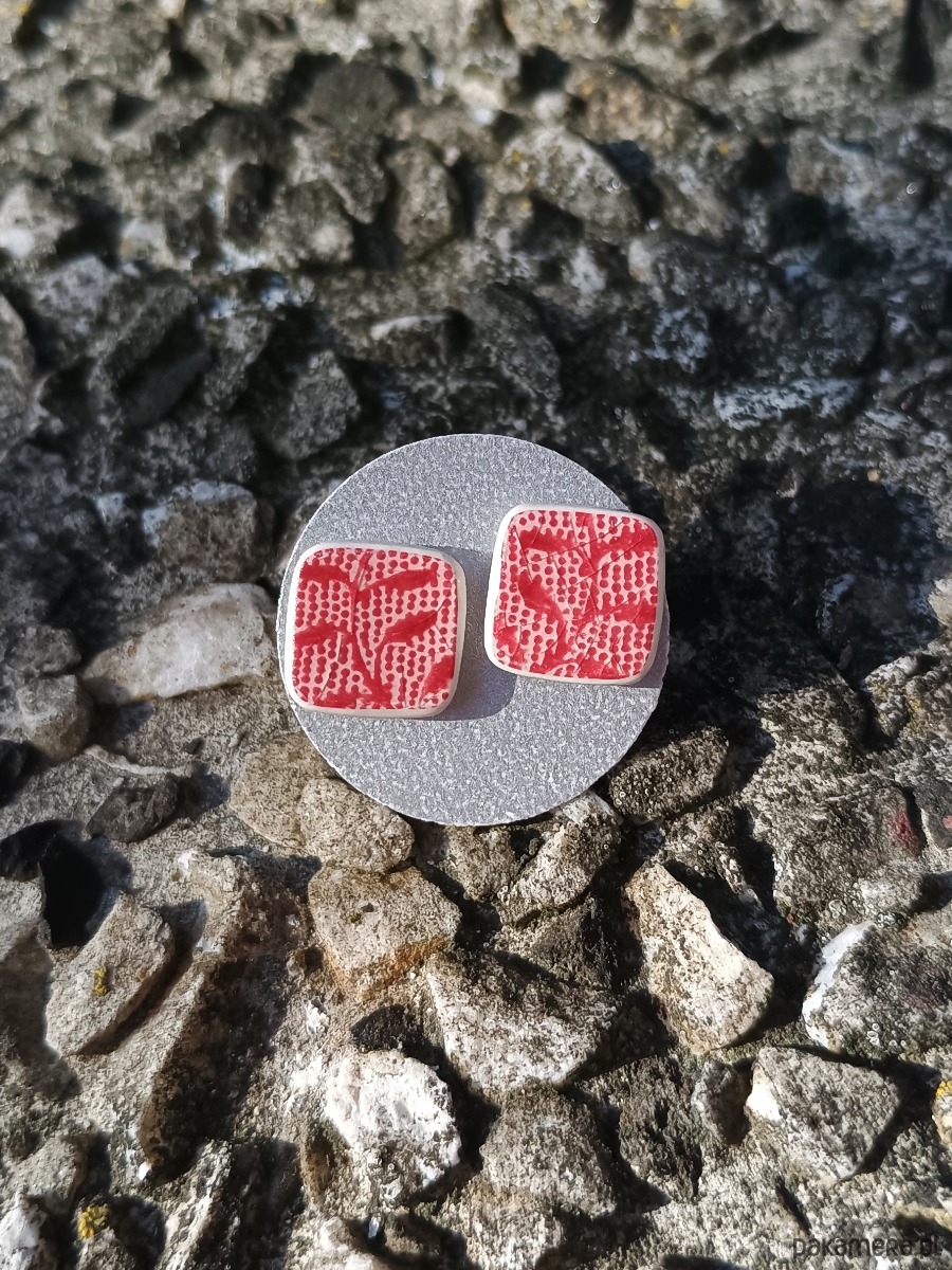 Kolczyki, które wykonałam z fragmentów stłuczonego talerza Villeroy & Boch Burgenland w czerwone wzory roślinne. Kawałki stłuczki oszlifowałam w opływowe kwadratowe kształty i połączyłam ze srebrnymi sztyftami. Ceramikę zeszlifowałam również z grubości - jest cieńsza niż pierwotnie, dzięki czemu kolczyki nie są masywne. Brzegi pokryłam lakierem, co sprawia, że nie brudzą się i nie chłoną wilgoci. Sztyfty oraz baranki (zapięcia) wykonane są ze srebra próby 925 - wyrób jest antyalergiczny. Wymiary elementów ceramicznych: 10 x 10 mm. Unikat - każdy z moich wyrobów występuje w jednym egzemplarzu. Upcykling - nie reprodukuję wykorzystywanych wzorów, niczego nie domalowuję - wykorzystuję wyłącznie oryginalne naczynia i motywy, które się na nich znajdują. Tym samym, stłuczce z odzysku nadaję nowe życie.