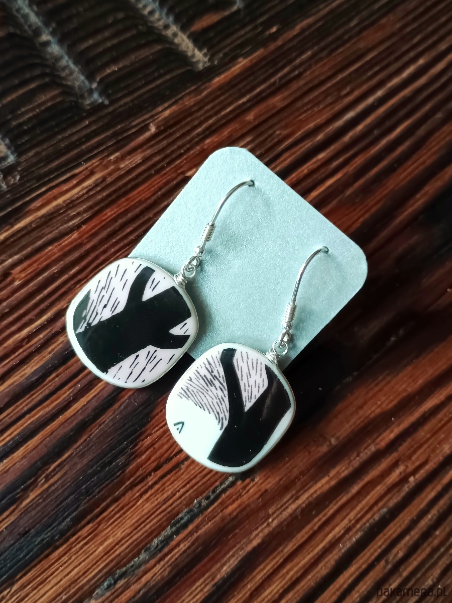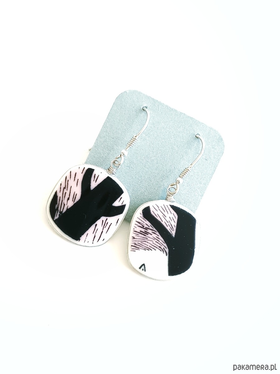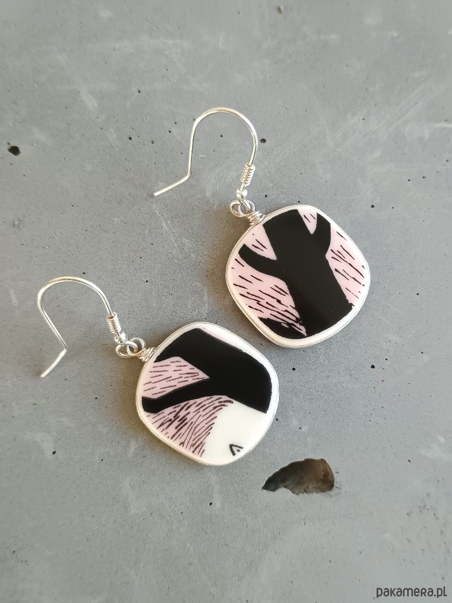 Owalne wiszące kolczyki, które wykonałam z fragmentów stłuczonego kubka w czarno różowe wzory. Kawałki stłuczki oszlifowałam, oprawiłam w drucik i połączyłam ze srebrnymi biglami. Ceramikę zeszlifowałam również z grubości - jest cieńsza niż pierwotnie, dzięki czemu kolczyki nie są masywne. Brzegi i tył pokryłam lakierem, co sprawia, że nie brudzą się i nie chłoną wilgoci. Oprawa oraz bigle (zapięcia) wykonane są ze srebra próby 925 - wyrób jest antyalergiczny. Wymiary elementów ceramicznych: 19 x 21 mm. Waga jednego kolczyka: 2,6 g. Unikat - każdy z moich wyrobów występuje w jednym egzemplarzu. Upcykling - nie reprodukuję wykorzystywanych wzorów, niczego nie domalowuję - wykorzystuję wyłącznie oryginalne naczynia i motywy, które się na nich znajdują. Tym samym, stłuczce z odzysku nadaję nowe życie.