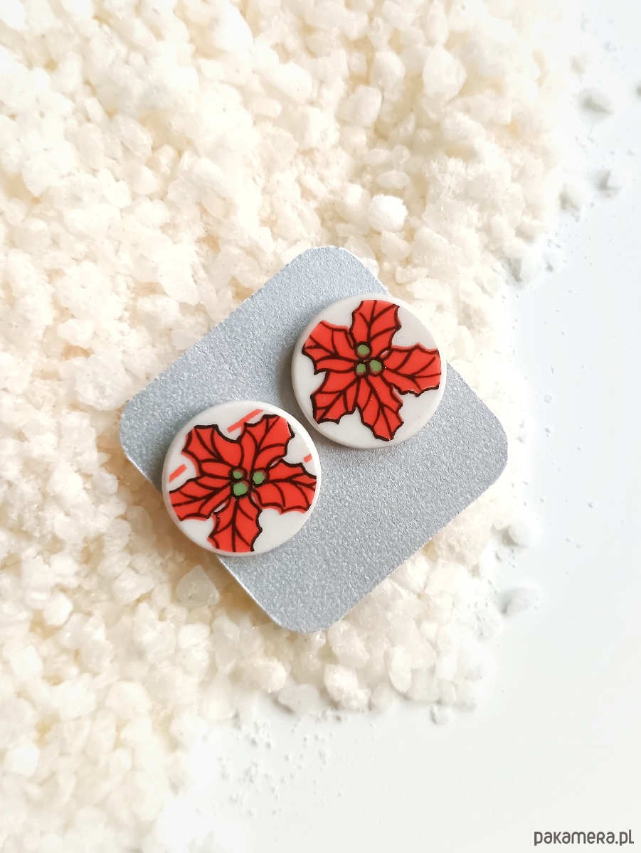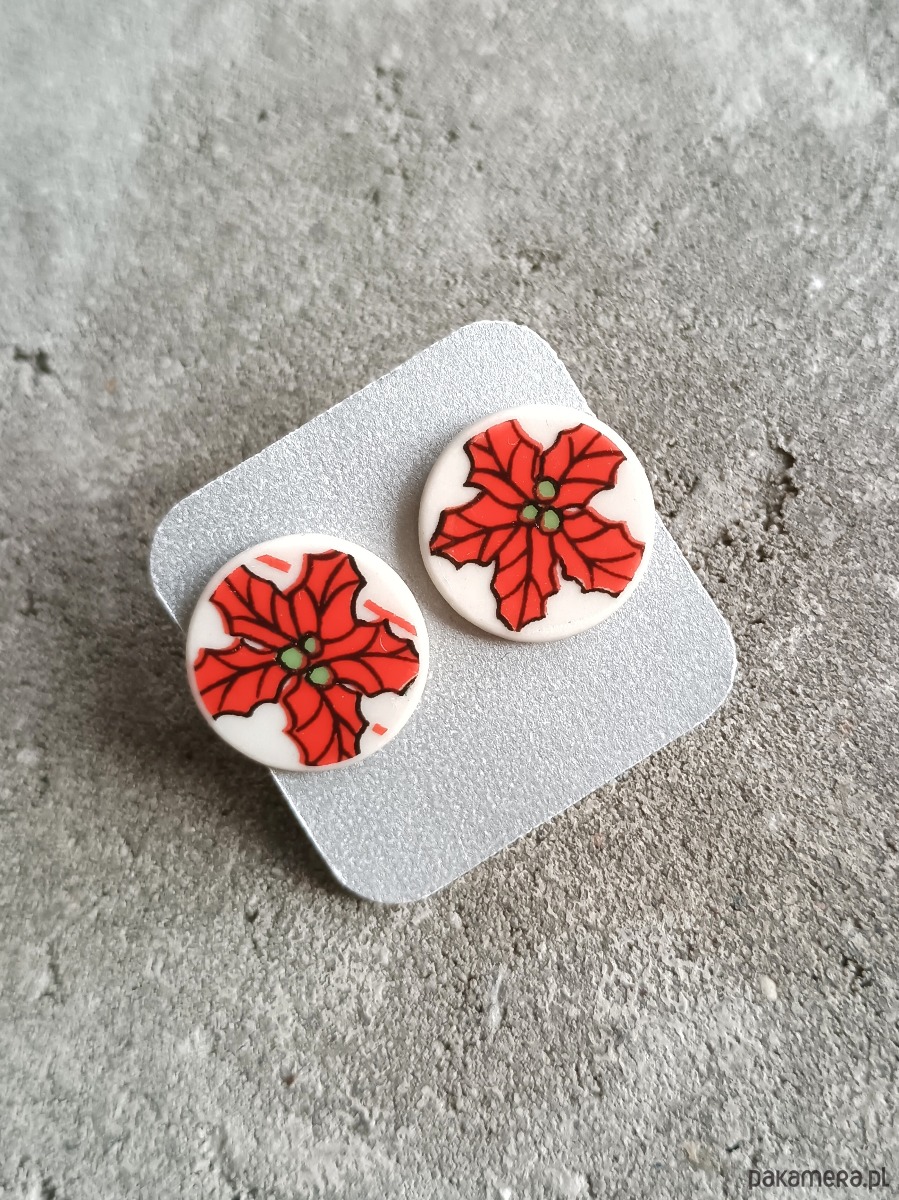 Duże okrągłe kolczyki, które wykonałam z fragmentów stłuczonego talerza w wilczomlecze nadobne, tzw. gwiazdy betlejemskie. Kawałki stłuczki oszlifowałam i połączyłam ze srebrnymi sztyftami. Ceramikę zeszlifowałam również z grubości - jest cieńsza niż pierwotnie, dzięki czemu kolczyki nie są masywne. Brzegi pokryłam lakierem, co sprawia, że nie brudzą się i nie chłoną wilgoci. Sztyfty oraz baranki (zapięcia) wykonane są ze srebra próby 925 - wyrób jest antyalergiczny. Średnica elementów ceramicznych: 17 mm. Unikat - każdy z moich wyrobów występuje w jednym egzemplarzu. Upcykling - nie reprodukuję wykorzystywanych wzorów, niczego nie domalowuję - wykorzystuję wyłącznie oryginalne naczynia i motywy, które się na nich znajdują. Tym samym, stłuczce z odzysku nadaję nowe życie.