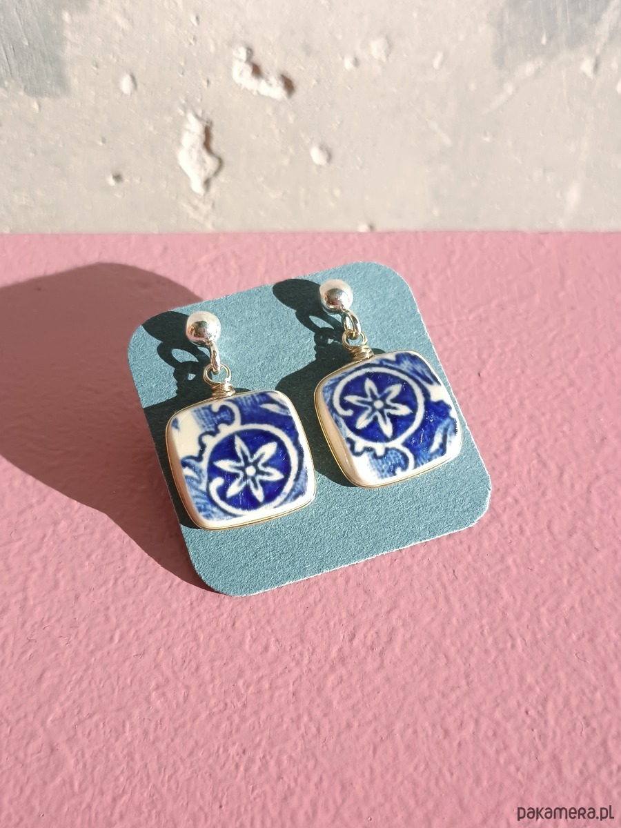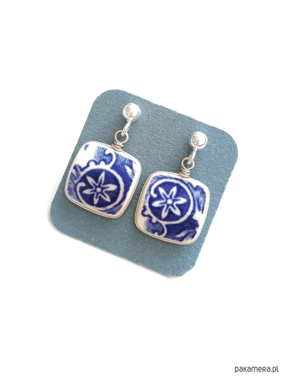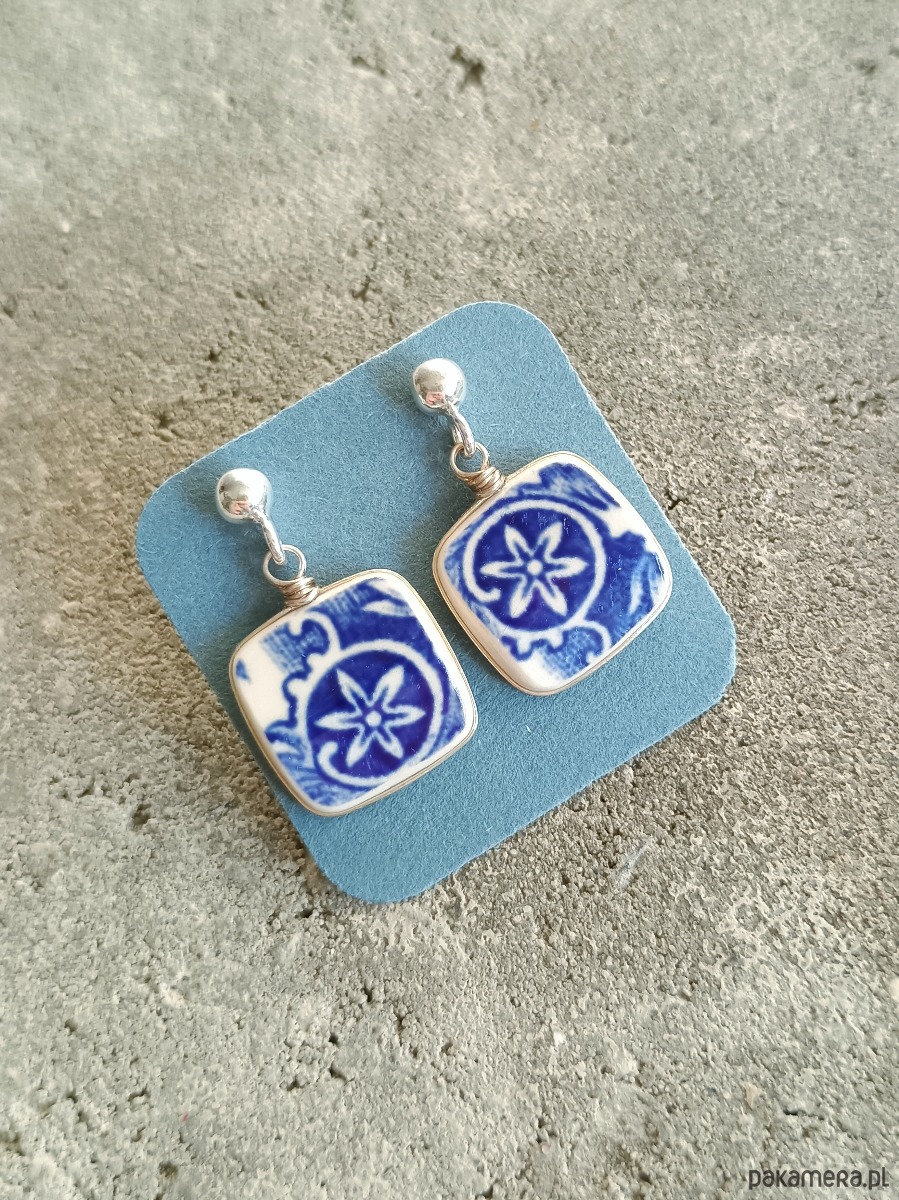 Nieduże wiszące kolczyki, które wykonałam z fragmentów stłuczonego talerza Villeroy & Boch w kobaltowe motywy roślinne. Kawałki stłuczki oszlifowałam w kwadratowe kształty, oprawiłam w drucik i połączyłam ze srebrnymi sztyftami. Porcelanę zeszlifowałam również z grubości - jest cieńsza niż pierwotnie, dzięki czemu kolczyki nie są masywne. Brzegi i tył pokryłam lakierem, co sprawia, że nie brudzą się i nie chłoną wilgoci. Sztyfty, baranki oraz oprawa wykonane są ze srebra próby 925 - wyrób jest antyalergiczny. Wymiary elementów ceramicznych: 14 x 14 mm. Waga jednego kolczyka: 1,4 g. Unikat - każdy z moich wyrobów występuje w jednym egzemplarzu. Upcykling - nie reprodukuję wykorzystywanych wzorów, niczego nie domalowuję - wykorzystuję wyłącznie oryginalne naczynia i motywy, które się na nich znajdują. Tym samym, stłuczce z odzysku nadaję nowe życie.